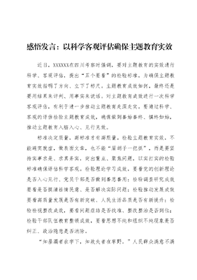 感悟发言:以科学客观评估确保主题教育实效近日,XXXXXX在四川考察时强调,要对主题教育的实效进行科学、客观评估,提出五个要看的检验标准,为确保主题教育实效指明了方向、立下了标尺。主题教育成效如何,最终还是要用结果来评判、用事实来说话。对主题教育成效进行一次科学客观评估,有利于进一步推动主题教育走深走实。要通过科学、客观的评估检验主题教育成效,确保做到善始善终、慎终如始,推动主题教育入脑入心、见行见效。标准决定质量,高标准才有高质量。检验主题教育实效,不能避实就虚,做表面文章,也不能眉胡子一把抓,而是要坚持实事求是、求真务实,突出重点、聚焦问题,以实打实的检验标准确保评估科学客观。检验理论学习成效,要看党的创新理论是否入心见行、党员干部是否做到善思善用;检验调查研究成效要看是否摸清社情民意、是否解决实际问题;检验推动发展成效要看高质量发展是否有新突破、人民生活品质是否有新提升;检验检视整改成效,要看问题症结是否找准、整改整治是否到位;检验干部队伍教育整顿成效,要看思想不纯和组织不纯现象是否纠正、政治隐患是否消除。知屋漏者在宇下,知政失者在草野。人民群众满意不满意,是评判主题教育成效的根本标准。在这次主题教育中,XXX新时代中国特色社会主义思想掌握运用得怎么样、调查研究成果转化得怎么样、群众急难愁盼问题解决得怎么样,群众感受最直接,也最有评判权。要开门抓评估,坚持真开门、开大门,采取个别访谈、召开座谈会、实地调研等方式,认真倾听群众呼声,积极回应群众关切,广泛听取群众对主题教育的评价。要把主题教育成效评估置于群众和社会监督之下,确保真改实改、改到位避免自说自话、自弹自唱,决不能用自我感觉代替群众评价让人民群众真真切切感受到主题教育带来的新变化新面貌。开好专题民主生活会和组织生活会,是一次政治体检,也是检验主题教育成效的一项重要内容。要对照理论学习、政治素质能力本领、担当作为、工作作风、廉洁自律等6个方面突出问题,特别是对照XXXXXX关于以学铸魂、以学增智、以学正风、以学促干的12条具体要求,对标对表XXX新时代中国特色社会主义思想和党中央重大决策部署,系统梳理调研发现的问题、推动发展遇到的问题、群众反映强烈的问题,结合巡视巡察、审计监督发现的问题,形成全面、准确、具体、针对性强的问题清单。要把自己摆进去、把职责摆进去、把工作摆进去,对照检视出来的问题,结合学查改开展批评和自我批评,从政治、思想、能力、作风、纪律等方面进行党性分析,找准灵魂深处的病根。开展批评要真刀真枪、动真碰硬,勇于解剖自己、揭短亮丑,见人见事见思想相互批评要真点问题、点真问题,达到红脸出汗、排毒治病的效果。对检视发现的问题,一项一项制定整改措施,能改的马上改一时解决不了的,要盯住不放、持续整改,确保整改到位,防止久拖不决、整而不改。评估主题教育成效,很重要的一个方面是看形式主义、官僚主义是否得到有效解决。形式主义、官僚主义,是党和人民事业的大敌,也是这次主题教育要重点检视整改的问题。作风建设是攻坚战,也是持久战,具有顽固性、反复性、隐蔽性,必须坚持精准施策、靶向治疗,久久为功、驰而不息,以风清气正促进心齐事成。要对形式主义、官僚主义的东西来一次检视,看看这次主题教育有没有搞形式主义,搞形式化、套路化、表面化那一套,看看基层负担有无减轻。要从思想认识和利益根源上破解,找准党性信念上的深层原因,坚决纠正背后的政绩观异化、权力观扭曲、事业观偏差等问题。要紧紧盯住形式主义、官僚主义老问题、新表现,以抓铁有痕、踏石留印的劲头严抓不放、常抓不懈,做到对症下药。要在制定政策、部署任务、督促落实、考核检查等方面,以健全长效机制来坚决防止形式主义、官僚主义反弹回潮,切实改出实效。