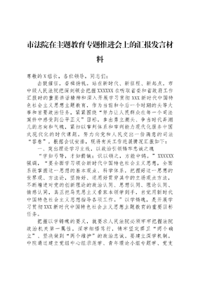 市法院在主题教育专题推进会上的汇报发言材料尊敬的X组长,各位领导,同志们;击鼓催征,奋楫扬帆。站在新时代、新征程、新起点,市中级人民法院把深刻领会把握XXXXXX在听取省委和省政府工作汇报时的重要讲话精神和深入开展学习贯彻XXX新时代中国特色社会主义思想主题教育,作为当前和今后一个时期的头等大事和首要政治任务,紧紧围绕努力让人民群众在每一个司法案件中感受到公平正义目标,拿出勇立潮头、争当时代弄潮儿的志向和气魄,紧扣以审判体系和审判能力现代化服务中国式现代化的时代课题,努力向党和人民交出一份满意的司法答卷。根据会议安排,现将有关工作进展情况汇报如下:一、突出理论学习主线,以政治引领铸牢忠诚之魂学如弓弩,才如箭镞;识以领之,方能中鹄。XXXXXX强调,要全面学习领会新时代中国特色社会主义思想,全面系统掌握这一思想的基本观点、科学体系,把握好这一思想的世界观、方法论,坚持好、运用好贯穿其中的立场观点方法,不断增进对党的创新理论的政治认同、思想认同、理论认同、情感认同,真正把马克思主义看家本领学到手,自觉用新时代中国特色社会主义思想指导各项工作。以学铸魂,是开展学习贯彻XXX新时代中国特色社会主义思想主题教育的重要目标任务。把握以学铸魂的要义,就要求人民法院必须牢牢把握法院政治机关第一属性,深学细悟笃行,铸牢坚定捍卫两个确立、坚决做到两个维护的政治忠诚。要建立深学机制。中院通过建立党组中心组示范学、青年理论小组专题学、党支部集中学等长效机制,把XXX新时代中国特色社会主义思想和XXXXXX历次来陕考察重要讲话重要指示精神贯通学习、一体落实,切实做到筑牢信仰之基、补足精神之钙、把稳思想之舵。要建立细悟机制。推进学习贯彻XXX新时代中国特色社会主义思想主题教育走心走深走实,开展三会一课、主题党日、政治生日等活动,引导广大干警结合自身岗位,努力在以学铸魂、以学增智、以学正风、以学促干方面取得扎实成效。要建立笃行机制。发挥好党组把方向、管大局、保落实的作用,以全面从严治党为抓手,把中院在服务保障中国—中亚峰会期间优良工作作风、经验做法转化为行之有效的常态化工作机制,围绕省高质量项目推进年、营商环境突破年、干部作风能力提升年三个年活动和市八个方面重点工作,找准找实服务保障经济社会发展大局的结合点、着力点。二、落实重大战略部署,以能动司法投身法治建设中院要牢固树立法治是最好的营商环境理念,扎实履行维护社会公平正义的最后一道防线的神圣职责,坚决扛起维护国家安全、社会安定、人民安宁的重大责任。促进主题教育见行见效,就要在重实践、建新功上下功夫、做文章,把助力高质量发展作为人民法院的时代使命,把服务大局作为抓实公正与效率的实践场域。要精准服务发展大局。全面对标落实必须在加强科技创新、建设现代化产业体系上取得新突破重要要求,深刻认识保护知识产权就是保护创新,推动建立双中心司法保护基地西咸新区司法融合示范区,积极发挥秦创原知识产权巡回审判庭作用,加大关键核心技术、高科技产业、新兴产业知识产权司法保护力度,支持国家中心城市、综合性国家科学中心和科技创新中心建设,为国家高水平科技自立自强提供有力司法服务和保障。要全力推动绿色发展。全面对标落实要着力推动发展方式绿色低碳转型,提升生态文明建设水平重要要求,把环境资源审判工作融入国家环境治理体系,最大限度发挥司法对生态环境的保护功能,自觉当好秦岭生态卫士。要依法保护市场主体。努力满足涉企纠纷特别是涉民营企业纠纷多元化解、快速化解、有效化解的实际需求,积极运用司法手段推动破解民营企业急难愁盼问题,以能动司法保安全、稳预期、提信心、促增长。要加强文物司法保护。举司法之力守护好文物保护利用和文化遗产传承,依法妥善审理涉文物案件,铸严铸实维护文物安全铜墙铁壁。要筑牢安全发展底线。统筹好发展和安全两件大事,把牢案件质量生命线,把审执工作主动融入国家治理和社会治理,为经济社会发展创造安全稳定的社会环境。三、聚焦人民群众期盼,以优化供给深化诉源治理听讼,吾犹人也,必也使无讼乎。XXXXXX强调:要推动更多法治力量向引导和疏导端用力,完善预防性法律制度,坚持和发展新时代枫桥经验,完善社会矛盾纠纷多元预防调处化解综合机制,更加重视基层基础工作,充分发挥共建共治共享在基层的作用,推进市域社会治理现代化,促进社会和谐稳定。中院扎实推动主题教育成效转化,立足本地实际,因地制宜探索诉源治理新模式,因势利导助力社会治理现代化,推动完善源头预防为先、非诉机制挺前、法院裁判终局的多元共治、分层递进解纷新格局,让人民群众切实感受到司法温度。要两端用力。即推动更多法治力量向引导和疏导端用力。主动加强与政府职能部门、群众自治组织、行业调解组织等的沟通协作,形