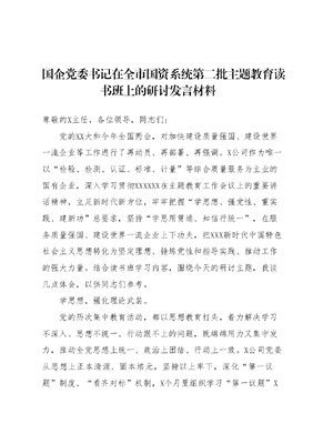 国企党委书记在全市国资系统第二批主题教育读书班上的研讨发言材料尊敬的X主任,各位领导,同志们:党的XX大和今年全国两会,对加快建设质量强国、建设世界一流企业等工作进行了再动员、再部署、再强调。X公司作为唯一以检验、检测、认证、标准、计量等综合质量服务为主业的国有企业,深入学习贯彻XXXXXX在主题教育工作会议上的重要讲话精神,立足新时代新方位,牢牢把握学思想、强党性、重实践、建新功总要求,坚持学思用贯通、知信行统一,在服务质量强国、建设世界一流企业上下功夫,把XXX新时代中国特色社会主义思想转化为坚定理想、锤炼党性和指导实践、推动工作的强大力量。结合读书班学习内容,围绕今天的研讨主题,我谈几点体会,以供同志们参考。学思想,强化理论武装。党的历次集中教育活动,都以思想教育打头,着力解决学习不深入、思想不统一、行动跟不上的问题,既绵绵用力又集中发力,推动全党思想上统一、政治上团结、行动上一致。X公司党委从思想上正本清源、固本培元,坚持以上率下,深化第一议题制度、看齐对标机制,X个月里组织学习第一议题X次、党委理论中心组学习X次,坚持从党的创新理论中找方向、找思路、找方法。党委班子成员带头学,举办X期主题教育读书班和中检大讲堂,带头深入研读X种学习材料,学习领会XXXXXX在全国国有企业党的建设工作会议上的重要讲话和关于加快建设质量强国的重要论述,做到读原著、学原文、悟原理,原原本本学、逐字逐句学、联系实际学。党委班子成员带头讲,深入一线宣讲党的XX大精神,引导集团全体干部职工把思想和行动统一到党的XX大精神上来,把智慧和力量凝聚到党的XX大提出的目标任务上来推动党的XX大精神在基层一线落地生根。同时,精心制定主题教育方案、调研方案,成立领导小组和工作机构,组建X个巡回指导组,明确任务书、路线图、时间表,组织第一批开展主题教育的集团公司及X家成员企业落实学习、宣讲、培训等一系列活动,班子成员按分工领学、促学、督学,做到集中宣讲二级单位全覆盖培训轮训三级班子全覆盖、学习活动全员全覆盖。强党性,锤炼政治品格。党性是党员干部立身、立业、立言、立德的基石。党性教育是共产党人修身养性的必修课,也是共产党人的心学。X公司党委始终坚持把坚定拥护两个确立、坚决做到两个维护作为集团最根本的政治原则、最坚定的政治立场、最牢固的政治信念、最根本的政治规矩。始终坚持党委履行全面从严治党主体责任,出台全面从严治党责任清单,制定基层党建联系点机制,以党章为根本遵循,以三会一课、主题党日等为重要载体,以严格的党内政治生活持续淬炼忠诚品格。始终坚持大抓基层的鲜明导向,全面落实国有企业基层组织、书记、党员、活动、制度、培训、保障七抓工程,巩固标准化规范化建设成果,织密建强集团组织体系。始终坚持把政治标准作为集团选人用人的首位,旗帜鲜明选用忠诚于党和人民、坚定理想信念、全面贯彻执行党的理论和路线方针政策的好干部。始终坚持问题导向,做好巡视后半篇文章,针对存在问题制定整改措施X项,完成X项,整改完成率达X%。重实践,服务质量强国建设。今年全国两会期间,XXXXXX强调,大力增强质量意识,视质量为生命,以高质量为追求。X公司作为质量服务行业的国家队和服务质量强国战略的主力军,始终紧扣高质量发展主题,心怀国之大者,为建设现代化产业体系、加快构建新发展格局、服务国家战略贡献力量。在标准制定上,X公司作为ISO(国际标准化组织)、IEC(国际电工委员会)、IQNET(国际认证联盟)、TIC理事会(国际检验检测认证理事会)等X个国际标准化或专业组织成员,加入各类国家标准化技术委员会X个,承担多项重要工作或关键职务,近年主导和参与制定修订国际、国内标准X余项,其中国际标准X项,国家标准X项。在服务贸易上,年检验输华煤炭、铁矿、镍矿和石油化工等能源资源产品约X亿吨,大豆玉米、大米等粮食产品和鱼类、肉类产品约X万吨,有力保障了国家进口战略物资的质量安全。在技术支撑上,构建国家级平台省部级平台、企业级实验室三级科技创新平台体系,拥有国家重点实验室等国家级研发平台X个,国家质量检验检测中心等国家级检验检测平台X个,省部级科技平台X个,企业级实验室X个。在质量提升上,积极参与区域品牌建设,助力地方政府建立上海品牌食安安徽X绿色生态吉致吉品等X余个区域品牌认证制度。按照党中央、国务院关于开展质量提升行动部署,为全国X个行业近万家中小微企业引入先进质量管理方法。在绿色低碳上,为我国碳市场和自愿减排项目MRV制度的设计提供专业支撑,参与发电、钢铁、建材等X个行业重点排放单位碳核查或复查工作,服务累计近万家次。参与CDM(清洁发展机制)、CCER(国家核证自愿减排量)审定与核证项目达X余项,CER(碳减排量)达到X亿吨、CC