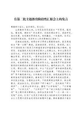 在第二批主题教育阶段性汇报会上的发言尊敬的X组长,各位领导,同志们:主题教育开展以来,X市民政局党组紧扣学思想、强党性、重实践、建新功的总要求,坚持把理论学习、调查研究、推动发展、检视整改贯通起来,有机融合、一体推进,各项工作取得明显成效。现将有关工作进展情况汇报如下:坚持政治统领,将理论学习贯穿主题教育始终。抓实局党组会第一议题制度,坚持读原著、学原文、悟原理,深入学习XXXXXX关于民政工作的重要讲话和重要指示批示精神,局领导、局直属机关党支部书记累计上党课X次,举办主题党日活动X次,评选发布青年优秀微党课X个,真正做到学深悟透融会贯通、真信笃行。一是学出坚定信仰。坚持用科学理论武装头脑、指导实践,通过党组带头学、中心组集中学、支部跟进学、专家辅导学、沉浸体验学等方式,推动党员干部深刻领悟党的创新理论的真理力量和实践伟力,增进政治认同、思想认同、理论认同、情感认同。举办迎五四青年榜样思政课,开展学习贯彻党的XX大精神知识抢答赛、理论活水润心田青年微党课评比,在秋收起义纪念馆、谢觉哉故居等红色教育基地开展现场教学,教育党员干部凡事多考虑政治因素、讲求政治效益、估量政治后果,不断提高政治判断力、政治领悟力、政治执行力,坚定拥护两个确立、坚决做到两个维护。二是学出科学方法。围绕以学铸魂、以学增智、以学正风、以学促干和树立和践行正确政绩观等主题开展专题研讨,指导各支部开展一月一课一片一实践活动。引导广大党员干部自觉从XXX新时代中国特色社会主义思想中汲取奋发进取的智慧和力量,熟练掌握其中蕴含的领导方法、思想方法、工作方法,不断提高履职尽责的能力和水平,驰而不息抓落实,立足岗位作贡献。三是学出民本情怀。践行人民至上理念,深刻领悟XXX新时代中国特色社会主义思想中蕴含的民本理念,牢固树立和践行正确政绩观,把开展主题教育同推进民政业务工作结合起来,同解决群众急难愁盼问题结合起来,既做让人民群众看得见、摸得着、得实惠的好事,也做打基础、利长远、促发展的实事,不断增强人民群众获得感、幸福感、安全感。坚持走找想促,将调查研究贯穿主题教育始终。认真对照主题教育要求,扎实开展走基层、找问题、想办法、促发展活动,深入基层找问题寻对策,累计查找问题X个。一是找准靶心选题。对照中央明确的调研内容和市委梳理的调研事项,紧盯群众关注的民政领域急难愁盼问题、长期制约民政事业发展的老大难问题,制定调研方案,发布X方面重点领域和X项调研课题指导目录,找准调研目标方向和重点任务,实现民政业务全覆盖调研。二是领导带头领题。局领导领衔X殡葬工作的现状、存在的堵点问题及今后推进的路径探索等X项重点调研课题,各处室单位承担社会救助效能提升、农村养老服务体系建设情况等具体调研课题,加强与相关市直职能部门联动、市县民政部门协同,多层级、多领域合力探析新时代民政事业高质量发展之道。三是深度解剖破题。局机关结合健全常态化检查民政服务机构安全生产工作机制,先后深入X个基层单位开展四不两直调研,累计走访党员群众X多人,建立调研成果转化运用清单,形成高质量调研报告X份。召开走基层、找问题、想办法、促发展活动调研情况交流会,与市委主题教育第九巡回指导组共同开展计划生育特殊家庭、农村公益性墓地调查研究,同题共答,提高解决问题的实效。对儿童福利、养老服务、殡葬改革等X个正反典型案例,开展解剖式调研,提炼总结X个县市经验做法并向全市民政系统推广。坚持成果转化,将推动发展贯穿主题教育始终。坚持贯彻新发展理念,从XXX新时代中国特色社会主义思想中找方向、找方法、找思路、找遵循,努力将主题教育成果转化为推动民政事业高质量发展的强大动力。一是转化为民政事业发展举措。全力提升城乡低保、残疾人两项补贴、孤儿和事实无人抚养儿童基本生活保障标准,覆盖各类困难群众X万人。在全市实施为民解忧办实事民生项目,部署开展兜底解忧暖民心、婚姻登记服务水平提升、儿童福利机构质量提升、社会组织助力X届高校毕业生就业等X大专项行动,提升民政服务能力。二是转化为信访问题化解措施。学习借鉴浦江经验,建立局领导信访值班月制度,由局领导带头包案,带着X个信访问题开展下访,在解决具体问题中融洽党群干群关系,目前全部化解到位。对主题教育中群众反映突出的社会救助问题,全市民政系统开展困难群众大走访活动,将X.X万人参照单人户纳入低保范围。三是转化为优质基本公共服务。针对主题教育中群众反映的民政公共服务不够便捷等问题,充分运用湘易办超级服务端,推进X项基本社会服务正式入驻民政服务旗舰店,实现婚姻登记、残疾人两项补贴等事项全市通办,推进婚育、身后等业务一件事一次办。加快民政专业化建设,对养老机构等实施空间设计、功能配套