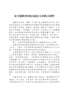 在主题教育经验交流会上的发言材料按照党中央统一部署,X市第一批主题教育单位深入学习贯彻XXXXXX关于主题教育的系列重要讲话和重要指示批示精神,牢牢把握学思想、强党性、重实践、建新功总要求,认真落实以学铸魂、以学增智、以学正风、以学促干X个方面重要要求,把加强党的创新理论武装作为主题教育重中之重,一以贯之抓实党员干部自学,抓好读书班、专题学习、集中研讨、专题党课等,坚持不懈用党的创新理论凝心铸魂,汇聚推动新时代新征程新X建设的强大力量。第一,坚持深学细悟XXX新时代中国特色社会主义思想全面对标全面把握全面落实党中央要求,扎实推动全市广大党员、干部进一步学深悟透XXX新时代中国特色社会主义思想,不断提高改造主观世界和客观世界的能力。全面梳理体系化学习。组织引导党员干部静下心、坐下来,认认真真读原著、学原文、悟原理,通读精读党的XX大报告、党章、《XXX著作选读》、《XXX新时代中国特色社会主义思想专题摘编》等,全面领会XXX新时代中国特色社会主义思想的科学体系、核心要义、实践要求。在此基础上,党员领导干部带头结合职责职能和分管工作,把党的XX大精神、XXXXXX重要讲话和系列重要指示批示精神,以及XXXXXX关于本部门本领域的重要讲话和重要指示批示精神系统梳理出来,汇集形成学习模块、动态更新完善、及时迭代升级,形成理论学习的重要成果。丰富形式深入学。着眼防止学习浅表化,推动理论学习往深里走、往心里走、往实里走,精心设计集中研讨交流形式,市级领导班子和X个市管单位在确定理论学习中心组专题研讨、调研成果集中交流等方案时,提出以PPT形式脱稿交流,促使领导班子成员提前下足功夫、备好功课,领会深、领会透这一重要思想的世界观、方法论和贯穿其中的立场观点方法。大力加强党性教育,七一前后,各级党组织就近就便用好X丰富的红色教育资源和党性教育基地开展学习,弘扬伟大建党精神,传承红岩精神,赓续红色血脉。X余名处级以上党员领导干部结合学习体会、调研感悟和实际工作讲专题党课,以讲带学、以讲促学。引导带动全社会学习,组织实施党的创新理论学习教育计划,持续深化党课开讲啦学习身边榜样等活动,用好千媒万屏首页首屏进圈入群等形式,让党的创新理论飞入寻常百姓家。及时跟进持续学。在领导班子分别举办不少于X天读书班的基础上,区别不同对象,有针对性地抓好常态化学习。市级领导班子和X个市管单位坚持第一议题制度,把每月至少开展一次理论学习中心组学习研讨作为固定动作,XXXXXX每次发表的重要讲话、作出的重要指示批示,都纳入学习台账、跟进安排,做到学习跟进、认识跟进、行动跟进。各基层党支部把XXXXXX最新重要讲话和文章作为必学内容,把长江经济带高质量发展的成功实践案例、浙江千万工程经验案例等纳入学习安排,依托三会一课、主题党日等组织党员认真学、用心悟,深刻感悟党的创新理论的真理力量和实践伟力。第二,把XXX新时代中国特色社会主义思想转化为坚定理想、锤炼党性和指导实践、推动工作的强大力量主题教育中全市广大党员干部自觉用XXX新时代中国特色社会主义思想武装头脑、指导实践、推动工作,在凝心铸魂筑牢根本、锤炼品格强化忠诚、实干担当促进发展、践行宗旨为民造福、廉洁奉公树立新风等方面取得实实在在成效。全市政治生态持续向上向好,拥护两个确立、做到两个维护更加坚定自觉。通过主题教育,广大党员干部经受政治体检,进一步锤炼了忠诚干净担当的政治品格,提高了政治判断力、政治领悟力、政治执行力,加深了对两个确立决定性意义的领悟,增强了做到两个维护的自觉性和坚定性,自觉在政治立场、政治方向、政治原则、政治道路上同以XXX同志为核心的党中央保持高度一致。进一步健全了XXXXXX重要指示批示和党中央重大决策部署闭环落实机制,形成严密贯彻落实的工作闭环,做到XXX有号令、党中央有部署,X见行动。XXX新时代中国特色社会主义思想更加入脑入心,党员干部理论水平明显提升。通过主题教育,广大党员干部从思想上正本清源、固本培元,进一步加深了对XXX新时代中国特色社会主义思想基本观点、科学体系和世界观、方法论的理解领悟,在理论上补了课、精神上补了钙。进一步完善了体系化、模块化、长效化的理论学习标志性成果,结合各自职责任务,切实把XXXXXX关于分管领域的思想要义梳理提炼出来、表达呈现出来,形成自己的知识体系、工作模块和价值判断,提高知信行合一能力。党的XX大精神贯彻落实不断走深走实,高质量发展之路越走越宽广。通过主题教育,广大党员干部紧紧围绕高质量发展这个全面建设社会主义现代化国家的首要任务,把学习和调研落实到完成党的XX大部署上,把本地区本部门本单位工作融入新发展格局,敢于斗争、勇于负责,聚焦问题、知难而进,加快形成一批有X辨识度、全国影响力的标志性成