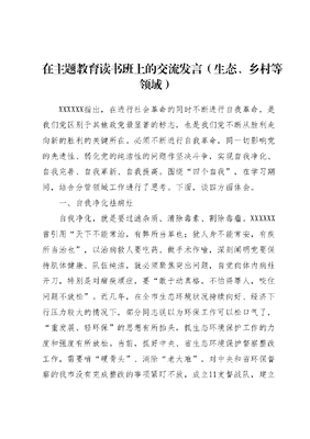 在主题教育读书班上的交流发言(生态、乡村等领域)XXXXXX指出,在进行社会革命的同时不断进行自我革命,是我们党区别于其他政党最显著的标志,也是我们党不断从胜利走向新的胜利的关键所在。必须不断进行自我革命,同一切影响党的先进性、弱化党的纯洁性的问题作坚决斗争,实现自我净化、自我完善、自我革新、自我提高。围绕四个自我,在学习期间,结合分管领域工作进行了思考。下面,谈四方面体会。一、自我净化祛病灶自我净化,就是要过滤杂质、清除毒素、割除毒瘤。XXXXXX曾引用天下不能常治,有弊所当革也;犹人身不能常安,有疾所当治也,以治病救人要吃药、做手术作喻,深刻阐明党要保持肌体健康、队伍纯洁,就必须聚焦突出问题,自觉向体内病灶开刀,特别是对痼疾顽症,要敢于动真格,不怕得罪人,咬住问题不放松。近几年,在全市生态环境状况持续向好、经济下行压力较大的情况下,部分同志误以为环保工作可以松口气了,重发展、轻环保的思想有所抬头,抓生态环境保护工作的力度和强度有所放松。当前,抓好中央、省生态环境保护督察整改工作,需要啃硬骨头、消除老大难,对中央和省环保督察的我市没有完成整改的事项紧盯不放,成立11支督战队,建立健全清单化调度制度、验收销号制度、督办人制度等,压紧整改责任、严肃整改纪律、强化整改实效,推动解决一批长期难以解决的历史遗留环境问题,进一步压实各级各部门生态环境保护的主体责任。二、自我完善补短板自我完善,就是要修复肌体、健全机制、丰富功能。XXXXXX形象地指出,蚁穴不填,终将溃堤,就像人身子弱了就要补免疫力下降就要加强一样,我们党也要着力补短板、强弱项、固根本,提升党的领导水平和长期执政能力。作为资源性缺水城市水资源总量少、开发利用难度高是青岛的基本水情。可以说,官路水库工程项目建设事关青岛长远发展,是全省新建的最大平原水库,已列入全省重点建设项目清单。面对这种重大战略性基础设施工程,绝不能有等靠要的思想,也不能用常规工作方式推进项目建设。要坚持工作项目化、项目清单化、清单责任化、责任考核化,倒排工期,严格按时间节点推进。同时,超前启动谋划官路水库建设的后半篇文章,积极争取国家和省增加青岛市客水供水指标;制定官路水库输配水工程规划方案,确保输配水工程同步投入使用,加速构建全市大水网格局。三、自我革新求突破自我革新,就是要与时俱进、自我超越。绳短不能汲深井浅水难以负大舟。XXXXXX反复告诫全党,世情国情党情的变化复杂深刻,如果故步自封、抱残守缺,啃老本、守旧摊子,是极其危险的。改革是我们党最鲜明的特色,创新是我们党保持生机活力的源泉。当前,与建设国际化大都市目标相比,乡村仍是短板,城乡融合仍然是弱项,乡村振兴齐鲁样板片区特色特质不突出,城乡融合发展的体制机制和政策体系还未根本建立。下步,要聚焦制约乡村振兴的痛点堵点难点,持续用力高质量建设10个市级、36个区市级乡村振兴示范片区,实现系统性整体性协同性推进,以点带面推动乡村振兴齐鲁样板打造取得新成效。农村人居环境整治提升是实施乡村振兴的第一场硬仗。要用城乡融合发展的办法破解垃圾围村问题,全力推进城乡环卫一体化改革出台改革方案,实现一把扫帚扫全城,一把尺子量到底,打造干净整洁有序美丽人居环境。四、自我提高强本领自我提高,就是要有新本领、有新境界,永不僵化、永不停滞。软肩膀挑不起硬担子。XXXXXX多次强调,能力不是一劳永逸、一蹴而就的,必须坚持在学习实践中砥砺品格、增长才干全面增强执政本领。要坚决扛起走在前、开新局的光荣使命进一步提高站位、增强本领,放宽眼界、放大格局,主动融入全国全省大局,切实抓好西海岸全国首批、全省首个气候投融资国家级试点。同时,大力开展供销社农业社会化服务,发挥联合合作职能优势,吸引大型农业经营主体入社发展,推动联合社和社有企业下沉,提升为农服务的能力水平,积极探索供销促共富的青岛经验。自知者英,自胜者雄。事实证明,只要我们始终不忘党的性质宗旨,勇于直面自身存在的问题,以刮骨疗毒的决心和意志消除一切损害党的先进性和纯洁性的因素,就能够形成党长期执政条件下实现四个自我的有效途径。