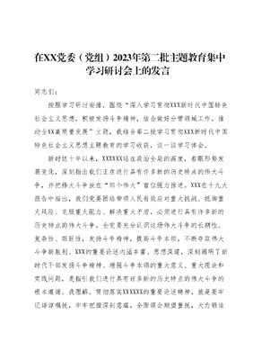 在XX党委(党组)2023年第二批主题教育集中学习研讨会上的发言同志们:按照学习研讨安排,围绕深入学习贯彻XXX新时代中国特色社会主义思想,积极发扬斗争精神,结合做好分管领域工作,推动全XX高质量发展主题,我结合第二批学习贯彻XXX新时代中国特色社会主义思想主题教育的学习收获,谈一谈学习体会。新时达十年以来,XXXXXX站在政治全局的高度,着眼形势发展变化,深刻指出我们正在进行具有许多新的历史特点的伟大斗争,并把伟大斗争放在四个伟大首位强力推进。XXX在十九大报告中指出,我们党要团结带领人民有效应对重大挑战、抵御重大风险、克服重大阻力、解决重大矛盾,必须进行具有许多新的历史特点的伟大斗争。全党要充分认识这场伟大斗争的长期性、复杂性、艰巨性,发扬斗争精神,提高斗争本领,不断夺取伟大斗争新胜利。XXX的重要论述内涵丰富、思想深邃,深刻阐明了新时代干部发扬斗争精神、增强斗争本领的重大意义、重大理论和实践问题,是指引我们进行具有许多新的历史特点的伟大斗争的根本遵循。我理解,贯彻落实XXXXXX的重要论述精神,就是要牢记谆谆嘱托,牢牢把握深刻意蕴,全面领会期望重托,大力锻造共产党人敢于斗争、善于斗争的勇气和魄力。目前,我XX进入全面对接融入XXX建设的关键时期,XX、乡村振兴、生态环保、XX等各项工作正处在克难攻坚、闯关夺隘的重要阶段,前进的道路不可能一帆风顺,必须充分认识推动各项工作的长期性、复杂性、艰巨性。新时代新方位新征程上,我们必须以永远在路上的坚韧和执着,坚决打好反腐败斗争攻坚战、持久战。作为纪委书记、监委主任,身处反腐败斗争第一线,肩负着特殊职责使命,更应发扬斗争精神,自觉投入斗争实践,不断夺取反腐败斗争新胜利,推动全面从严治党取得新的更大成效。第一,深入学习贯彻XXXXXX关于开展主题教育工作的重要论述,必须坚持从理论武装上坚定斗争意志。领导干部如果缺乏基本的理论修养和理论思维,就很难应对和战胜各种风险挑战。保持斗争精神、坚定斗争意志,必须坚持用马克思主义理论,特别是XXX新时代中国特色社会主义思想作理论指引,务必结合主题教育深入学习党的XX大报告、党章、《XXX著作选读》《XXX新时代中国特色社会主义思想专题摘编》等系列书目。要增强政治能力持续学懂弄通做实XXX新时代中国特色社会主义思想,结合工作实际、结合职能职责、结合正在做的事情,读原著、学原文、悟原理,提高政治觉悟,自觉对标对表,努力做到学思用贯通、知信行统一。要保持政治定力,对党绝对忠诚,始终在政治立场、政治方向、政治原则、政治道路上同以XXX同志为核心的党中央保持高度一致,以坚如磐石的意志和抓铁有痕的决心,深入推进党风廉政建设和反腐败斗争。第二,深入学习贯彻XXXXXX关于开展主题教育工作的重要论述,必须坚持在政治担当上坚定斗争意志。坚持在实践中砥砺品格、锻炼意志、积累经验,练就政治慧眼,勇于挺身而出、勇于斗争亮剑,忠诚履行职责使命,增强四个意识、做到两个维护,坚决同一切违背、歪曲、否定党的政治路线的言行作斗争,坚决抵制破坏政治纪律和政治规矩的行为以及形式主义、官僚主义等不良作风,以实际行动带头维护XXXXXX党中央的核心、全党的核心地位,坚决维护党中央的的权威和集中统一领导。第三,深入学习贯彻XXXXXX关于开展主题教育工作的重要论述,必须在对反腐败斗争形势的清醒认识上坚定斗争意志。面对当前反腐败斗争的高压态势,我们取得了压倒性胜利,但还没有取得彻底胜利,反腐败斗争形势依然严峻复杂。具体到我XX,今年XXX月,全XX纪检监察机关受理信访举报XX件次,处置问题线索XX条,同比增长XX。立案XX件XX人,同比增长XX%。说明遏增量减存量任务依然艰巨。形势警醒我们,反腐败零容忍的决心丝毫不能动摇,打击腐败的力度丝毫不能削减,必须始终坚定斗争意志,坚持事不避难、义不逃责,以越是艰险越向前的英雄气概和狭路相逢勇者胜的斗争精神,敢动真碰硬,敢啃硬骨头坚持无禁区、全覆盖、零容忍,坚持重遏制、强高压、长震慑,做反腐败斗争的尖兵利剑。要聚焦XX、XX和生态环保领域的腐败和作风问题,发现一起查处一起、通报曝光一起,着力整治三资管理、征地拆迁等方面侵害群众利益的问题,努力用人民群众的获得感、幸福感、安全感检验反腐败斗争成效。我的发言完毕。谢谢!