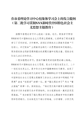 在市委理论学习中心组集体学习会上的发言提纲(第二批学习贯彻XXX新时代中国特色社会主义思想主题教育)按照市委理论学习中心组统一安排,近日,聚焦学习贯彻XXX新时代中国特色社会主义思想主题教育,认真研读了规定篇目学习了系列讲话、文件精神,深刻认识到本次主题教育是继不忘初心、牢记使命主题教育后的又一次思想锤炼和灵魂洗礼,更加深刻体会到新思想所蕴含的真理力量和实践力量。现结合实际谈几点认识和体会。一要加强理论学习,坚持不懈用党的创新理论凝心铸魂。XXX新时代中国特色社会主义思想,是当代中国马克思主义、二十一世纪马克思主义,是中华文化和中国精神的时代精华,实现了马克思主义中国化时代化新的飞跃。XXXXXX在学习贯彻XXX新时代中国特色社会主义思想主题教育工作会议上的讲话中明确把学思想放在总要求的第一位,把强化理论学习列为重点措施的第一条,深刻指出,每次党内集中教育也都坚持把理论学习作为首要任务并贯穿始终,为全党团结统一奠定坚实思想基础。充分彰显了强化理论学习在这次主题教育中的关键作用和引领地位,为全体党员干部以学铸魂、以学增智、以学正风以学促干,推动主题教育走深走实提供了根本遵循、指明了前进方向。我们要进一步强化理论武装,不断筑牢思想根基,增进对XXX新时代中国特色社会主义思想的政治认同、思想认同、理论认同、情感认同,更加深刻领悟两个确立的决定性意义,增强四个意识,坚定四个自信,做到两个维护,不断增强政治判断力、政治领悟力、政治执行力。要深入学习XXX新时代中国特色社会主义思想,切实将这一思想的世界观、方法论和贯穿其中的立场观点方法转化为思想武器,内化于心、外化于行。要全面学习贯彻XXXXXX考察内蒙古重要指示和重要讲话精神,求真务实、真抓实干,为全力完成好XXX交给内蒙古的五大任务,全方位建设模范自治区作出更大贡献。二要坚持人民至上,坚定不移践行初心使命。党的XX大报告提出了六个必须坚持,即:必须坚持人民至上、必须坚持自信自立、必须坚持守正创新、必须坚持问题导向、必须坚持系统观念、必须坚持胸怀天下。这六个必须坚持是XXX新时代中国特色社会主义思想的立场观点方法的重要体现,其中必须坚持人民至上位列第一。今年4月,XXXXXX在广东考察时强调,把人民群众满意不满意作为评判主题教育成效的根本标准。这些重要论述充分彰显了以人民为中心的发展思想,体现了XXX新时代中国特色社会主义思想的根本价值取向。作为党员干部,我们要将人民至上贯穿于履职尽责的全过程,把惠民生的事办实、暖民心的事办细、顺民意的事办好。用心用情用力解决好老年人、儿童、残疾人、低收入及特殊困难群体急难愁盼,把党和政府的关怀与温暖传递给最需要帮助的服务对象,把工作做到群众的心坎上,不断彰显党的根本宗旨和社会主义制度的优越性。坚持群众路线,大兴调查研究之风,围绕加大居家社区养老适老化设施供给、加大困难群体兜底保障力度、提升退役军人服务保障水平等重点民生课题开展解剖麻雀式、蹲点式调研,运用党的创新理论研究新情况、解决新问题、总结新经验,不断增强人民群众的获得感、幸福感、安全感。三要注重实干担当,坚决有力推动高质量发展。实干担当促发展,是学习贯彻XXX新时代中国特色社会主义思想主题教育的具体目标之一。XXXXXX强调,要实干担当促进发展,教育引导广大党员、干部胸怀国之大者,紧紧围绕新时代新征程党的中心任务,真抓实干、务求实效,聚焦问题、知难而进,以时时放心不下的责任感、积极担当作为的精气神为党和人民履好职、尽好责,以新气象新作为推动高质量发展取得新成效,依靠顽强斗争打开事业发展新天地。XXX从新时代新征程党和国家事业发展全局的战略高度,阐明了奋进新征程的目标导向、价值取向、工作原则,为全党实干担当促发展提供了思想指引与行动指南。当前的XXXXX面临着全新的发展机遇,蕴含着巨大潜能,澎湃着强劲活力。这更需要我们不断提高推动高质量发展本领、服务群众本领、防范化解风险本领,敢于斗争、敢于负责。要紧紧抓住分管领域急难险重任务,直面问题,集中力量攻坚克难,不断开创事业发展的新局面。要坚定不移贯彻总体国家安全观,加强边防现代化建设,加快推进XXXXXX,切实维护好边境地区的安全稳定。要守住意识形态主阵地,以本次主题教育活动为契机,督促分管领域开展好干部队伍转作风、强素质专项行动,有效防范各类风险隐患。要强化增量意识,深入挖掘潜力,推动更多企业XXXXX,切实把XXXXX打造成为新增长点。要突出抓好招商引资,加强XXXXX对接合作,抓紧延链补链扩链强链,培育更多新增量,推动产业集聚发展,形成集群规模效应。要聚焦XXXX建设,用好创新平台和科研力量,协同攻关新能源、新材料、智能制造等领域前沿技术,加快推进科技成果转化,为XXXXX高