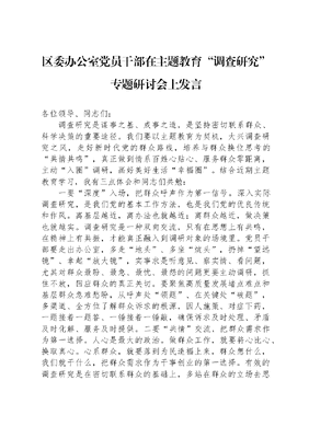 区委办公室党员干部在主题教育调查研究专题研讨会上发言各位领导、同志们:调查研究是谋事之基、成事之道,是坚持密切联系群众、科学决策的重要途径。我们要以主题教育为契机,大兴调查研究之风,走好新时代党的群众路线,培养与群众换位思考的共情共鸣,真正做到情系百姓心贴心、服务群众零距离,主动入圈调研,画好美好生活幸福圈。结合近期主题教育学习,我有三点体会和同志们共勉:一要深度入场,把群众呼声作为第一信号。深入实际调查研究,是我们党的基本工作方法,也是我们党的优良传统和作风。离基层越近,离办法也就越近;离群众越近,做决策也就越实。调查研究是一种双向交流,只有在思想上有共鸣,在精神上有共振,才能真正融入到调研对象的场境里。党员干部要走出办公室,多走地头、多坐炕头,扔掉望远镜、拿起放大镜,实事求是听意见、察实情、看问题,尤其对群众最盼、最急、最忧、最怨的问题更要主动调研,抓住不放,回应群众的真正关切。要聚焦高质量发展堵点难点和基层群众急难愁盼,从呼声处领题、在关键处破题,多渠道、全方位了解群众诉求的根源,因人施策、对症下药,一题接着一题答、一锤接着一锤敲,确保诉求及时处理、矛盾及时化解、服务及时提供。二要共情交流,把群众需求作为第一选择。人心是最大的政治。做群众工作,就要将心比心、换取真心。心系群众,就要落到为民造福上来,群众想什么,我们就干什么,把群众需求作为干事创业的第一选择。有效的调查研究是在密切联系群众的基础上,多站在群众的立场去思考,亲身感受基层人生百态、人情世故、风土人情,增强做好群众工作的责任感和主动性。群众是最好的老师,积极听取群众的意见和建议,虚心接受群众的批评和教诲,不断改进工作方式方法,才能切实为人民群众解决好问题,更好地为群众服务。党员干部要用群众喜闻乐见的语言和工作方式,开展各项工作,真正沉下力、沉下身、沉下心了解群众的民生诉求,问需于民,确保最终选定的项目、推进的工作顺应群众期待、契合群众意愿、满足群众需求。三要多维研判,把群众满意作为第一标准。坚持人民至上原则,把群众观点贯穿调查研究工作始终,深入挖掘群众需要,真实反映群众愿望,着力解决群众诉求,提升群众满意度,最大限度维护和增进人民福祉,是提高调查研究科学性与实效性的根本保障。党员干部要紧盯群众的合理诉求,从群众中来、到群众中去,操真心、真操心,推动解决群众急难愁盼的问题,不当甩手掌柜、不做二传手,用心用情用力做好调查研究的后半篇文章。要以多维角度、多维对象、多维声音相互补充和印证丰富调查内容,深入研究发现问题的根本原因,统筹分析手段,探索运用大数据等信息化手段、提高效率,把握事物的本质和规律,找到解决问题的路径和方法,在调研过程中不断总结经验,优化工作方法,提升自己的工作能力。空谈误国,实干兴邦。我们要绷紧谋事成事之弦,把调查研究作为必修课常修常炼,注重在深度、温度、力度上下功夫,学会在调查研究中提高工作本领,不断提高自己的圈粉能力。我的发言完毕!