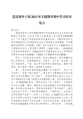 党员领导干部2023年主题教育集中学习研讨发言同志们:按照党委学习贯彻XXX新时代中国特色社会主义思想主题教育工作安排,这次学习研讨主要是深入学习贯彻XXXXXX关于四下基层和政绩观的系列重要论述,不断深化对学习贯彻XXX新时代中国特色社会主义思想的认识和理解,不断增强党性修养和斗争精神。近期,我们系统学习了《XXX新时代中国特色社会主义思想学习纲要》(2023年版)、XXXXXX《论党的自我革命》《XXX新时代中国特色社会主义思想的世界观和方法论专题摘编》《XXX关于调查研究论述摘编》。刚才,大家结合各自实际,把自己摆进去、把思想摆进去把工作摆进去、把职责摆进去,谈体会、谈认识、谈打算,达到了预期效果。下面,结合学习思考和大家的发言,围绕政绩观、四下基层要求,我再讲几点意见。第一,更加坚定自觉地做到增强四个意识、坚定四个自信、做到两个维护。通过学习主题教育的系列书目,我们必须切实增强四个意识,自觉在思想上政治上行动上与以XXX同志为核心的党中央保持高度一致,更加自觉向党中央、向XXXXXX看齐。要更加坚定四个自信,中国特色社会主义道路、理论、制度和文化深深植根于中华民族深厚土壤,具有强大的生命力。要更加自觉做到两个维护,我们必须知道任何一个领导集体都要有一个领导核心,没有核心的领导是靠不住的。党的十八大以来,以XXX同志为核心的党中央带领人民进行了具有许多新的历史特点的伟大斗争,党和国家事业取得了历史性成就、发生历史性变革,使我们更加感受到XXXXXX不愧为我们党的核心、军队统帅、人民领袖,更加感受到党的光荣伟大,更加感受到以XXX同志为核心的党中央治国理政的高超艺术,我们要切实提高政治站位,坚决忠诚核心、拥戴核心、维护核心、紧跟核心。第二,要更加坚定自觉地践行党的宗旨,密切党同人民群众的血肉联系。XXXXXX在学习贯彻XXX新时代中国特色社会主义思想主题教育工作会议上提出了具体要求,其中一个就是保持党同人民群众血肉联系。开展这次主题教育,就是要我们自觉践行党的根本宗旨,密切联系群众,筑牢党长期执政最可靠的阶级基础和群众根基。人民是我们党执政的最大底气,是我们共和国的坚实根基,是我们强党兴国的根本所在。我们要深入学习、准确把握以人民为中心的发展思想,使时时事事处处践行党的宗旨观念,更加密切同人民群众的血肉联系,要更加坚定自觉地见贤思齐、无私奉献、接续奋斗,不断提升民生保障和民生供给的质量水平。第三,要更加坚定自觉地增强斗争精神,提高斗争本领。XXXXXX指出,我们正在进行具有许多新的历史特点的伟大斗争。当前,我们正前所未有地接近实现伟大复兴的宏伟目标,也前所未有地接近乡村振兴的目标,我们更应该增强斗争精神,提高斗争本领,把新时代各项工作不断推向前进。要一鼓作气全力推动经济高质量发展;要自觉向重大风险隐患作斗争,坚决打好重大风险防范化解;要自觉向影响党的先进性和纯洁性的行为作斗争,全面加强党的建设。这里强调一下,从党委掌握情况来看,全系统政治生态在持续向好稳中有进的同时,很多问题就像割韭菜,一而再再而三地犯。全系统各级党组织和党员干部要坚持用XXX新时代中国特色社会主义思想武装头脑,学习好党的创新理论,切实增强斗争精神,提高斗争本领。要切实履行全面从严治党主体责任、第一责任人责任和一岗双责,层层传导压力,严格纪律规定,加强执纪监督问责。第四,要更加坚定自觉地埋头苦干,抓具体抓深入。刚才大家在发言中讲得很好,关键就是抓具体抓深入,不具体不深入就是形式主义官僚主义的新表现形式,是非常有害的。要坚持说干就要干,干就要干好,不要耍滑头,不能把说了当干了,把干了当干成了,要用改革的办法来解决问题。同时,也不要挑三拣四、议而不决。有的该决策的不决策,该拍板的不拍板,不会决策、不善于决策、选择性决策。要主动担当、敢于担当。我得发言完毕,谢谢。