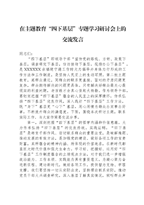 在主题教育四下基层专题学习研讨会上的交流发言同志们:四下基层即领导干部宣传党的路线、方针、政策下基层,调查研究下基层,信访接待下基层,现场办公下基层,是XXXXXX在福建宁德工作时大力倡导并身体力行形成的工作方法和工作制度,是坚持人民至上的生动写照。第二批主题教育,离群众最近,同群众的联系更直接,面对的矛盾问题更复杂,群众期待解决的问题更具体。只有解决好群众最关心最现实的利益问题,老百姓才会真心竖起大拇指。作为领导干部,要切实把握四下基层蕴含的人民至上的深厚情怀,传承弘扬四下基层优良作风,深入践行四下基层工作方法,既身下基层更心下基层,用心用情为群众办实事办好事,不断提升群众的满意度。下面,围绕本次研讨主题,联系实际工作,与大家作简要交流分享。第一,深刻把握四下基层的哲学内涵和价值意蕴,大力传承弘扬四下基层的优良传统。实践证明,四下基层是转变干部作风、密切联系群众的重要法宝,是破解难题、推动发展的有效方法,是加强党的建设、做好各项工作的宝贵财富,其所蕴含的精神内涵、所体现的价值追求,在新时代彰显巨大时代价值和强大生命力。学习好、把握好、运用好四下基层工作制度蕴含的立场观点方法,对于我们进一步增强政治能力、工作本领、实践能力具有重要意义,为凝心聚力奋进新征程、建功新时代,做好各项工作,提供智力支持、学理支撑。我们要坚持一切从实际出发,坚持理论联系实际,推动党员干部大兴调查研究,深入基层了解真实情况,倾听群众声音,汲取各方智慧,找出解决问题、改进工作的思路办法和政策举措。要认真践行以人民为中心的发展思想,坚持在发展中保障和改善民生,用心用情用力解决好人民群众急难愁盼问题,健全基本公共服务体系,提高公共服务水平,增强均衡性和可及性,扎实推进共同富裕,不断提高人民生活品质。要增强问题意识,发扬担当精神和斗争精神,敢于正视问题、善于发现问题,推动领导干部深入基层现场办公、热情接待来访群众,及时研究解决发展所需、改革所急、基层所盼、民心所向的问题,不断开创事业发展新局面。要大兴务实之风、弘扬清廉之风、养成俭朴之风,引导广大党员干部树立正确的政绩观、权力观,力戒形式主义、官僚主义,重实干、求实效,以钉钉子精神把各项工作抓紧抓实抓细抓到位,以好的作风振奋精神、激发斗志、树立形象、赢得民心。要更加自觉地坚持和运用系统观念,前瞻性思考、全局性谋划、整体性推进经济发展、民生改善、风险防范、党的建设等各方面工作,不断增强工作的原则性、系统性、预见性、创造性。第二,传承和弘扬四下基层优良传统,奋力谱写走好新时代党的群众路线新篇章。基层是干事的根基,人民是创业的动力。只有真正了解并把握住基层,才能把握住干事创业的大局、大势和方向,从而拥有能干事的机遇和舞台;只有真正融入并赢得群众,才能赢得干事创业的动力、优势和前途,从而拥有干成事的依靠与力量。作为干事创业、实干兴邦的重要法宝,四下基层蕴含着非凡的实践伟力。只有走入基层、融入百姓,把党之大计同民之大利结合起来,把国之大者和基层之实情协调起来,才能贯彻好党的路线、方针、政策,才能解决好基层群众的急难愁盼问题,把党的全面领导的政治和制度优势体现到为人民群众创造美好生活的各项工作中。只有直接走入人民群众中,当面听取大家意见,才能了解人民群众的急难愁盼;只有深入一线、调查实际情况,现场解决问题,才能以一把钥匙开一把锁的精准举措落实和推动工作,不断打开工作新局面。基层是理论指导实践的主战场,是推进实践创新的主阵地。四下基层源于实践又指导实践,对于我们基层的各项工作来说,都是落实决策部署的最后一环节,开展调查研究下基层也是我们大部分时间都在做的事情。李强总理也提到坐在办公室碰到的都是问题,深入基层看到的全是办法。我们身在基层可以说是深有体会,当我们深入社区和群众之中,才能获取那些在办公室难以听到、不易看到和意想不到的新情况,为我们解决实际问题、做好基层工作提供重要依据。第三,深入学习领会XXXXXX关于调查研究的重要论述精神,不断深化调查研究,推动解决发展难题。调查研究下基层是四下基层的一项重要内容。调查研究不仅是一种工作方法,而且是关系党和人民事业得失成败的大问题。XXXXXX指出:调查研究是谋事之基、成事之道,没有调查就没有发言权,没有调查就没有决策权。正确的决策离不开调查研究,正确的贯彻落实同样也离不开调查研究。党的十八大以来,我们解决了许多长期想解决而没有解决的难题,办成了许多过去想办而没有办成的大事,推动党和国家事业取得历史性成就、发生历史性变革。这同XXXXXX倡导自觉问计于民、问需于民并开展深入细致的调查研究有着密不可分的关系。市县基层是推动发展的主战场、保障民生的主阵地,遇到的矛盾问题会更多更具体。走好新时代四下基层之
