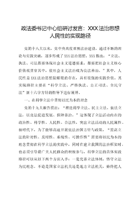 政法委书记中心组研讨发言:XXX法治思想人民性的实现路径党的十八大以来,党中央高度重视法治建设,通过不断的理论与实践突破,逐步形成了XXX法治思想。XXX指出:立法、执法、司法都要体现社会主义道德要求,都要把社会主义核心价值观贯穿其中,使社会主义法治成为良法善治。其中,人民性是XXX法治思想最耀眼的存在,具有很强的实践价值。其实现路径主要在科学立法、严格执法、公正司法、全民守法新十六字方针的指导下进行展开。一、在科学立法中贯彻以民为本的理念党的十九大报告提出:推进科学立法、民主立法、依法立法,以良法促进发展、保障善治。这体现了立法活动内在的政治性、科学性、人民性、合法性,突出立法活动的人民属性。新时代下,为了能够高速开展依法治国方针与政策,提高立法的针对性、及时性、系统性、可操作性需要将以民为本的理念贯彻在科学立法的实践中,同时在建立我国的法治框架时,也必须引导最广大人民群众的积极参与,科学立法的具体实践路径可以从以下两个方面入手:一是完善立法体制,恪守立法为民理念。不论是国家立法机关还是地方立法机关,始终把人民群众的利益放在首位,立法时反映人民呼声,努力使每一项立法都符合宪法精神,反映人民意愿,得到人民拥护。二是健全立法工作机制,体现人民意志。要建立健全立法调研机制,建立完善的沟通机制,建立工作反馈机制,引导社会公众力量多渠道参与立法过程,表达立法意见,为立法工作奠定群众基础。二、在严格执法中牢记为人民服务的宗旨法律的制定仅仅是个开始,最关键的还是执行。法律的生命在于实施,法律的权威来自执行。严格执法是社会主义法治的基本要求之一,是实现司法公正权威的基本前提。严格执法的具体实践路径可以从以下两个方面入手:一是坚持党的领导,确立为民服务宗旨;二是深化行政执法体制改革,提升为民服务效率。XXX同志强调:涉及群众的问题,要准确把握社会心态和群众情绪,充分考虑执法对象的切身感受,规范执法言行,推行人性化执法、柔性执法、阳光执法。深化行政执法体制改革对于政府正确实施法律法规,加快政府职能转变,提高政府治理能力与提升为民服务效率具有重要意义。三、在公正司法中落实人民至上的原则公正司法是人民对法治最强烈的期待,努力让人民群众在每一个司法案件中感受到公平正义是XXX法治思想的庄严承诺。要做到公正司法,确保我国司法工作能够坚持以人民为核心,公正司法的具体实践路径可以从以下两个方面入手:一是保证司法机关独立公正行使权力,满足人民期待;二是深化司法责任制改革,维护人民权益。公平正义是我们党追求的一个非常崇高的价值,全心全意为人民服务的宗旨决定了我们必须追求公平正义,保护人民权益、伸张正义。司法体制改革的一项重要内容就是司法责任制改革,关系到司法公正的权威,有利于维护人民权益,充分体现司法层面坚持人民至上的原则。四、在全民守法中彰显法律面前人人平等的地位法治只有在广大人民守法用法的实践活动中才能得以实现。法治的真谛,在于全体人民的真诚信仰和忠实践行。全民守法是法治社会的基本标志,是依法治国的基础。全民守法的具体实践路径主要是:一要落实全民普法工作,树立法律面前人人平等观念;二要提升领导干部法律素养,践行人人平等理念。XXX指出:领导干部要带头尊法学法守法用法,引导广大群众自觉守法、遇事找法、解决问题靠法。少数关键领导干部起好带头作用,提升自身法律素养,才能带动广大人民群众形成尊法守法用法护法的良好氛围。