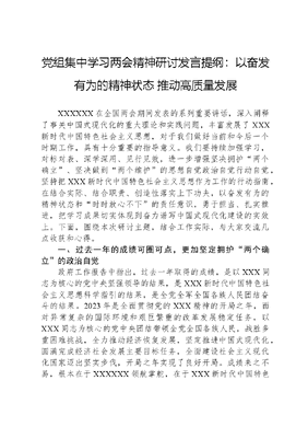 党组集中学习两会精神研讨发言提纲:以奋发有为的精神状态 推动高质量发展XXXXXX在全国两会期间发表的系列重要讲话,深入阐释了事关中国式现代化的重大理论和实践问题,丰富发展了XXX新时代中国特色社会主义思想,对于我们做好当前和今后一个时期工作,具有十分重要的指导意义。我们要持续加强学习,对标对表、深学深用、见行见效,进一步增强坚决拥护两个确立、坚决做到两个维护的思想自觉政治自觉行动自觉,坚持把XXX新时代中国特色社会主义思想作为工作的行动指南,在结合实际、结合职责、创造性落实上下功夫,以奋发有为的精神状态和时时放心不下的责任意识,勇于担当、扎实推进,把学习成果切实体现到奋力谱写中国式现代化建设的实效上。下面,围绕本次研讨主题,结合工作实际,与大家交流几点收获和心得。一、过去一年的成绩可圈可点,更加坚定拥护两个确立的政治自觉政府工作报告中指出,过去一年取得的成绩,是以XXX同志为核心的党中央坚强领导的结果,是XXX新时代中国特色社会主义思想科学指引的结果,是全党全军全国各族人民团结奋斗的结果。2023年是全面贯彻党的XXX精神的开局之年,面对异常复杂的国际环境和艰巨繁重的改革发展稳定任务,以XXX同志为核心的党中央团结带领全党全国各族人民,战胜多重困难挑战,全力推动经济恢复发展,坚定推进中国式现代化,圆满完成经济社会发展主要目标任务,全面建设社会主义现代化国家迈出坚实步伐,开局之年实现了良好开局。成绩来之不易,根本在于XXXXXX领航掌舵,在于XXX新时代中国特色社会主义思想科学指引。实践证明,两个确立是战胜一切艰难险阻、应对一切不确定性的最大确定性、最大底气、最大保证。我们要深刻领悟两个确立的决定性意义,坚决做到两个维护,更好地落实到履职尽责的具体行动上。成绩来之不易,根本在于XXXXXX领航掌舵,在于XXX新时代中国特色社会主义思想科学指引。我们要坚持以XXX新时代中国特色社会主义思想为指导,全面贯彻党的XXX精神,深刻领会全国两会精神,自信自强、开拓创新,锐意进取、顽强拼搏,在新征程上展现新作为,推动高质量发展取得新成效。结合具体工作,一要把两个确立真正转化为坚决做到两个维护的思想自觉。两个确立思想自觉的转化需要筑牢思想根基,就要用XXX新时代中国特色社会主义思想武装头脑。学深悟透XXX新时代中国特色社会主义思想,把对马克思主义的坚定信仰、对中国特色社会主义的坚定信念、对中华民族伟大复兴的坚强信心,转化为实现中华民族伟大复兴的实际行动,确保新时代使命任务的实现。二要把两个确立真正转化为坚决做到两个维护的政治自觉。奋进新征程需要确立航标,我们要紧密团结在以XXX同志为核心的党中央周围,自觉同党中央对标对表。党员干部要强化政治自觉,始终聚焦党的工作大局、服从党和国家发展大局,坚守政治关,站稳政治立场,保持政治清醒和政治定力,把政治纪律和政治规矩落实好,扎实把党中央部署的各项任务落到实处,切实做到在思想上认同核心、在政治上围绕核心、在组织上服从核心、在行动上维护核心。三要把两个确立真正转化为坚决做到两个维护的行动自觉。两个确立行动自觉的转化要切实贯彻执行党中央决策部署,坚决把党的领导落实到党和国家事业各领域各方面各环节,主动担当作为。要立足全面建设社会主义现代化国家的战略布局,做到党中央号召的坚决响应、要求的坚决照办、禁止的坚决不干、部署的坚决落实,确保中央政令畅通无阻,真正做到在思想上、政治上、行动上同以XXX同文可居文库——海量学习资料,手机电脑下载www.wenkeju.com志为核心的党中央保持高度一致。二、坚持以人民为中心的发展思想,出台政策最终落到增进人民福祉这个根本目的上XXXXXX在参加十四届全国人大二次会议XX代表团审议时强调,要坚持以人民为中心的发展思想,在发展中稳步提升民生保障水平,引导激励广大群众依靠自己的双手创造幸福生活。坚持以人民为中心的发展思想集中体现了我们党全心全意为人民服务的根本宗旨,深刻回答了发展为了谁、发展依靠谁、发展成果由谁共享这一根本问题,是XXX新时代中国特色社会主义思想的重要内容。政府工作报告体现了简约、务实、为民的工作思路,坚持把人民的利益放在首位,着力保障和改善民生。今年的政府工作报告提出,切实保障和改善民生,加强和创新社会治理。坚持以人民为中心的发展思想,履行好保基本、兜底线职责,采取更多惠民生、暖民心举措,扎实推进共同富裕,促进社会和谐稳定,不断增强人民群众的获得感、幸福感、安全感。我们要认真贯彻落实两会精神,锚定发展目标,持续强党建、抓经济、优生态、惠民生,全面优化营商环境,深入推进抓党建促乡村振兴,以创新工作思路、务实担当作为,助力现代化建设再上新台阶,取得新成效。XXXXXX深厚的人民情怀和