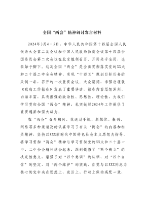 全国两会精神研讨发言材料2024年3月4-5日,中华人民共和国第十四届全国人民代表大会第二次会议和中国人民政治协商会议第十四届全国委员会第二次会议在北京胜利召开。开局关乎全局,远征始于脚下。这次全国两会是全面贯彻落实党的XX大和二十届二中全会精神、实现十四五规划目标任务的关键一年,召开的一次重要会议。大会期间,李强总理就《政府工作报告》发表了重要讲话,报告内容思想深刻、内涵丰富,具有很强的政治性、思想性、理论性,为我们学习贯彻全国两会精神,扎实做好2024年工作提供了重要遵循和强大动力。在两会召开期间,我通过手机、新媒体、报刊、网络等多种渠道及时认真学习了有关两会的内容和相关精神,坚持以XXX新时代中国特色社会主义思想为指导,将学习贯彻两会精神与学习贯彻党的XX大和二十届一中、二中全会精神结合起来,深刻领悟了两个确立的决定性意义,增强了对四个意识的认识、对四个自信的坚定、对两个维护的实践,自觉与以XXX同志为核心的党中央在思想上、政治上、行动上保持高度一致,不断提高政治判断力、政治领悟力、政治执行力,贯彻党的领导贯穿县委、县政府工作各方面全过程,将坚持高质量发展作为新时代的核心原则,将为民造福作为最重要的政绩,努力构建人民满意的法治政府、创新政府、廉洁政府和服务型政府,全面履行政府职责。现结合本人工作实际,为扎实推进我县发展,努力谱写我县现代化建设新篇章,谈几点学习体会。一、把握两会精神,准确把握实践要求。全国两会是我国政治生活的重要盛事,包括全国人民代表大会和中国人民政治协商会议。会议集中讨论国家重要政策、法律法规和民生问题等,对于推进我国社会主义现代化建设具有重要意义。在这次会议中,我们深刻认识到了中国特色社会主义制度的独特优势,也看到了我国面临的机遇和挑战。我们要深入领会全国两会精神的内涵和意义,准确把握其中的核心要义和实践要求,切实将思想和行动统一到党中央的决策部署上。二、践行两会精神,推动经济发展。作为领导干部,我们需要将全国两会精神与实际工作紧密结合,不断推动本地区经济社会发展。首先,要加强学习,提升自身素质。只有具备扎实的理论基础和专业知识,才能更文可居文库——海量学习资料,手机电脑均可下载www.wenkeju.com好地履行职责和使命。其次,要深入调研,了解实际情况只有通过深入基层、深入群众,才能掌握真实情况,提出切实可行的解决方案。最后,要积极作为,根据实际情况和人民群众的需求,积极探索新的发展模式和路径,推动高水平科技自立自强,加大宏观调控力度,统筹新型城镇化和乡村全面振兴,统筹高质量发展和高水平安全,切实增强经济活力、防范化解风险、改善社会预期,巩固和增强经济回升向好态势,持续推动我县经济实现质的有效提升和量的合理增长,不断提高本地区的发展水平和竞争力三、宣传两会精神,深入基层扎根。全国两会是一次盛会的象征,也是一次团结的大会。我们要进一步加强团结协作,共同推进全国两会精神在基层的贯彻落实。首先,要加强沟通协调。在工作中遇到问题和困难时,要及时沟通和协商解决,形成合力推动工作进展其次,要加强相互支持。在工作中取得成绩和进步时,要互相支持和鼓励,共同分享成功的喜悦和经验。最后,要加强团结互助。在生活中遇到困难和问题时,要互相帮助和支持,共同度过难关。总之,两会精神是我们党的重要指导思想之一。作为领导干部,我们要认真学习和贯彻这些精神,不断提高自身素质和能力水平;同时要将这文可居文库——海量学习资料,手机电脑均可下载www.wenkeju.com些精神与实际工作相结合,推动本地区经济社会发展;并加强团结协作共同推进这些精神在基层的贯彻落实。我相信只要我们齐心协力、共同努力,就能为实现中华民族伟大复兴的中国梦贡献自己的力量!文可居文库——海量学习资料,手机电脑均可下载www.wenkeju.com