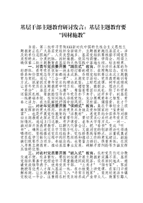 基层干部主题教育研讨发言:基层主题教育要因材施教当前,第二批学习贯彻XXX新时代中国特色社会主义思想主题教育正在广大基层党组织全面铺开。主题教育越往基层走,涉及的单位范围越广、人员类型越多。基层党组织要根据不同党员类型特点,分类把脉、因材施教,使其听得懂、学得会、用得上确保第二批主题教育在基层的火热实践中落地生根、结出硕果。一、对青年党员要开展蹲苗式教育。作为涉世未深的年轻群体,青年党员犹如一块未经打磨的璞石,在理想信念、党性修养和价值观念等方面都尚未成熟。各级党组织要以本次主题教育为契机,通过三会一课、主题党日活动、党员教育轮训等方式,抓紧抓实青年党员的理论武装,上好思政课,树牢政绩观让青年党员在主题教育中明方向、增智慧、敢担当。理论只是养分,基层才是土壤,青苗若要茁壮成长,除了补营养还需深扎根。要鼓励引导青年党员扑下身子、迈开步子,到基层一线磨砺本领、在田间地头淬炼党性,充分展现青年之智慧、青春之活力,在为民解忧纾困中经风雨、见世面,强筋骨、长才干二、对老年党员要开展保姆式教育。虽在干事创业上很难发挥新的更大作用,但老党员本身就是党和国家的宝贵财富,也是开展党性教育的活教材,老党员的全面参与对推动主题教育走深走实具有重要作用。要切实关心关怀老年党员实际情况,通过上门送教、有声课堂、老年大学等方式,一对一、面对面开展教育教学,以聊天代替会议,把看书变成听书,确保让老党员学习既不吃力,又能对党的创新理论吃得透嚼得烂。要根据老党员经验多、党性修养高等特点,注重收集老党员在学习转化过程中的所思所感和推动工作的意见建议,鼓励他们既要尽力而为、奉献余热,也要量力而行、保重身体,在深入开展主题教育、推动基层事业发展、调解矛盾纠纷等方面发挥其独特优势。三、对农村党员要开展嵌入式教育。农村党员住宅分散交通不便、农务繁忙,要按时按质开展主题教育实属不易。基层党组织要善于把理论学习课堂搬进闲庭院落、设在田间地头,邀请党政领导班子、优秀党员干部、土秀才田专家、客座教授等优秀人才深入基层一线,在小板凳上讲党课,在家门口前解难题,让主题教育真正飞入寻常百姓家。要用好用活乡镇党校这一平台,注重将农村党员培养成产业带头人、致富引路人结合本土产业发展情况和群众发展意向,开展有针对性的农业知识推广、农务技能培训,并将XXXXXX关于三农工作、粮食安全等重要论述贯穿其中,让农村党员群众切实做到听党话、感党恩、跟党走,不断树立对未来农村发展的信心与希望。四、对流动党员要开展风筝式教育。要依托全国党员管理信息系统和党内统计数据,准确掌握流动党员基本情况,及时衔接流入地党组织进行有效管理,让流动党员就近就便参加主题教育,确保流动党员离乡不离党、流动不断学。探索建立一对一一对N流动党员联系制度,明确专人对接流动党员,利用线上交流平台,做好流动党员理论学习、就业创业、惠民政策等信息推送打好乡愁感情牌,让流动党员始终心系家乡建设、情系故乡发展做到流动不流失、高飞不断线。流动党员是一面流动的旗帜更是一张行走的名片,要时常督促他们用党章党规严格要求自己,不论何时、不管何地都能主动戴党徽、亮身份、明义务,践行为民初心,牢固树立起一名党员的先锋形象。