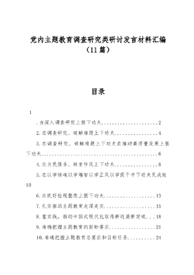 党内主题教育调查研究类研讨发言材料汇编(11篇)目录1.在深入调查研究上狠下功夫22.在调查研究、破解难题上下功夫.43.在调查研究、破解难题上下功夫在推动高质量发展上狠下功夫..64.在为民服务、转变作风上下功夫.85.在以学铸魂以学增智以学正风以学促干中下功夫见成效106.在抓好检视整改上狠下功夫.137.扎实推动主题教育走深走实.158.重实践,推动中国式现代化取得新进展新突破189.准确把握主题教育的目标要求..2110.准确把握主题教育总要求和目标任务.2411.做足调查研究基本功27在深入调查研究上狠下功夫这次主题教育的一个鲜明特色,就是把大兴调查研究作为重要内容。省委主要领导强调,要在深入调查研究上狠下功夫,既带着问题去调研,又通过调研发现问题、解决问题。全省上下要把调查研究贯穿主题教育全过程,坚持认识与实践相结合、理论与实际相联系、改造主观世界与改造客观世界相统一,高标准高质量开展好主题教育。广大党员干部要迈开步子、扑下身子,沉到一线、深入基层,梳理问题、排查难题,运用党的创新理论研究新情况、解决新问题。在调查研究中加深对习近平新时代中国特色社会主义思想的理解,使调查研究的过程成为理论学习向实践运用转化的过程,成为转变作风、增进同群众感情的过程,成为提高履职本领、增强责任担当的过程。问题是时代的声音,任何一项工作,都是在不断解决问题的过程中向前推进的。要带着问题、精心组织专题调研,围绕贯彻落实党中央、省委重大决策部署,通过深入调查研究,进一步把情况摸清、把对策提实,拿出务实管用的思路办法和政策举措,着力推动解决一批长期想解决而没有解决的难题。要深入基层群众调研,多到困难多、群众意见集中、工作打不开局面的地方和单位调研,把问题找精准,扭住不放抓整改,确保问题彻底解决,着力推动解决一批发展所需、改革所急、基层所盼、民心所向的问题。要以扎实作风开展调研,坚持问题导向、结果导向,把握全局和局部、兼顾当前和长远、穿透宏观与微观、分清主要和次要,多采取四不两直等方式开展小切口的大调研、沉下去的深调研、前瞻性的新调研,注重调研成果转化运用,在调查的基础上深化研究,切实把调研成果转化为解决问题、改进工作的实际举措。调查研究是谋事之基、成事之道。自觉践行习近平新时代中国特色社会主义思想,用好调查研究这个传家宝,坚持学思用贯通、知信行统一,不断增强能力本领、提振干事创业精气神,必能不断破解新征程上的全新课题、战胜遭遇的各种艰难险阻、应对经受的风险挑战,以新气象新作为推动xx高质量发展实现新跨越。在调查研究、破解难题上下功夫没有调查,就没有发言权。调查研究是我们党的传家宝和做好各项工作的基本功。在全党大兴调查研究,并将其作为在全党开展的主题教育的重要内容,充分展现了新时代共产党人求真务实、锐意进取的实践品格,必将为新征程开好局起好步提供有力支撑,必将有力推进中国式现代化青海路径探索取得新进展、新突破。这次主题教育不划阶段、不分环节,要把理论学习、调查研究、推动发展、检视整改贯通起来,有机融合、一体推进。我们要按照中共中央办公厅印发的《关于在全党大兴调查研究的工作方案》和省委部署,把学习和调研落实到完成党的二十大部署的各项任务中去,把调查研究的主线聚焦到贯彻落实习近平总书记对青海工作重要讲话和重要指示批示精神中去,认真组织、积极开展大走访、大调研、大排查、大攻坚,直奔问题去、直奔困难去、直奔落实去、直奔服务去,找准推进工作的切入点、解决问题的着力点,抓好调查研究成果转化,解决群众急难愁盼问题和专项整治突出问题,最终以群众满意不满意作为根本评判标准。要以强化理论学习指导发展实践,以深化调查研究推动解决发展难题,以推动高质量发展的新成效检验主题教育成果。推动广大党员、干部特别是各级领导干部扑下身子、沉到一线,深入农村、社区、企业、医院、学校、两新组织等基层单位,把脉问诊、解剖麻雀,进行问题梳理、难题排查,运用党的创新理论研究新情况、解决新问题、总结新经验,使调查研究的过程成为理论学习向实践运用转化的过程,成为转变作风、增进同群众感情的过程,成为提高履职本领、增强责任担当的过程,保证主题教育的高起点、高标准、高质量。要发挥好领导机关和领导干部示范带头作用。各级领导干部要深入实际、深入群众,增强问题意识,真正把情况摸清、把问题找准、把对策提实,引导和推动全省大兴调查研究之风。坚决克服调研中的形式主义、官僚主义,力求用小