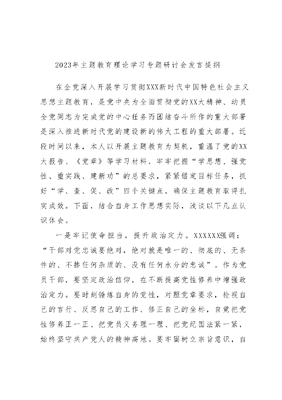 2023年主题教育理论学习专题研讨会发言提纲在全党深入开展学习贯彻XXX新时代中国特色社会主义思想主题教育,是党中央为全面贯彻党的XX大精神、动员全党同志为完成党的中心任务而团结奋斗所作的重大部署是深入推进新时代党的建设新的伟大工程的重大部署。近段时间以来,本人以开展主题教育为契机,重温了党的XX大报告、《党章》等学习材料,牢牢把握学思想、强党性、重实践、建新功的总要求,紧紧锚定目标任务,抓好学、查、促、改四个关键点,确保主题教育取得扎实成效。下面,结合自身工作思想实际,浅谈以下几点认识体会。一是牢记使命担当,提升政治定力。XXXXXX强调:干部对党忠诚要绝对,绝对就是唯一的、彻底的、无条件的、不掺任何杂质的、没有任何水分的忠诚。作为党员干部,要坚定政治信仰,在不断提高党性修养中增强政治定力。要时刻锤炼自身的党性,对照党章要求,检视自己的言行、反思自己的工作、修正自己的坐标,自觉把党性修养正一正、把党员义务理一理、把党纪国法紧一紧,始终坚守共产党人的精神高地。要牢固树立宗旨意识,自觉践行党的群众路线和社会主义核心价值观,多干群众急需的事,多干群众受益的事,多干打基础的事,多干长远起作用的事。要深入群众,加强同人民群众的血肉联系,串串百家门、尝尝百家饭,坐坐长条凳、聊聊家常话放下架子、俯下身子,从内心深处真正把群众当成衣食父母,把自己当成人民的公仆。二是加强学习充电,提升思想引力。理论上的成熟是政治上成熟的基础,政治上的坚定源于理论上的清醒。作为党员干部,要摆正思想,主动融入党的创新理论,深入学习关于坚定理想信念、提升思想境界、加强党性锻炼的一系列要求,包括不忘初心、牢记使命,胸怀国之大者,提高政治判断力、政治领悟力、政治执行力等,始终保持党员干部的政治本色。要促进转化,要把XXX新时代中国特色社会主义思想转化为自身的思想武器,特别是将其世界观、方法论和贯穿其中的立场观点方法融入到贯彻落实党的XX大提出的重大战略部署中去,做到内化于心、外化于行。要善于运用,具备全局视野,运用XXX新时代中国特色社会主义思想观察时代、把握时代、引领时代,以推进中国式现代化不断取得新进展、新突破。要运用这一思想解决经济社会发展中的各种矛盾和问题,防范化解重大风险,以积极担当作为的精气神为党和人民履好职、尽好责。以新气象新作为推动高质量发展取得新成效,依靠顽强斗争打开事业发展新天地。三是坚持修炼自我,提升干事能力。理论的价值在于联系实际,思想的生命力在于推动发展。中国式现代化以实现中华民族伟大复兴为目标指向,既是发展路径,也是奋斗目标。现代化是一个多层面的进程,涉及人类思想和行为所有领域里的变革,发生在政治、经济、社会、文化和生态各个领域。现代化是干出来的,推进中国式现代化没有捷径,只有实干。XXXXXX指出:实干担当促进发展要教育引导广大党员、干部胸怀国之大者,紧紧围绕新时代新征程党的中心任务,真抓实干、务求实效,聚焦问题、知难而进,以时时放心不下的责任感、积极担当作为的精气神为党和人民履好职、尽好责,以新气象新作为推动高质量发展取得新成效,依靠顽强斗争打开事业发展新天地。我们要把学思想、强党性、重实践、建新功总要求,落实到真抓实干上来,落实到推动高质量发展上来。要胸怀国之大者,聚焦高质量发展,以一锤接着一锤敲的坚定,以时时放心不下的责任感,以大国工匠的精湛技艺,久久为功地干,实打实地拼,抓实事、求实效、见实绩。要着力解决领导干部不愿担当、不敢担当、不善担当的突出问题,允许试错、宽容失败,把容错纠错机制落到实处,弘扬敢想、敢干、敢做的正能量,消除担当作为的思想顾虑,为担当者担当、为负责者负责、为干事者撑腰、为想为者助力、为有为者加冕。