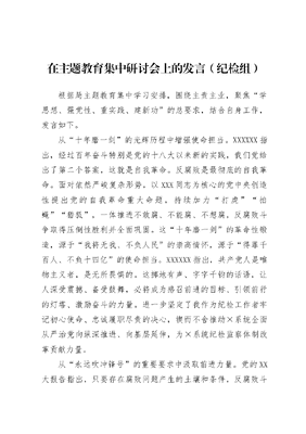 在主题教育集中研讨会上的发言(纪检组)根据局主题教育集中学习安排,围绕主责主业,聚焦学思想、强党性、重实践、建新功的总要求,结合自身工作,发言如下。从十年磨一剑的光辉历程中增强使命担当。XXXXXX指出,经过百年奋斗特别是党的十八大以来新的实践,我们党给出了第二个答案,这就是自我革命。反腐败是最彻底的自我革命。面对依然严峻复杂形势,以XXX同志为核心的党中央创造性提出党的自我革命重大命题,持续加力打虎拍蝇猎狐,一体推进不敢腐、不能腐、不想腐,反腐败斗争取得压倒性胜利并全面巩固。这十年磨一剑的革命性锻造,源于我将无我、不负人民的崇高情怀,源于得罪千百人、不负十四亿的使命担当。XXXXXX指出,共产党人是唯物主义者,是无所畏惧的。这掷地有声、字字千钧的话语,让人深受震撼、备受鼓舞,必将成为感召前进的目标、引领前行的灯塔、激励奋斗的力量。进一步坚定了我作为纪检工作者牢记初心使命、忠诚履职尽责的决心,锲而不舍推动×系统全面从严治党向纵深推进、向基层延伸,为×系统纪检监察体制改革贡献力量。从永远吹冲锋号的重要要求中汲取前进力量。党的XX大报告指出,只要存在腐败问题产生的土壤和条件,反腐败斗争就一刻不能停,必须永远吹冲锋号。这充分体现了以XXX同志为核心的党中央解决大党独有难题的清醒和坚定,充分体现了面对新征程上新挑战新考验永远保持赶考的警醒和谨慎,充分体现了治国必先治党勇气和定力。近年来,×系统全面从严治党、党风廉政建设和反腐败工作取得显著成效并全面巩固拓展,但对标XXXXXX和党中央重要部署、对照党委工作要求、对比广大人民群众期待,还存在这样那样的问题和不足,这就要求我们始终坚持自我革命,始终保持正视问题的勇气和刀刃向内的坚定,做到永远在路上永远吹冲锋号。在务必敢于斗争、善于斗争的伟大号召中锚定目标方向。XXXXXX指出,坚持发扬斗争精神,增强全党全国各族人民的志气、骨气、底气,不信邪、不怕鬼、不怕压,知难而进、迎难而上。对一名纪检干部而言,我们要始终坚守政治定位,增强忧患意识、坚持底线思维、提升工作本领,紧密结合×系统体制机制和行业特点,深刻把握腐败阶段性特征和变化趋势,既敢于坚持原则、敢于红脸黑脸,又善于做思想政治工作,以纪法情理贯通来更好惩前毖后、治病救人。在忠诚干净担当的标准要求上加强淬炼锻造。XXXXXX一再告诫要打铁必须自身硬。作为一名党员干部,要在全面从严治党革命性锻造中接受考验,要以更高的标准、更严的纪律自我要求,持续加强思想淬炼、政治历练、实践锻炼和专业训练,主动接受、自觉配合最严格的约束和监督,以实际行动践行忠诚干净担当,做对党忠诚、为国奉献、为民造福的卫士,努力为×系统高质量发展提供铁的纪律保障作出应有贡献。发言完毕,不当之处请大家批评指正!