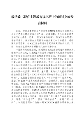 政法委书记在主题教育读书班上的研讨交流发言材料近日,按照县委常委会学习贯彻XXX新时代中国特色社会主义思想主题教育读书班统一安排部署,自己认真学习了党的XX大报告、党章、《XXX著作选读》《XXX法治思想》等学习篇目,深刻领会主题教育的重大意义和目标要求,通过深入学习思考,对XXX法治思想有了更系统更深刻的认识。下面,结合自己所学所思所悟谈几点认识和体会。一要提高站位强引领,深刻领会XXX法治思想的精神实质。党的十八大以来,以XXX同志为核心的党中央从坚持和发展中国特色社会主义的全局和战略高度定位法治、布局法治、厉行法治,把全面依法治国纳入四个全面战略布局,作出一系列重大决策、提出一系列重要举措。党的十八届三中全会将推进法治中国建设作为全面深化改革的重要方面作出专门部署。党的十八届四中全会专题研究全面推进依法治国,规划了全面依法治国的总蓝图、路线图、施工图。党的十九大把全面推进依法治国总目标写入XXX新时代中国特色社会主义思想八个明确,把坚持全面依法治国写入十四个坚持基本方略,描绘了到2035年基本建成法治国家、法治政府、法治社会的宏伟蓝图。党的XX大报告首次单独把法治建设作为专章论述、专门部署,这充分体现了以XXX同志为核心的党中央对全面依法治国的高度重视。XXX法治思想是新时代十年法治建设最重要的标志性成果,我们必须始终坚持XXX法治思想在全面依法治国中的指导地位不动摇,深刻领悟两个确立的决定性意义,增强四个意识、坚定四个自信、做到两个维护,切实把思想和行动统一到XXXXXX重要讲话精神上来,统一到党中央决策部署上来。政法各单位要带头深入学习贯彻XXX法治思想,用法治思维和法治方式深化改革、推动发展、化解矛盾、维护稳定、应对风险,为县域经济社会高质量发展提供良好的法治保障。二要深学细研悟原理,准确把握XXX法治思想的丰富内涵。XXX法治思想是马克思主义法治理论中国化最新成果,是XXX新时代中国特色社会主义思想的重要组成部分,就其主要方面来讲,集中体现为XXXXXX在中央全面依法治国工作会议重要讲话中精辟概括的十一个坚持。坚持党对全面依法治国的领导,深刻揭示了党的领导是推进全面依法治国的根本保证;坚持以人民为中心,科学指明了全面依法治国的根本立场;坚持中国特色社会主义法治道路,鲜明回答了全面依法治国向哪里走、走什么路的方向性问题,指明了建设社会主义法治国家的唯一正确道路;坚持依宪治国、依宪执政,明确指出了全面依法治国的首要任务是依宪治国、依宪执政;坚持在法治轨道上推进国家治理体系和治理能力现代化,深刻阐明了法治在全面建设社会主义现代化国家中的重要作用;坚持建设中国特色社会主义法治体系,明确了推进全面依法治国的总抓手;坚持依法治国、依法执政、依法行政共同推进,法治国家、法治政府、法治社会一体建设,擘画了全面依法治国的工作布局;坚持全面推进科学立法、严格执法、公正司法、全民守法,明确了法治建设的着力点和突破点;坚持统筹推进国内法治和涉外法治,彰显了我们党统筹国内国际两个大局的治国理政理念;坚持建设德才兼备的高素质法治工作队伍,为加强和改进法治队伍建设指明了方向;坚持抓住领导干部这个关键少数,深刻阐明了领导干部是全面依法治国的关键所在。十一个坚持深刻阐述了全面依法治国的政治方向、重要地位、重点任务、重大关系、工作布局、重要保障,构成了XXX法治思想的科学体系。党员领导干部,要进一步增强学习贯彻XXX法治思想的自觉性和坚定性,带头尊崇法律、敬畏法律、了解法律、掌握法律,不断提高运用法治思维和法治方式推动各项事业发展的能力,做尊法学法守法用法的模范。三要学用结合促转化,深入推进法治建设各项任务落地见效。XXXXXX强调指出,全面依法治国是国家治理的一场深刻革命,关系党执政兴国,关系人民幸福安康,关系党和国家长治久安。对我们推进平安法治建设提出更高要求、指明前进方向。要把学习XXX新时代中国特色社会主义思想激发出的热情干劲转化为推动工作突破提升的具体行动,落实到主动创稳行动的方方面面,进一步加强和创新社会治理,严格落实政治安全与维护稳定形势日分析、周研判、月报告制度,完善落实重大风险分级预警管控制度,对苗头性、倾向性等重要敏感事项,提早防范化解。要严格落实依法处置、舆论引导、社会面管控三同步工作要求,加强对敏感案事件的应对处置和舆论引导,严防因负面炒作引发事件升级。要进一步高压严打网络犯罪,积极开展电信网络诈骗、网络黄赌毒、网络传销、网络套路贷等专项打击行动,有效遏制全县网络违法犯罪高发态势。要坚持和发展新时代枫桥经验,大力开展枫桥式人民法庭、司法所和派出所创建工作,完善社会矛盾纠纷多元预防调处化解机制,不断提升社会治理法治化水平。要深入实施八五普法规划,把法治宣传融入日常生活