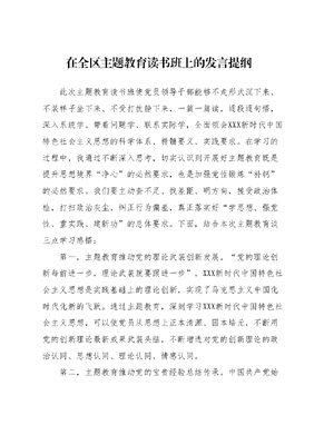 在全区主题教育读书班上的发言提纲此次主题教育读书班使党员领导干部能够不走形式沉下来、不装样子坐下来、不受打扰静下来,一篇一篇读,逐段逐句悟,深入系统学、带着问题学、联系实际学,全面领会XXX新时代中国特色社会主义思想的科学体系、精髓要义、实践要求。在学习的过程中,我通过不断深入思考,切实认识到开展好主题教育既是提升思想境界净心的必然要求,也是加强党性锻炼补钙的必然要求。我们要主动查不足、找差距、明方向,接受政治体检,打扫政治灰尘,纠正行为偏差,真正落实好学思想、强党性、重实践、建新功的总体要求。下面,结合本次主题教育谈三点学习感悟:第一,主题教育推动党的理论武装创新发展。党的理论创新每前进一步,理论武装就要跟进一步。XXX新时代中国特色社会主义思想是实践基础上的理论创新,实现了马克思主义中国化时代化新的飞跃。通过主题教育,深刻学习XXX新时代中国特色社会主义思想,可以使党员从思想上正本清源、固本培元,不断用党的创新理论最新成果武装头脑,不断增进对党的创新理论的政治认同、思想认同、理论认同、情感认同。第二,主题教育推动党的宝贵经验总结传承。中国共产党始终坚持将马克思主义同中国具体实际、同中华优秀传统文化相结合,坚持用中国化时代化的马克思主义武装全党、指导实践。纵观党的光辉历程,中国共产党坚持以开展党内集中学习教育制度化、常态化为依托,形成了思想建党、理论强党的宝贵经验。如今,在新征程上开展学习贯彻XXX新时代中国特色社会主义思想主题教育,对于有针对性地推动全党坚定理想信念、提升思想境界提高政治能力、永葆初心使命有重要意义。第三,主题教育推动党的群众路线走深走实。群众路线是党的生命线和根本工作路线,中国共产党始终坚持一切为了群众,一切依靠群众,从群众中来,到群众中去。此次主题教育将学习贯彻XXX新时代中国特色社会主义思想与在全党大兴调查研究紧密结合,目的就是要教育引导全党始终牢记党的最大政治优势是密切联系群众。坚持人民至上,树牢以人民为中心的发展思想,自觉问计于民、问需于民,着力解决人民群众急难愁盼问题,不断满足人民对美好生活的向往。我们常讲,躬身实践、知行合一。主题教育学习不仅在于知,更在于行,要坚持做到学思用结合、知信行统一。结合宣传思想工作和芝罘发展实际,今年主要做好以下几方面工作:一是要深入系统学习,全面掌握核心要义。党的十八大以来在XXX新时代中国特色社会主义思想的引领下,我们持续推动用党的创新理论武装全党,党员干部不断加强理论学习,取得了明显成效。今后,要继续围绕学懂弄通做实XXX新时代中国特色社会主义思想和党的XX大精神主题主线,抓关键少数带动绝大多数,坚持把理论中心组学习作为提高政治理论水平和领导水平的有效途径。要常态化推进理论宣讲,积极开展线上云宣讲以特色理论宣讲活动掀起主题教育学习热潮。要大兴调查研究之风,在问计于基层中发现问题和寻求解决问题的办法,紧盯群众反映强烈的现实性问题,例如教育医疗、民生保障、城市更新、社会治理等,列好调研清单,进一线了解服务对象最直接诉求,获取第一手资料和数据,化被动执行为主动作为。二是要理论联系实际,树牢为民宗旨意识。汝果欲学诗,功夫在诗外。主题教育开展的成效好不好,归根结底要看解决问题实不实、服务对象满意度高不高。确保主题教育在芝罘落地生根开花结果,要着眼群众的真需求,大力开展文化惠民活动,丰富群众精神文化生活,抓好区内××手造产业资源的挖掘培育和区外高端资源的双招双引,释放非遗手工产业、文化旅游产业活力,着力促进文化事业产业高质量发展。要紧紧抓牢各级文明实践阵地,升级打造具有芝罘特色的系列文明实践品牌项目常态化开展志愿服务活动,不断提升文明实践工作服务群众的能力和水平,推进主题教育走深走实。要深化典型选树培育,落实好美德信用礼遇制度,关心关爱先进典型,以典型引路、示范带动的形式,引领带动群众向身边先进典型看齐,增强主题教育感染力。三是要坚持担当作为,锤炼过硬作风。对于宣传思想工作而言,必须以主题教育为契机,始终保持斗争精神,聚焦工作重点着力突破攻坚,防范化解风险。要紧盯文明城市创建重点难点,持续做好市容环境和公共秩序整治,全面推进农贸市场提升和线缆整治提升,提升群众满意度和幸福感,全力以赴打赢全国文明城市创建攻坚战。要切实增强对意识形态风险的预知预判预警,提高舆情风险防范和处置能力。制定风险隐患防范化解工作预案深入开展全区意识形态领域风险隐患排查。加大舆情信息报送工作力度,加强与街道部门配合,推动负面舆情的线下化解,为开展主题教育筑牢网络安全和意识形态的安全屏障。