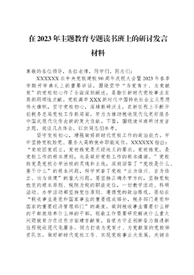 在2023年主题教育专题读书班上的研讨发言材料尊敬的各位领导,各位老师,同学们,同志们:XXXXXX在中央党校建校90周年庆祝大会暨2023年春季学期开学典礼上的重要讲话,围绕坚守为党育才、为党献策的党校初心作了全面深刻阐述,是指引新时代党校事业发展的纲领性文献。党校高举XXX新时代中国特色社会主义思想伟大旗帜,坚守党校初心,深耕教研沃土,在新征程上不断开创税务总局党校工作新局面,努力为推动税收现代化更好服务中国式现代化作出新的更大贡献。下面,围绕读书班研讨发言主题,我谈几点体会,以供同志们参考。坚守党校初心,增强做好新时代党校工作的政治能力。牢牢坚持党校姓党、服务大局的使命职能定位。XXXXXX指出:党校因党而立,党校姓党是天经地义的要求。党校姓党,是党校工作的根本原则,也是做好党校工作的根本遵循。党校姓党是党校办学治校的灵魂和主线,深刻回答了党校是什么、要干什么的根本问题,科学回答了党校业为谁兴、言为谁立、功为谁建的重大问题。要坚持正确办学方向,坚持党校姓党的根本原则、税院为税的职能定位,一切教学活动、科研活动、办学活动都坚持党性原则、遵循党的政治路线。要站在税收事业是党和国家事业的重要组成部分,税务部门是党和国家的重要经济管理部门的高度,做到税收事业需要什么样的干部就培养什么样的干部,税收工作需要研究解决什么重大问题就努力在这些方面建言献策,自觉为守正创新奋力推进新征程税收现代化服务。倾力打造为党育才、为党献策的党校师资队伍。做好新时代党校工作、实现党校事业大发展,关键在于要有一支初心坚定、政治过硬、本领高强、作风优良的优秀教师和优秀人才队伍。对党校教师来说,要坚守为党育才、为党献策的初心,坚持党校姓党,传好马克思主义真理之道,授好推动税收改革发展稳定之业,解好改造主观世界和客观世界所遇之惑。要有坚持党校姓党、税院为税的高度政治自觉,言为士则、行为世范的高度思想自觉,求是精业、勤廉笃行的高度实践自觉,不断提高党性修养、道德品行、素质能力,做经师和人师的统一者,做学员为学、为事、为人的大先生。聚焦主责主业,培养造就堪当兴税强国重任的税务铁军。聚力强化党的理论教育和党性教育主业主课地位。党校教育内容是多方面的,但必须分清主次轻重,这是事关党校办学重心所在的重大问题。党校只有始终坚持党的理论教育和党性教育的主业主课地位,才能更好服务党和国家工作大局,才能更好补齐税务干部的短板和弱项,才能形成不同于一般学校和培训机构的特色和优势。要重点抓好马克思主义中国化时代化最新成果教育培训,把党性教育作为培训教学的主要内容,把党章党规党纪学习教育作为党性教育的重要内容,以税务系统处级以上领导干部为重点办好各类党校主体班次,面向税务系统全体党员干部开展多形式、分层次、全覆盖的全员培训,推动学习培训常态化长效化,提高党的理论教育和党性教育的质量和效果,坚持不懈用新思想凝心铸魂。聚能承担为党献策、为税建言的研究资政职责。XXXXXX指出:党校作为党的思想理论战线的重要方面军,承担着为党献策的重要职责。要高举理想信念旗帜,学好讲好研好用好马克思主义真经,宣传党的主张,有针对性地批驳各种歪理邪说、错误观点,当好党的创新理论的积极宣讲者、马克思主义在意识形态领域指导地位的坚定维护者、用党的意识形态引导社会思潮的可靠促进者。要聚焦中国式现代化背景下税收现代化理论和实践遇到的新问题、经济社会发展和税收改革发展重大现实问题和热点难点问题、税务系统党的建设和全面从严治党以及税务干部队伍建设面临的突出问题,加强学理性研究、对策性研究、应用性研究,推出一批高水平、接地气的论文、专著、教材、课题、政策建议等成果,努力成为税务系统出思想、出成果、出人才的学术高地、高端智库。坚持内涵发展,大力推动质量立校、从严治校上台阶。锚定推进质量立校、质量强校的首要战略任务。办学质量是党校安身立命之本,是强校兴校最坚实的基础。质量兴则党校兴,质量高则党校强。质量立校是对党校工作的全方位要求,是推动党校事业高质量发展的应有之义。要坚持目标导向和问题导向相结合,补短板、强弱项、固根基、扬优势,把质量立校、质量强校作为全面提升党校工作水平的首要战略任务持续抓实抓好。要坚持高标准办学,高站位发挥学习宣讲研究党的创新理论的主阵地作用,高水平打造精品课程项目和研究资政成果,高端化开展实战导向的专业能力培训,高层次大力实施人才强校战略,高品质提升管理服务水平,追求一流教学科研、一流人才队伍、一流管理服务、一流校风学风、一流人文环境等,确保党校在税务干部教育培训大格局中发挥主渠道作用。坚决扛起坚持从严治校、从严治学的重大政治责任。党校校风学风教风对党风政风、社风税风有着重要影响和辐射作用。坚持从严治校是因厚爱而严管、寓厚爱于严管,是真正对党负责、对税收事业负责、对学