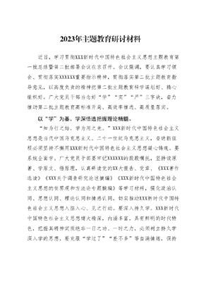 2023年主题教育研讨材料近日,学习贯彻XXX新时代中国特色社会主义思想主题教育第一批总结暨第二批部署会议在京召开。会议强调,要认真学习领会、贯彻落实XXXXXX重要指示精神,贯彻落实第二批主题教育指导意见,以高度负责的精神把第二批主题教育科学谋划好、精心组织好。广大党员干部当念好学实严三字诀,奋力推动第二批主题教育高标准开局、高效率推进、高质量落实。以学为基,学深悟透把握理论精髓。知为行之始,学为用之先。XXX新时代中国特色社会主义思想是当代中国马克思主义、二十一世纪马克思主义,奋进新征程必须坚持不懈用XXX新时代中国特色社会主义思想凝心铸魂。要系统全面学。广大党员干部要牢记XXXXXX的殷殷嘱托,坚持读原著、学原文、悟原理,认真研读党的XX大报告、党章、《XXX著作选读》《XXX关于调查研究论述摘编》《XXX新时代中国特色社会主义思想的世界观和方法论专题摘编》等学习材料,强化政治认同、思想认同、理论认同和情感认同,切实推动XXX新时代中国特色社会主义思想入脑入心、见之行动。要深入持久学。XXX新时代中国特色社会主义思想博大精深,内涵丰富,具有鲜明的时代特色,把握其精神实质绝非一日之功、一时之力,必须树立持久学深入学的思想,要克服学过了差不多等自满情绪,保持不待扬鞭自奋蹄的自觉,久久为功、锲而不舍,多思多想、融会贯通,实现从零散学向系统学的转化,从初步了解基本内容向深刻理解精神实质的转化,从渐悟到走向顿悟,向学懂弄通转化。要结合实际学。坚持问题导向,在学习过程中时刻联系认识上的模糊、实践中的困惑、作风上的问题,边学边悟,边悟边改找问题、补短板,做到知其然更知其所以然。要坚持联系实际,以如切如磋、如琢如磨的态度,把理论学习、交流研讨同本职工作同步推进,把研究解决问题作为出发点和落脚点,找到攻克难点堵点、解决矛盾问题、防范化解重大风险,进一步推动事业高质量发展。以实为要,做到学以致用知行合一。文以载道,以用为贵。主题教育效果好不好,关键要看成果的转化率和贡献率。要坚持学思用贯通。把XXX新时代中国特色社会主义思想转化为做好本职工作、推动事业发展的强大力量把开展主题教育同当前中心任务、重点工作有机结合,进一步推动本职工作的发展和进步。要坚持知信行统一。要善于复盘总结运用系统性思维,做好衔接工作,及时提炼经验找亮点,突出特色抓重点,将第一批主题教育开展过程中行之有效的做法延伸下来,承续好前者的标准、程序、方法,确保第二批主题教育借风起势、乘势而上。要坚持实践求实效。要落实重实践要求,强化调查研究,发扬斗争精神,潜心钻研业务,坚持一体谋划、一体整改、一体落实,真抓实干、善作善成,切实把焕发出的学习、工作热情投入破解难题、推动发展、为民造福上来,让主题教育成果落地生根、见行见效。以严为常,检视整改要贯穿始终。治其本,朝令而夕从;救其末,百世不改也。推进主题教育走向纵深,要把检视整改放在突出位置、贯穿始终,坚持分类整改与集中整治相结合,全面检视剖析、查摆不足。要聚焦问题导向,真改实改突出问题。主题教育是一次精神上再补钙、思想上再加油、行动上再赋能的过程,只有切实解决问题,才能达到以学铸魂、以学增智、以学正风、以学促干的目的。要发扬刀刃向内的自我革命精神,把自己摆进去、把职责摆进去、把工作摆进去,注重从制度机制上找准症结、研究对策,着力堵漏洞、补短板、强弱项,要走好群众路线、拜群众为师、向群众学习,在火热实践中探寻出解决问题的答案。要主动联系实际检视反思要查不足、找差距、明方向,敢于正视问题、立查立改,着力解决理论学习、政治素养、能力本领、担当作为、工作作风、廉洁自律6个方面的问题,找准找实个人成长进步的正确方向,始终保持共产党人的政治本色。要注重标本兼治,坚持当下改与长久立相结合。检视整改的问题是标,产生问题的原因是本,要从治标入手,把治本寓于治标之中,真正做到标本兼治。要做到边实践、边总结、边提升,将主题教育中出现的好做法、好经验,形成一套行之有效的制度。
