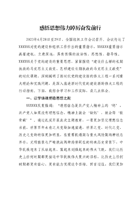 感悟思想伟力踔厉奋发前行2023年6月28日至29日,全国组织工作会议召开。会议传达了XXXXXX对党的建设和组织工作作出的重要指示,XXXXXX重要指示高屋建瓴、立意深远,具有很强的政治性、思想性、指导性。XXXXXX关于党的建设的重要思想,紧紧围绕建设什么样的长期执政的马克思主义政党、怎样建设长期执政的马克思主义政党的时代课题,深刻阐明了新时代党的建设新的伟大工程一系列重大理论和实践问题,是深入推进新时代党的建设新的伟大工程的行动指南。下面,我结合学习和工作实际,谈几点体会。一、以学铸魂把稳思想之舵XXXXXX反复强调:理想信念是共产党人精神上的钙,共产党人如果没有理想信念,精神上就会缺钙,就会得软骨病。通过扎实开展此次主题教育,一要更加坚定理想信念当前,世界百年未有之大变局加速演进,世界之变、时代之变、历史之变的特征更加明显,在重要机遇期与重大风险期两种状态并存、光明前景与严峻挑战两种趋势同在的特殊历史背景下,中华民族迎来了从站起来、富起来到强起来的伟大飞跃,我们比历史上任何时期都更接近中华民族伟大复兴的目标,比历史上任何时期都更有信心、更有能力实现这个目标。回首过往,我们更加坚定只有中国共产党,才能率领中华民族实现中国梦;展望未来我们必须牢记,要把蓝图变为现实,还有很长的路要走,需要付出长期艰苦的努力。二要始终对党绝对忠诚,面对风高浪急甚至惊涛骇浪的重大考验,如果没有对党忠诚作为政治上的定海神针,就很可能在各种考验面前败下阵来。作为党员领导干部,必须牢牢构筑廉政风险的防火墙,坚守清正廉洁本色,筑牢对党忠诚之魂。三要坚决站稳人民立场,作为分管农业的副县长,服务的就是最基层的老百姓,要眼睛向下、脚底粘泥、劲往下使,以民生为重点,持续巩固拓展脱贫攻坚成果,科学谋划乡村产业发展,加快提升基础设施水平,奋力开创全面推进乡村振兴新局面,让老百姓感受到实实在在的变化,享受到实实在在的成果。二、以学增智练就过硬本领学习贯彻XXX新时代中国特色社会主义思想主题教育,就是要从党的科学理论中悟规律、明方向、学方法、增智慧,把看家本领、新党本领、强国本领学到手,将学习成果转化为推动县域高质量发展的实际行动。一要淬炼过硬政治能力,近期深入研读了《XXX著作选读》,《选读》集中展示了以XXX同志为核心的党中央,团结带领全国人民在新时代进行的伟大斗争、实现的伟大变革,深刻感悟到领袖思想伟力,进一步坚定了理想信念,激发了前进动力。二要增强系统思维能力,XX大报告指出,高质量发展是全面建设社会主义现代化国家的首要任务,必须完整、准确、全面贯彻新发展理念,坚持社会主义市场经济改革方向,坚持高水平对外开放,加快构建以国内大循环为主体、国内国际双循环相互促进的新发展格局。作为县级领导干部,要将分管领域工作谋划深度融入国家战略和发展大局,既要立足当下、加快发展,更要谋划长远、实现可持续发展,只有这样才能推动县域经济社会发展行稳致远。三要提升创新实践能力,在2020年取得全面建成小康社会伟大历史成就后,党中央做出了设立5年过渡期的重要决定,是遵循客观规律,坚持实事求是的又一个原创性、独特性的科学决策。××作为巩固拓展脱贫攻坚成果同乡村振兴有效衔接整体推进县,除需在乡村产业发展、防返贫动态监测帮扶、脱贫人口稳定增收等方面持续巩固发力外,还需在推动三产融合发展、持续壮大村集体经济收入等方面加快前进步伐,为全面推进乡村振兴蓄能赋力。三、以学正风涵养清风正气今年6月,XXXXXX在内蒙古考察时围绕以学正风提出明确要求,强调要大兴务实之风弘扬清廉之风养成俭朴之风,为推动主题教育取得实实在在的成效进一步指明了方向。作为党员领导干部,一要求真务实,在抓落上狠下功夫,察实情讲实话、办实事、求实效,对定下来的事情就要雷厉风行、抓紧实施,部署了的工作就要督促检查、一抓到底,一步一个脚印地把各项工作推向前进。二要秉公用权,经常性地深入基层,倾听群众呼声,真正弄清他们在想什么、干什么、盼什么,把工作的着力点放在基层,把主要精力用在为群众办实事、办好事上,真正干一些群众看得见、用得上的好项目。三要廉洁自律,认真落实党风廉政责任制,严格执行领导干部廉洁从政的各项规定,在处理问题上公道正派,在用权用人上坚持原则,在钱物使用上严守规定,在生活待遇上不搞特殊,努力树立党员领导干部的良好形象,当好领头雁,做好排头兵。四、以学促干加快推动发展XXXXXX今年7月在江苏考察时重点对以学促干作了深刻阐述,强调:各级党组织要教育引导党员、干部落实重实践要求,坚持学思用贯通、知信行统一,匡正干的导向,增强干的动力,形成干的合力,在以学促干上取得实实在在的成效。一要勤于调查研究,调查研究是谋事之基、成事之道,是做好工作的基本功。作为领导干部,要扑