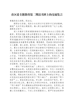 在区委主题教育第二期读书班上的交流发言尊敬的各位领导,同志们:按照会议安排,我结合本次培训中区委李书记讲话精神,围绕扎实开展主题教育,凝心聚力奋进新征程这个主题,简要发言如下:深入开展学习贯彻XXX新时代中国特色社会主义思想主题教育,是党的XX大提出的重要任务,是一件事关全局的大事,是把党的XX大擘画的宏伟蓝图变为现实的有力举措。在学习贯彻XXX新时代中国特色社会主义思想主题教育工作会议上,XXXXXX发表重要讲话强调,强国建设、民族复兴的宏伟目标令人鼓舞、催人奋进。我们这一代共产党人使命光荣、责任重大。要求全党同志要全面学习领会新时代中国特色社会主义思想,全面系统掌握这一思想的基本观点、科学体系,把握好这一思想的世界观、方法论,坚持好、运用好贯穿其中的立场观点方法,不断增进对党的创新理论的政治认同、思想认同、理论认同、情感认同,真正把马克思主义看家本领学到手。如何扎实有效开展主题教育,凝心聚力奋进新征程?结合李书记讲话精神,谈谈几点个人认识:一要在学出绝对忠诚上聚合力。对党忠诚是共产党人首要的政治品质,也是党性修养的关键所在。作为一名的党员。我们要坚持旗帜鲜明讲政治,时时、事事、处处用政治眼光审视问题,用政治标尺校准工作,用政治纪律约束言行举止,把对党绝对忠诚体现到坚定捍卫两个确立、坚决做到两个维护上。要坚定政治忠诚。牢记第一身份是共产党员,第一职责是为党工作,履行好工作职责和使命,自觉把坚决做到两个维护作为最高政治原则和根本政治责任,在思想上深刻认同核心、政治上坚决维护核心、组织上自觉服从核心、感情上坚决拥戴核心、行动上坚定紧跟核心。要严守政治纪律和政治规矩。自觉同党的理论和路线方针政策,始终在政治立场、政治方向、政治原则、政治道路上同以XXX同志为核心的党中央保持高度一致,以党的旗帜为旗帜、以党的意志为意志、以党的使命为使命,坚决贯彻落实XXXXXX和党中央的各项部署要求,做到党中央提倡的坚决响应、党中央决定的坚决执行、党中央禁止的坚决不做。要提高政治能力。涵养政治定力,强化政治担当,不断增强政治判断力、政治领悟力、政治执行力,坚持从政治上看待业务工作,做到观察分析问题把握政治因素、谋划推动工作落实政治要求、处理解决问题防范政治风险,确保XXXXXX重要讲话重要指示批示精神和党中央重大决策部署在我区条条落实、件件落地、事事见效。二要在学出理论真知上聚合力。理论修养的深度决定着党性修养的高度。要坚持把学懂弄通做实XXX新时代中国特色社会主义思想作为必修课、首修课、终身课,毫不松懈地加强党的创新理论武装,筑牢坚定马克思主义信仰、中国特色社会主义信念的思想根基,以理论上的清醒永葆政治上的坚定。要自觉主动学。要结合必学、选学篇目,制定个人学习计划,坚持学原文、读原著、悟原理,推动理论学习常态化长效化。要及时跟进学。严格落实党组中心组第一议题、主题党日等学习制度,第一时间学习领会党中央作出的新决策新部署,做到学习跟进、认识跟进、行动跟进。要联系实际学。紧密联系当前全局工作实际,结合学习成效,下大力气破解制约全区高质量发展的矛盾问题,在服务保障全区经济社会发展中积极作为。要笃信笃行学。学会用马克思主义立场观点方法去分析问题、解决问题,以理论清醒保持方向清晰、行动坚决、措施有力。三要在学出高尚品德上聚合力。道德修养是党性修养的基石,XXXXXX指出,道德之于个人、之于社会,都具有基础性意义,做人做事第一位的是崇德修身,要求党员干部特别是领导干部务必把加强道德修养作为十分重要的人生必修课,努力以道德的力量去赢得人心、赢得事业成就。我们要自觉把加强道德修养作为长期工程、基础工程来抓,带头践行社会主义核心价值观,努力当好崇德、明德、立德、修德的模范。要增强道德意识。牢记做事先做人、为官先修德,自觉培养健康的生活情趣,保持高尚的精神追求,遵守社会公德、职业道德、家庭美德,讲操守,重品行,坚决抵制不健康的思想观念和生活方式。要守牢道德底线。坚持堂堂正正做人,清清白白做事,坚决守住做人、处事、交友的底线,坚决抵制形形色色的诱惑,自觉净化生活圈、交往圈,勤掸思想尘、多思贪欲害,始终正心明道、怀德自重。四要在学出廉洁自律上聚合力。严守党章党规党纪是党性修养的底线要求。要坚持把严的基调、严的措施、严的氛围长期坚持下去,带头严纪律守规矩,锲而不舍落实中央八项规定及其实施细则精神,真正让纪律规矩成为做人干事、履职用权的硬约束。要突出纪律建设。自觉尊崇纪律、敬畏纪律、严守纪律,常态化加强党章党规党纪学习,想问题时翻一翻,作决策时照一照,明确什么事能做,什么事不能做,时刻自重自省自警自励,始终慎独慎初慎微慎友,做到心有所畏、言有所戒、行有所止。要加强监督管理。深化运用四种形态,综合运用谈话函询、提醒批评等方