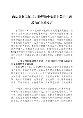 政法委书记在10月份理论中心组上关于主题教育的交流发言学习贯彻XXX新时代中国特色社会主义思想主题教育,是贯彻落实党的XX大精神的重大举措,对于统一全党思想、解决党内存在的突出问题、始终保持党同人民群众血肉联系、推动党和国家事业发展,具有十分重要的意义。本次读书班既是一堂生动的党课教育,又是一次心灵与头脑的洗礼,也是政治理论水平的大提升,更是做好新时代政法工作、重整行装再出发的冲锋号。主题教育开展以来,各位同志都认真学习领会XXX新时代中国特色社会主义思想,结合各自工作实际深入学习研讨并进行交流发言,通过交流和学习,我有以下几点初步体会。一、强化深刻学习领会意识,以XXX新时代中国特色社会主义指导思想武装头脑党的XX大以来,以XXX同志为核心的党中央带领着全国共产党员,坚持把马克思主义基本原理同中国具体实际相结合、同中华优秀传统文化相结合,创立了XXX新时代中国特色社会主义思想。涵盖了改革发展稳定、内政外交国防、治党治国治军,是一个逻辑缜密、内涵丰富、系统全面、博大精深的科学体系,只有下真功,才能得真谛,只有深思熟悟,才能走深走实。一是要以时代意义的格局来深刻领会把握这一重要思想。中国进入特色社会主义新的时代,各行各业的发展都进入了快车道,但是社会治理压力依然很大,维护社会稳定任务依然很重,迫切需要通过理论创新。对新时代给我们带来的新变化、新要求、新挑战进行科学回应,成为新时代领导干部的必修之课。世界百年未有之大变局正在加速演进,国家安全格局深度调整,全球进入新的动荡变革期。我国的社会主要矛盾发生历史性变化,前进道路上,战略机遇和风险挑战并存、不确定难预料因素呈现难以预料的增长趋势。XXX新时代中国特色社会主义思想,正是基于对世情、国情、党情变化的深刻把握,在新时代的伟大实践中创立的崭新思想体系,是理论创新、实践创新、制度创新的结晶,必将随着新时代的伟大变革而持续发展、不断丰富、更加完善。二是以核心要义的视野深刻领会把握这一重要思想。新时代以来,中国共产党勇于进行理论探索和创新,以全新的视野深化对共产党执政规律、社会主义建设规律、人类社会发展规律的认识,取得重大理论创新成果,这一切得益于XXX新时代中国特色社会主义思想的核心要义。这一重要思想,坚持两个结合,把马克思主义基本原理同中国具体实际相结合、同中华优秀传统文化相结合,是我们认识世界、改造世界的强大思想武器。XXX高瞻远瞩、举旗定向,总结改革开放历史经验和新的实践,开创性提出一系列具有突破性、战略性、指导性的重要论述和创新理论,成为锻造忠诚干净担当的新时代政法铁军制胜法宝。如何筑牢绝对忠诚、绝对纯洁、绝对可靠的政法铁军,XXX新时代中国特色社会主义思想则是最重要的根基,XXX对政法工作重要指示精神,有方向、有目标、有原则,有立场、有观点、有方法,全市政法干警要以全新的视野深入学习XXX新时代中国特色社会主义思想、XXX法治思想、总体国家安全观和XXX关于政法工作的重要论述,牢牢把握新时代政法工作的根本遵循,坚持联系实际、立足岗位,推动政法事业不断开创新局面。三是要以实践要求的意识深刻领会把握这一重要思想。纸上得来终觉浅,绝知此事要躬行。理论的价值在于指导实践。新时代以来,正是在XXX新时代中国特色社会主义思想科学指引下,中国共产党团结带领全国各族人民撸起袖子加油干,全面贯彻党的基本理论、基本路线、基本方略,立足新发展阶段、贯彻新发展理念、构建新发展格局,推动高质量发展,推进变革性实践,着力解决我国发展中存在的深层次矛盾和问题,经受住了来自政治、经济、意识形态、自然界等多方面围剿的风险挑战,攻克了许多长期没有解决的难题,办成了许多事关长远的大事要事,续写了经济快速发展和社会长期稳定并驾齐驱的奇迹,带领中华民族迎来了从站起来、富起来到强起来的伟大飞跃。回顾新时代的伟大历程,我们深切地感受到,新时代10年的伟大变革,最根本在于有XXX领航掌舵,有XXX新时代中国特色社会主义思想科学指引。有全党、全军、全国各族人民切身实践有力支撑。因此,学习践行XXX新时代中国特色社会主义思想,是新时代新征程开创全国事业稳定发展新局面的根本要求。二、做好党和人民手中的刀把子,为XXX新时代中国特色社会主义战略部署保驾护航政法队伍是保障国家安全的保护神,是维护社会稳定的主力军、坚守社会公平正义的最后一道防线,被喻为党和人民手中的刀把子。必须全面、系统、深入学习贯彻XXX新时代中国特色社会主义思想,聚精会神抓落实,切实把XXX新时代中国特色社会主义思想落实到岗位上、体现在行动中。一是坚定不移地把党对政法工作的绝对领导作为新时代政法工作最高原则。全市政法机关要强化四个意识,坚定四个自信,市委政法委要发挥好牵头作用,把思想政治、能力素质、纪律作风灌输到政法干警的血液中;抓