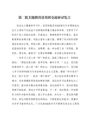第二批主题教育读书班交流研讨发言在这次主题教育学习中,我深切感受到XXX新时代中国特色社会主义思想不仅包括了治国理政的重大理论和策略,还贯穿了中国共产党人的政治品格、价值追求、精神境界和作风要求,包含着深厚的真理力量、实践力量和人格力量,增强了我对党的创新理论在政治认同、思想认同、理论认同和情感认同方面的认识。我坚持读原著、学原文、悟原理,进一步加深了对学思想、强党性、重实践、建新功总要求的理解,受到很大感染和启发。一是学习上进入更深的状态,提高了理论水平。XXXXXX指出:理论武装头脑,指导实践,推动工作。过去,我们高度重视学习,进入更深的状态,不断提高理论水平。我们深入学习贯彻XXX新时代中国特色社会主义思想,增强四个意识坚定四个自信、做到两个维护。我们组织开展专题学习研讨,系统掌握新思想新战略新判断。我们把学习成果转化为工作落实,推动各项事业取得新进展。通过持续学习,我们的理论视野不断拓展,理论水平明显提高。下一步,我们要进一步加强学习的针对性和实效性,真正学以致用、知行合一;要坚持问题导向,深化对新思想新理论的领会,不断提高运用能力;要推动全员学习教育常态化,广泛弘扬XXX新时代中国特色社会主义思想为实现中华民族伟大复兴的中国梦提供强大精神动力。二是政治上进入更强的状态,锤炼了党性修养。XXXXXX指出:艰苦奋斗可以锤炼品格,磨砺意志。过去,我们高度重视政治锤炼,进入更强的状态,不断增强党性修养。我们深入开展主题教育,增强政治定力。我们加强清廉建设,压实全面从严治党政治责任。我们坚持以上率下,以身作则,在思想上政治上行动上同以XXX同志为核心的党中央保持高度一致。通过持续自我革命,我们的党性觉悟不断增强,为民服务意识日益强烈下一步,我们要进一步强化政治意识、大局意识、核心意识、看齐意识,增强四个意识;要坚定理想信念,牢记初心使命,做到两个维护,以优异政治素质和过硬作风展现新气象新作为。三是文笔上进入更新的状态,增强了写作能力。XXXXXX指出:做好文章,关键是下功夫。过去,我们高度重视写作训练,进入更新的状态,不断增强写作能力。我们深入学习XXX新时代中国特色社会主义思想和党的创新理论,努力掌握马克思主义立场观点方法,牢牢树立以人民为中心的思想。我们开展专题研究,注重结合实际找差距、抓落实。我们广泛进行正面宣传,讲好中国故事,展现新气象新作为。通过持之以恒的学习实践,我们的写作思维更加开阔,表达能力得到明显提升。下一步我们要进一步突出政治立场,坚持理论联系实际,提高观点深度要注重典型选材,突出事例说理,增强文章感染力;要不断推陈出新,丰富语言表达,提高写作艺术性。