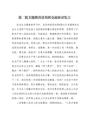 第二批主题教育读书班交流研讨发言在这次主题教育学习中,我深切感受到XXX新时代中国特色社会主义思想不仅包括了治国理政的重大理论和策略,还贯穿了中国共产党人的政治品格、价值追求、精神境界和作风要求,包含着深厚的真理力量、实践力量和人格力量,增强了我对党的创新理论在政治认同、思想认同、理论认同和情感认同方面的认识。我坚持读原著、学原文、悟原理,进一步加深了对学思想、强党性、重实践、建新功总要求的理解,受到很大感染和启发。一是要坚定共产党人的理想信念。XXXXXX指出:理想信念是共产党人精神上的钙。过去一年来,面对各种艰辛困苦,我坚定马克思主义信仰,增强四个意识、坚定四个自信、做到两个维护,始终保持共产党人的政治本色。通过对党的历史的学习,我深感理想信念的力量,并以此坚持正确政治方向下一步,我们要进一步加强理想信念教育,组织广大党员干部学习党的创新理论,坚定道路自信、理论自信、制度自信、文化自信,牢记为人民服务的根本宗旨。我们还要在思想上政治上行动上同以XXX同志为核心的党中央保持高度一致,坚决维护XXXXXX的核心地位,在思想上政治上行动上同党中央保持高度一致。二是领悟人民至上的为民情怀。XXXXXX指出:人民对美好生活的向往,就是我们的奋斗目标。过去一年来,面对经济下行压力,我带头深入基层一线调研,倾听群众呼声,提出促进高质量发展的有效举措,取得积极成效。这让我深刻感受到人民至上的情怀。下一步,我们要进一步坚持以人民为中心的发展思想牢记我们的一切工作都是为了让人民过上好日子。我们还要多措并举保障和改善民生,让人民群众在发展成果中有更多获得感、幸福感、安全感。三是践行忠诚担当的职责使命。XXXXXX指出:担当者恪守职责,辛勤工作,忠诚履行使命。过去一年来,我带头撸起袖子加油干,克服重重困难,攻坚突破,取得良好工作成效,得到组织认可。这让我深知履行好职责使命的重要性。下一步,我们要继续发扬斗争精神,以钉钉子的精神把每件事抓紧抓实,不推诿、不懈怠,以平常心度非常时,以非常之效统筹经济社会发展我们还要继续保持共产党人政治本色,增强忧患意识,居安思危直面风险挑战,以实际行动践行新时代中国特色社会主义思想。