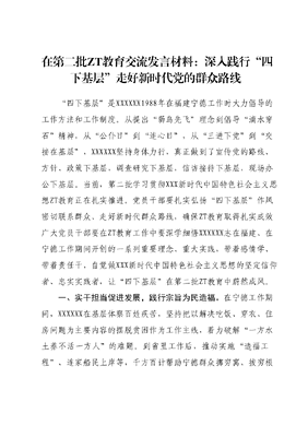 在第二批ZT教育交流发言材料:深入践行四下基层走好新时代党的群众路线四下基层是XXXXXX1988年在福建宁德工作时大力倡导的工作方法和工作制度。从提出弱鸟先飞理念到倡导滴水穿石精神,从公仆日到连心日,从三进下党到交接在基层,XXXXXX坚持身体力行,真正做到了宣传党的路线、方针、政策下基层,调查研究下基层,信访接待下基层,现场办公下基层。当前,第二批学习贯彻XXX新时代中国特色社会主义思想ZT教育正在扎实推进。党员干部要扎实弘扬四下基层作风密切联系群众、走好新时代群众路线,确保ZT教育取得扎实成效广大党员干部要在ZT教育工作中要深学细悟XXXXXX志在福建、在宁德工作期间开创的一系列重要理念、重大实践,带着感情学、带着责任干,自觉做XXX新时代中国特色社会主义思想的坚定信仰者、忠实实践者,让四下基层在第二批ZT教育中蔚然成风。一、实干担当促进发展,践行宗旨为民造福。在宁德工作期间,XXXXXX在基层体察百姓疾苦,坚持把以解决吃饭、穿衣、住房问题为主要内容的摆脱贫困作为工作主线,着力破解一方水土养不活一方人的难题。到省里工作后,推动实施造福工程、连家船民上岸等,千方百计帮助宁德群众挪穷窝、拔穷根XXXXXX跋山涉水亲力亲为,为全党上下树立了榜样。四下基层是工作制度、工作方法,更是优良工作作风和真挚为民情怀的体现。广大党员干部要大力传承弘扬四下基层优良传统,深入实际、深入基层、深入群众,始终坚持以人民为中心的发展思想,始终坚持权为民所用、情为民所系、利为民所谋,坚定不移地站稳人民立场、把握人民愿望、尊重人民创造、集中人民智慧,在任何时候都把群众利益放在第一位,千方百计为人民群众办实事解难题,不断实现人民对美好生活的向往。二、深入开展调查研究,实实在在解决问题。调查研究是获得真知灼见的源头活水,是做好工作的基本功。1988年刚到宁德工作,XXXXXX就沉下身子到基层调研,用一个月的时间走遍闽东9县,不到两年时间基本走遍宁德所有的乡镇,全面深入地了解宁德经济社会发展的实际情况,坚持运用唯物辩证法看待闽东贫困地区的发展问题,提出弱鸟先飞滴水穿石等摆脱贫困的重要理念。实践充分证明,这些重要理念和思路为宁德摆脱贫困提供了科学指引和重要遵循。大兴调查研究是深入学习贯彻XXX新时代中国特色社会主义思想ZT教育的重要内容,广大党员干部要把四下基层作为重要载体,用好调查研究这个传家宝坚持问题导向,做到走出去、沉下去,直奔问题去、带着问题学对着问题改,搞清楚产生问题的症结在哪里,真研究问题、研究真问题,拿出破解难题的实招硬招,真正做到从调查研究中来、到解决问题中去,切实把调查研究转化为推进工作、解决问题的实际成效。三、下沉一线化解矛盾,竭尽全力排忧解难。XXXXXX在《把心贴近人民——谈新形势下领导的信访工作》一文中写道通过深入基层,提高领导机关的办事效率,有利于把问题解决在源头,把矛盾消弭在萌芽状态;同时,要积极做好群众的宣传发动和思想教育工作,改进各级领导的工作作风,使党的方针、政策真正落到实处。XXXXXX不仅这样要求干部,而且自己实实在在地做。在新形势下,传承和弘扬这种干部下基层开展信访工作的经验具有重要的意义。它不仅对于做好新时代的信访工作至关重要,而且推动基层社会治理体系和治理能力现代化,夯实国家安全和社会稳定的基础。新时代新征程,广大党员干部要增强问题意识,发扬担当精神和斗争精神,敢于正视问题、善于发现问题、努力解决群众的实际问题。将信访工作送到群众家门口,倾听群众的诉求并及时回应。通过近距离的信访接待,让群众感受到党和政府的关怀与支持。四、走实走深群众路线,努力提升工作实效。在一线办实事到现场抓落实,是打通服务群众最后一公里的有效举措,也是推动ZT教育见行见效的重要途径。XXXXXX在福建工作期间,既倡导现场办公下基层,又力推马上就办,首创机关效能建设,要求把工作着力点主动放在基层一线,对于关系群众切身利益又久拖未决的问题,要现场集中会诊,特事特办,急事急办。现场办公下基层不仅拉近了机关与基层、领导与群众的距离,更是解民忧、惠民生的重要体现。广大党员干部要扑下身子、沉到一线,深入农村社区、企业车间、田间地头,把问题在一线解决、服务在一线跟进、责任在一线落实,变会场为现场,以实干求实绩,面对面问情况、听意见、解难题,办实事,大力提倡马上就办,发扬求真务实、真抓实干的工作作风,让一件件影响群众生产生活的实际问题得以解决,一大批事关企业转型升级的发展难题顺利攻坚,一张张笑脸在感动和幸福中尽情绽放,让现场办公下基层这一优良传统焕发出新的时代光彩。