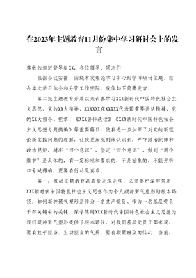 在2023年主题教育11月份集中学习研讨会上的发言尊敬的巡回督导组XX,各位领导、同志们根据会议安排,围绕本次理论学习中心组学习研讨主题,结合本次学习体会和分管工作实际,我作如下简要发言。第二批主题教育开展以来认真学习XXX新时代中国特色社会主义思想、党的XX大精神、XXXXXX在XXXXX代表团重要讲话精神、党的XX大报告、党章、《XXX著作选读》《XXX新时代中国特色社会主义思想专题摘编》等重要篇目,使我进一步加深了对党的新理论新实践问题的理解,让我更加深刻地认识到,严守政治纪律和政治规矩,树牢四个意识,坚定四个意识,做到两个维护是具体的,有一定标准和要求的,不是抽象的,不能光听口号喊得响,更要看行动见真章。第一,推动主题教育高质量走深走实,必须要把深学笃用XXX新时代中国特色社会主义思想作为个人凝神聚气塑形的根本路径。如何凝神聚气塑形是作为一名共产党员、作为一名基层党员干部关键中的关键,深学笃用XXX新时代中国特色社会主义思想为我们凝神聚气塑形提供了根本路径。对我们基层党员干部来说,要有敢于担当、主动担当的气质,要有凝聚群众的信心。当前,正值我区全面推进中国是现代化的XXX实践的关键时期,要坚定必胜信心,凝聚决战必胜、舍我其谁的心气,一鼓作气、奋勇当先全力取胜。从工作的感悟来说,塑形就是要结合自身实际工作来体现,XXX人就要有XXX人的样子。作为区委班子中的一员,对自己所分管的工作、对区委安排包保负责的镇村乡村振兴工作,就要塑XXX该领域该事项的良XXX形象,把党员的整体形象展现出来第二,推动主题教育高质量走深走实,必须要把执行落实作为履行XXX主责主业的生命线。区委办公室作为区委的综合办事机构和参谋服务机构,是区委重大决策的神经中枢,是否抓执行落实,抓执行落实效果如何,是我们作为XXX人的主责主业最根本的体现。我们要把中央和XX市各项决策部署要求落地落细落小落实,在XXX生根、开XXX、结果,就是体现了我们增强四个意识,坚决做到两个维护的根本要求。结合实际工作来看,党委办公室在抓工作执行落实上发挥了非常重要的作用,工作落实得XXX、落实得细的,党委办公室一般在跟踪督办上比较到位、汇报反馈上比较精准、调查研究上比较深入、信息报送上比较及时。反之,基本就是执行落实中出了偏差、执行落实半途而废等情况发生,这是影响办公室抓工作落实的关键所在。必须要聚焦主责主业,强化担当作为,继续把执行落实作为XXX生命线抓实抓牢,争当抓落实的排头兵,坚持马上就办,提高执行落实力强化督查督办,提升督查效能,切实当XXX区委的坚强前哨巩固后院核心智库。第三,推动主题教育高质量走深走实,必须要把一抓到底作为强化政治担当的检验标尺。在昨天的集中学习上,再次XXXX,对照工作实际,深深感觉到一抓到底的极端重要性。工作抓了一半、抓了三分之二、抓了百分之九十九都不足以把一件事做XXX,只有百分之百的抓,始终盯死看牢,坚持一竿子插到底才能为我们工作落实打下坚实基础。特别是作为办公室来说,小到一些细节上的服务,大到为区委作决策参考的基础性工作,在一抓到底上稍有偏差,都会导致事倍功半、达不到预期效果。总结近几年区委办在XXX中出现的一些失误、偏差,如,公文办理中的不规范、协调落实中的错位、调查研究中的短板等方面,虽然看似是一些零敲细打、细枝末节的问题,但日积月累足以造成对区委决策的被动。所以,要把一抓到底作为政治担当的责任坚决落实,以更严更实的标准抓XXX提升,坚持在极端负责和马上就办中创造一流业绩、提供一流服务,落实到具体的公文处理、综合协调、文稿信息、督查督办等工作环节和细节。第四,推动主题教育高质量走深走实,必须要把防范化解各种风险作为提高斗争本领的重大考验。防范化解重大风险,需要有充沛顽强的斗争精神。领导干部要敢于担当、敢于斗争,保持斗争精神、增强斗争本领,年轻干部要到重大斗争中去真刀真枪干,要高度重视对青年一代的思想政治工作,完善思想工作政治体系,不断创新思想政治工作的内容和形式,教育引导广大青年形成正确的世界观、人生观、价值观,增强中国特色社会主义道路、理论、制度、文化自信,确保青年一代成为社会主义建设者和接班人。作为分管群团工作的区委班子成员,在区委领导下,将继续把党建带群团压紧压实,引导我们各级党组织和群团工作者广交青年朋友、巾帼妇女、产业工人等,做XXX青年群体的思想政治建设,增强青年对四个自信的价值认同,不断夯实党执政的阶级基础和群众基础。作为个人而言,无论是在信访工作领域还是在落实XXX上,要增强斗争意识和服务意识,提高防范化解风险的意识和能力,认认真真、严严谨谨抓XXX工作。我的发言完毕,谢谢大家。不当之处请批评指正。