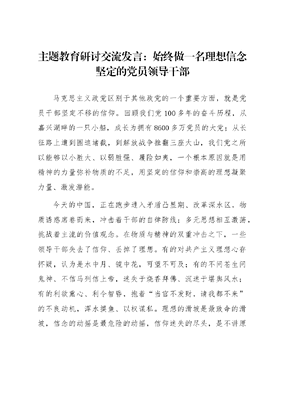 主题教育研讨交流发言:始终做一名理想信念坚定的党员领导干部马克思主义政党区别于其他政党的一个重要方面,就是党员干部坚定不移的信仰。回顾我们党100多年的奋斗历程,从嘉兴湖畔的一只小船,成长为拥有8600多万党员的大党;从长征路上遭到围追堵截,到解放战争推翻三座大山,我们党之所以能够以小胜大、以弱胜强、履险如夷,一个根本原因就是用精神的力量弥补物质的不足,用坚定的信仰和崇高的理想凝聚力量、激发潜能。今天的中国,正在跑步进入矛盾凸显期、改革深水区,物质诱惑席卷而来,冲击着干部的自律防线;多元思想相互激荡,挑战着主流的价值观念。在物质与精神的双重冲击之下,一些领导干部失去了信仰、丢掉了理想。有的对共产主义理想心存怀疑,认为是水中月、镜中花,可望不可及;有的不问苍生问鬼神、不信马列信上帝,迷失于烧香拜佛、沉迷于堪舆风水;有的利欲熏心、利令智昏,抱着当官不发财,请我都不来的不良动机,浑水摸鱼、以权谋私。理想的滑坡是最致命的滑坡,信念的动摇是最危险的动摇,信仰迷失的尽头,是不讲原则、价值虚无,甚至底线崩塌。因此,XXXXXX一再强调:一些党员、干部出这样那样的问题,说到底是信仰迷茫、精神迷失。一、坚持理论武装,始终保持政治上的清醒和坚定崇高的理想、坚定的信念,始终是共产党人永葆生机的精神动力。崇高的理想、坚定的信念不会自发产生,只有坚持理论学习,用科学理论武装头脑,才能胸怀共产主义的崇高理想,坚定走中国特色社会主义道路的信念。中国特色社会主义符合中国国情,符合中华民族的根本利益,是中国发展和走向富强的正确道路。我们必须把坚定理想信念、提高思想政治水平放在首位,认真学习马列主义、毛泽东思想、邓小平理论、三个代表重要思想、科学发展观,特别是要认真学习贯彻XXXXXX系列重要讲话精神,坚持用中国特色社会主义理论体系武装头脑,坚定对中国特色社会主义的道路自信、理论自信、制度自信。要善于应用马克思主义立场、观点、方法观察和解决问题,提高辩证思维能力,不断深化对社会主义和共产主义的认识。要用共产党员的标准严格要求自己,始终保持政治上的清醒和坚定,不断提高党性修养、思想觉悟和道德水平,抵御各种诱惑,排除各种干扰,切实增强为党和人民事业不懈奋斗的自觉性和坚定性。二、严格遵守党章,维护党章的权威性和严肃性党章是立党、治党、管党的总章程、总规矩。党章不仅明确要求党员干部具有共产主义的远大理想和中国特色社会主义的坚定信念,而且对党员的权利和义务、党员领导干部应该具备的基本条件、党的纪律等作出明确规范,是广大党员干部进行自我教育、自我提高的好教材,是全体党员必须共同遵守的根本行为准则。面对四大考验和四种危险,党员干部要始终坚定理想信念,就必须认真学习党章,自觉遵守党章,严格按照党章规定要求自己,要牢固树立正确的世界观、人生观、价值观和权力观、利益观、地位观,始终保持清醒头脑,在任何时候、任何情况下都确保在理想信念上不犹豫、不含糊、不动摇;要有革命理想高于天的精神,自觉抵制各种腐朽思想的侵蚀,做共产主义远大理想和中国特色社会主义共同理想的坚定信仰者和忠诚实践者;要牢固树立党章意识,真正把党章作为加强党性修养的根本标准和规范言行举止的标尺标杆,自觉做学习党章、遵守党章、贯彻党章、维护党章的模范。三、强化宗旨意识,始终坚持在实践中锤炼党性中国共产党自成立之日起,就将全心全意为人民服务确定为党的根本宗旨。正是因为长期坚持这一根本宗旨,党领导全国各族人民才取得了建立新中国、建设新中国的伟大胜利。始终坚持全心全意为人民服务,依靠人民的力量和支持,是实现中华民族伟大复兴中国梦的关键,也是党提高执政能力、巩固执政基础的关键。根据党的XX大部署,党中央决定,在以县处级以上领导干部为重点在全党深入开展学习贯彻XXX新时代中国特色社会主义思想主题教育,总要求是学思想、强党性、重实践、建新功,根本任务是坚持学思用贯通、知信行统一,把XXX新时代中国特色社会主义思想转化为坚定理想、锤炼党性和指导实践、推动工作的强大力量,使全党始终保持统一的思想、坚定的意志、协调的行动、强大的战斗力,努力在以学铸魂、以学增智、以学正风、以学促干方面取得实实在在的成效。当前,**正处于转型发展机遇期、攻坚克难关键期、社会矛盾凸显期,能否解决好经济社会发展中的瓶颈和矛盾,是对各级党员干部理想信念坚定不坚定的重大检验。要把实现远大理想与酒泉发展改革大局紧密结合起来,坚持以四个全面战略布局谋划工作、推动落实。具体来讲:要围绕五做,深入推进365现代农业发展行动计划,大力发展以新能源及新能源装备制造为主的首位产业和高载能循环经济产业,加快文化旅游融合发展,培育壮大高科技产业和新兴产业,打造新的经济增长点;要围绕五加强,坚决贯彻执行中央八项规定和省市委双十条规定,全面落