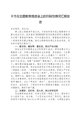 X市在主题教育推进会上的阶段性情况汇报发言各位领导、同志们:第二批主题教育开展以来,市委始终把开展主题教育作为重大政治任务,坚决落实XXXXXX把实的要求贯穿主题教育全过程重要指示精神,牢牢把握总要求,紧紧锚定目标任务,一体推进落实重点措施,推动主题教育取得扎扎实实成效。现将有关情况汇报如下:一、重引领、重指导、重实效,突出严实对标委先后召开市常委会会议开展学习13次,研究部署全市主题教育工作。市委主要领导既抓总体部署、具体落实,又抓带头表率、示范引领,市委常委一班人认真履行一岗双责,参加2期7天读书班每天8.5小时集中学习,开展理论学习中心组学习会13次,领题深调研课题96个,深入检视问题24个,制定整改措施103条,确定全市专项整治方案2个,开展为民办实事162项,带动各级领导班子带头学研查改干,形成一级做给一级看、一级带着一级干的生动局面;坚持从严对标、从实谋划,全面建立四计划三清单,即工作计划、学习计划、调研计划、整改计划,问题清单、调研成果转化运用清单、为民办实事清单,印发9大领域党组织书记开展主题教育责任清单402条,出台两指引一通知,推动老党员及行动不便的党员、流动党员、三新党员参加主题教育全覆盖,实打实有步骤推进,确保不缺不漏。二、全面学、及时学、深入学,突出深学笃用突出精研细读深学。市通过党委(党组)会议,理论学习中心组学习会、读书班、大西关读书讲坛等形式,推动各级领导干部研读8+1+1学习材料,分专题、分领域全面系统学、及时跟进学、结合本职学。突出丰富载体促学。每月分领域发布组织生活清单,部署开展十万党员进党校学思想1268期,用好373工作法,依托党校、党群服务阵地、党员教育基地三大阵地,开展参观一次各类教育基地、重温一次入党誓词、聆听一场专题党课、聆听一场宣讲、观看一遍党员教育优秀电视片、收听收看一系列视频讲座、畅谈一次学习感悟七个一活动,上门开展送学、送课、送关怀三送,深入开展三讲三听、宣讲六进活动,即书记讲给书记听、书记讲给党员听、党代表讲给党员听,宣讲进机关、进企事业单位、进城乡社区、进校园、进各类新经济组织和社会组织、进网站,全市各党支部召开三会一课2.3万次,开展主题党日活动1.1万次,参加党员约50万人次,让党的创新理论飞入寻常百姓家。突出学以致用践学。深入开展立足岗位作贡献、学习身边榜样、党员志愿服务等活动,广泛设立党员示范岗、党员责任区,推动党员干部围绕中心工作奋勇争先。三、察实情、出实招、见实效,突出求真务实坚持高位谋篇精准选题。全市各级领导班子领题揭榜认领课题769个,精选确定180个正反面典型案例开展解剖式调研。聚焦短板扎实解题。采用四不两直方式深入基层开展蹲点式联动式融合式调研,调研访谈基层干部群众7700多人次,收集诉求建议1.18万多条,采纳8000多条。云安区调研群众反映出行难问题,投入约300万元新购置20辆新能源车用于农村客运,开通多个特色镇通村班次满足群众需求。凝聚合力全面答题。建立一课题、两清单联动机制抓实调研成果评判检验,调研成果已转化应用305项,解决问题581件,推动调研成果从纸上落到地上。聚焦农村集体经济薄弱难题,加强调研成果转化,全面发起发展村级集体经济攻坚行动,探索走出一条党委政府引导下社会资本与村集体合作发展新型农村集体经济的云浮路径,政银企村共建养殖园投融资模式入选农业农村部颁布的《现代设施农业投融资模式和案例选编》。四、真解题、解真题、破难题,突出真抓实干市从12方面重点任务48项工作措施部署实施破难题、促发展攻坚行动,开展局长进窗口为群众想办法活动和五拼五比晒五榜、促进高质量发展系列竞赛,推动解决发展所需、改革所急、基层所盼、民心所向的问题5965个。深入开展四下基层和基层治理大走访、大排查、大整治、大提升行动,推动在基层一线解决群众急难愁盼问题1.5万件,化解群众信访积案252件,群众获得感成色更足、幸福感更可持续、安全感更有保障。XX市XX镇党委把解决群众出行难问题作为主题教育为民办实事的重要举措之一,大力推动投资182万元的红龙桥完成升级改造通车,解决了周边5个村1.2万多名群众出行难题。五、见深度、见精度、见广度,突出动真碰硬积极践行奔着问题去、对着问题改,打出一套存量+增量自查+收集的检视整改组合拳,县处级以上领导班子自查问题511个,制定整改措施1201条,紧盯9+2专项整治中发现的124个问题,实行动态对账销号,一体部署落实整治整改;坚持当下改与长久立相结合,全市各级党组织建立健全制度机制、完善工作流程687项,推动把解决一件事升格为解决一类事。整治教育领域突