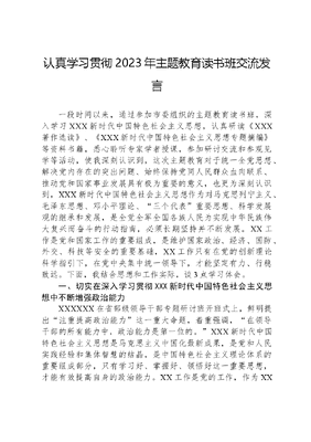 认真学习贯彻2023年主题教育读书班交流发言一段时间以来,通过参加市委组织的主题教育读书班,深入学习XXX新时代中国特色社会主义思想,认真研读《XXX著作选读》、《XXX新时代中国特色社会主义思想专题摘编》等资料书籍,悉心聆听专家学者授课,参加研讨交流和参观见学等活动,使我深刻认识到,这次主题教育对于统一全党思想、解决党内存在的突出问题、始终保持党同人民群众血肉联系、推动党和国家事业发展具有极为重要的意义,也更为深刻认识到,XXX新时代中国特色社会主义思想作为对马克思列宁主义、毛泽东思想、邓小平理论、三个代表重要思想、科学发展观的继承和发展,是全党全军全国各族人民为实现中华民族伟大复兴而奋斗的行动指南,必须长期坚持并不断发展。XX工作是党和国家工作的重要组成,是维护国家政治、经济、国防、外交、科技等安全的重要基础,XX工作只有在党的创新理论科学指引下,在党中央集中统一领导下,才能坚定有力、行稳致远。下面,我结合思想和工作实际,谈3点学习体会。一、切实在深入学习贯彻XXX新时代中国特色社会主义思想中不断增强政治能力XXXXXX在省部级领导干部专题研讨班开班式上,鲜明提出注重提高政治能力这一重大命题,着重强调,在领导干部的所有能力中,政治能力是第一位的。XXX新时代中国特色社会主义思想是马克思主义中国化最新成果,是党和人民实践经验和集体智慧的结晶,是中国特色社会主义理论体系的重要组成部分,只有学习好、掌握好、领悟好这一重要思想,才能有效提高自身的政治能力。XX工作是党的工作,作为XX工作者,必须把XXX新时代中国特色社会主义思想作为砥砺初心使命的必修课,在深学细悟中学出绝对忠诚的政治品格;必须把XXX新时代中国特色社会主义思想作为XX工作最需要学好用好的教课书,善于从中总结科学经验、探寻发展规律,不断提高新时代XX工作质量,在传承与发展中坚定政治担当。下一步,我们将按照原原本本系统学、立起专题深入学、上下联动全员学、结合工作推动学的思路,综合用好机关党委理论学习中心组学习、三会一课、主题党日和青年理论学习小组等载体,成体系、有重点地推进XXX新时代中国特色社会主义思想学习教育,教育引导党员干部准确把握内涵要义、实践要求,全面提升政治能力。二、切实在深入学习贯彻XXX新时代中国特色社会主义思想中不断彰显为民本色XXXXXX强调指出,我们党的各级领导干部更应自觉坚持全心全意为人民服务的根本宗旨,保持同人民群众的血肉联系,始终与人民同呼吸、共命运、心连心,团结带领人民续写改革新篇章,确保改革取得成功。以人为本、执政为民是马克思主义政党的生命根基和本质要求,作为一名党员领导干部,就是要把人民群众的愿望和需求作为工作的基本指向,多办顺应民意、化解民忧、为民谋利的实事,努力让人民群众得到实实在在的利益。前期,我多次到企业进行了调研,得到了企业的积极评价,这也让我更深地体会到了企业家们对良好营商环境和高质高效政府服务的热切期盼。下一步,我们将以扎实开展省委XX活动为契机,坚持主动发现问题、查找问题、解决问题,切实为维护群众利益、优化营商环境、助力XX发展建设作出应有的贡献。三、切实在深入学习贯彻XXX新时代中国特色社会主义思想中不断开拓创新建新功是XXXXXX对主题教育提出的一项重要要求。做好新时代的XX工作,不仅要坚持以传统精神固根铸魂,还要注重积极适应新形势、紧跟新要求。要认真学习贯彻XXXXXX关于XX的最新重要论述,准确把握发展与安全、团结与奋进的辩证关系,切实在紧跟XXX思想步伐中实现新发展。前期,我们按照中央和省委关于加强改革创新的工作要求,在机关党建、XX宣教等方面进行了一些积极思考和探索,但距离求突破、上层次还有大量工作要做。下一步,我们将紧跟形势任务要求,紧贴自身建设实际,进一步加强思想观念、思维方式、工作方法等方面创新,解放思想、勇于实践、迎接挑战,切实以新思路新办法推进XX工作创新发展。