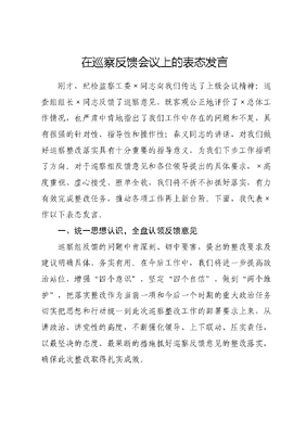 在巡察反馈会议上的表态发言刚才,纪检监察工委×同志向我们传达了上级会议精神;巡查组组长×同志反馈了巡察意见,既客观公正地评价了×总体工作情况,也严肃中肯地指出了我们工作中存在的问题和不足,具有很强的针对性、指导性和操作性;春义同志的讲话,对我们做好巡察整改落实具有十分重要的指导意义,为我们下步工作指明了方向。对于巡察组反馈意见和各位领导提出的具体要求,×高度重视、虚心接受、照单全收,我们将不折不扣抓好落实,有力有效完成整改任务,推动各项工作再上新台阶。下面,我代表×作以下表态发言。一、统一思想认识,全盘认领反馈意见巡察组反馈的问题中肯深刻、切中要害,提出的整改要求及建议明确具体、务实有用。在今后工作中,我们将进一步提高政治站位,增强四个意识,坚定四个自信,做到两个维护,把落实整改作为当前一项和今后一个时期的重大政治任务切实把思想和行动统一到此次巡察整改工作的部署要求上来,从讲政治、讲党性的高度,不断强化领导、上下联动、压实责任,以最坚决的态度、最果断的措施抓好巡察反馈意见的整改落实,确保此次整改取得扎实成效。二、聚焦问题短板,扎实做好整改落实会后,对于此次巡察反馈的问题,我们将第一时间召开党委会,成立整改落实工作领导小组,建立并实施台账式管理和销号制落实制度,坚决按照巡察组反馈的意见和提出的要求扎实做好巡察整改的下半篇文章。针对反馈的个性问题,我们将应快尽快制定整改方案,对号入座、落实到人,通过明确整改内容、整改目标、责任主体和整改时限,做到整改一个销号一个,确保整改件件有落实,事事有回音;对于巡察过程中暴露出的共性问题,我们将深刻反思、举一反三,坚持标本兼治,认真剖析问题产生的深层次原因,通过分类汇总、细究根源、逐类突破、跟踪督办,逐步建立长效机制,不断强化制度建设,切实把落实整改工作作为改进作风、推动工作的实际行动三、联系实际工作,全面转化整改成果整改工作,关键看行动,最终看成效。此次巡察工作,在×跨越转型的重要节点上开展,是对国有企业加强党风廉政建设、落实从严治党主体责任、严肃党规党纪的一次系统性政治体检,充分体现了对×的关心与重视,对于推动×良性可持续发展、加快做大做强意义重大,是一场十分珍贵的及时雨。我们将以此次巡察整改为契机,把抓好相关问题整改作为一次优化政治生态、加强党性锻炼、改进工作作风、推动工作开展、检验工作成效的重要举措,进一步补齐工作短板、改进工作措施、理清发展思路、健全工作制度。把整改落实与党风廉政建设紧密结合起来,把整改落实与班子队伍建设紧密结合起来,把整改落实与推动业务开展紧密结合起来。充分发挥党建工作在明方向、聚人心、谋发展、促规范、保安全五个方面的积极作用,通过党委四化建设(一体化、效能化、融合化、品牌化),党支部四有支撑(有标准、有方法、有实践、有特色),党员四力落实(执行力、担当力、学习力、创新力),推动党建引领与发展战略相融合、党的领导与公司治理相融合、组织建设与企业发展相融合、党建责任与经营责任相融合、党员教育与企业文化相融合,真正实现红色国企、清廉国企、效能国企、示范型国企四型国企的发展目标,围绕×发展中心大局,更好地履行国有企业的经济责任、政治责任和社会责任,以扎实有效的工作实绩让党和政府满意、社会公众满意、干部职工满意。我们坚信,在×党工委的坚强领导下,在巡察工作组的帮助指导下,×一定会沿着正确的方向不断取得新进展新成效,以求真务实的态度、精准有力的措施、扎实高效的作风,推动各项工作再上新台阶,在×建设发展过程中做出更多、更新、更大的贡献!