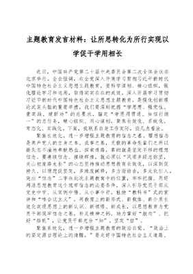 主题教育发言材料:让所思转化为所行实现以学促干学用相长近日,中国共产党第二十届中央委员会第二次全体会议在北京举行。全会强调,在全党深入开展学习贯彻习近平新时代中国特色社会主义思想主题教育,要科学谋划、精心组织,强化理论学习和运用,取得实实在在的成效。深入开展学习贯彻习近平新时代中国特色社会主义思想主题教育,是强化创新理论武装头脑的重要举措,我们要深刻把握学思想、强党性、重实践、建新功的总要求,锚定学思用贯通、知信行统一的总任务,精心组织、用心谋划,聚焦长效化、系统化、常态化、实践化。下面,我联系自身工作实际,谈几点看法。聚焦长效化,进一步增强主题教育的信念之基。理想信念是共产党人的立身之本、成事之基,无数的革命先辈们之所以能矢志不渝地奉献热血、探索道路,靠的就是坚定不移的理想信念。要赓续信念、接续辉煌,就必须以风雨多经志弥坚,关山初度路尤长的心态坚持推动思想教育长效化,以深刻促持久、以理想促坚定,多维度阐释,多方面结合,多元化引入,突出信念二字在此次主题教育中的位置,牢牢把握、用好用活思想教育这个筑牢信念的必要条件,深入引导党员干部从党史中学、从实例中悟、从小事中行,杜绝教科书式的宣讲和唯会议主义,用教育上的新形式、新载体、新介质长效化实现思想上的新认识、新领悟、新成长,以思想教育为党员干部筑牢信念之基,补足精神之钙,助力掌好航向、把好船帆,让党员干部充分知,坚定信。聚焦系统化,进一步增强主题教育的政治自觉。政治上的坚定源自理论上的清醒。要走好中国特色社会主义道路、守住来之不易的成果、开拓伟大复兴的未来,让主题教育的成效最大化,就必须深入推进对党员干部的理论教育,把特写留给道路,将生机注入理论。一是要坚持系统推进,采取课前自学原文、课余探讨研究、课中专家讲解、课后开展阶段性考核、组织实践印证的形式,形成学习、讨论、探究和实践印证相统一的系统性学习,促成准确的认知和清晰的理解。二是要坚持学用结合,既要学深理论、弄懂来源、悟透奥义,也要举一反三、知行合一,避免理论倒背如流,实践一团乱麻的现象发生。如此方能以全副武装的姿态,不断增强迎接风险挑战的能力和化解困难阻碍的智慧,在正确的道路上披荆斩棘、一往无前。聚焦常态化,进一步增强主题教育的清廉本色。逆水行舟用力撑,一篙松劲退千寻。一个政党,只有以刀刃向内的决心不断自我净化,才能永葆先进性和纯洁性。全面从严治党、严肃纠治四风、全力遏制腐败,就如逆水行舟,不进则退,进的效益显现于无形之中,退的危害却立竿见影。在此次主题教育中,要常态化加强纪律教育,标明红线、划清底线,驰而不息、久久为功,让廉政思想成为干部心中的磐石。把纪律教育同信念教育、理论教育相结合,以身边的鲜活案例作警示,以扎实的理论学习掸灰尘,以伟大的理想信念醒人心,通过动之以情,晓之以理,示之以警的方式让党员干部照身正帽;用好廉政讲堂、落马干部面对面等新教育形式,以前车之鉴醒后事之师,消除疲倦心理、鞭策懈怠心理、遏制侥幸心理,让党员干部撑好船篙,行稳致远。聚焦实践化,进一步增强主题教育的实干能力。方向不对,努力白费。实干不等于蛮干,既要找准点位发力、瞄准方向发力、锚定目标发力,也要善于出巧力、敢于出猛力。落实主题教育,要明确学思用贯通、知信行统一的根本任务,坚持实践化方法教育,注重强调苦干、实干、巧干,引导学习方式、方法、策略。一方面,要以扎实的学习筑牢理论基础,以马克思主义哲学推动世界观和方法论的统一,用好调研、课堂、培训等重要手段,传经验、授方法,让干部做到腹有良策。另一方面,要秉持学中干,干中学的理念,一边宣传典型,一边带头实践,引导党员干部牢固树立实干意识、实干精神、实干担当,采取多种途径营造干事创业的良好环境,推动形成你追我赶的实干氛围,在不断地试错、纠错的过程中,练就独门绝技。如此方能让所学服务于所用,让所思转化为所行,实现以学促干、以学促才。