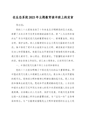在生态系统2023年主题教育读书班上的发言同志们:党的二十大报告总结了十年来生态文明建设的巨大成就,部署了未来五年乃至更长时期的战略任务,将人与自然和谐共生作为中国式现代化的重要特征之一,将尊重自然、顺应自然、保护自然,纳人全面建设社会主义现代化国家的内在要求,集中体现了党中央全面提升生态文明、建设美丽中国的坚定决心和坚强意志,使我们生态环境系统干部倍感光荣和自豪,我们要认真学习、细心领会、狠抓落实。下面围绕读书班学习内容,结合自身工作实际,谈几点心得体会,以供同志们参考。一、中国式现代化离不开人与自然和谐共生党的二十大报告明确了中国式现代化的五个重要特征,即中国式现代化是人口规模巨大的现代化,是全体人民共同富裕的现代化,是物质文明和精神文明相协调的现代化,是人与自然和谐共生的现代化,是走和平发展道路的现代化。人与自然和诺共生是以习近平同志为核心的党中央深刻把握人类社会发展规律,在准确认识人与自然、保护与发展、环境与民生等辩证统一关系基础上所作出的重要论断,与五位一体总体布局相吻合,与全面建成富强民主文明和谐美丽的社会主义现代化强国目标相衔接。生态兴则文明兴,建设人与自然和谐共生的现代化是中国式现代化的必然选择,是以习近平同志为核心的党中央对中国特色社会主义生态文明建设认识的新突破,把促进人与自然和请共生提升到更高层次上推动人类现代化进程的道路选择。二、人与自然和谐共生的高质量发展新格局初步构建党的十八大以来,以习近平同志为核心的党中央牢固树立和践行绿水青山就是金山银山的理念,站在人与自然和谐共生的高度谋划发展,以前所未有的力度抓生态文明建设,全党推动绿色发展的自觉性和主动性显著增强。坚持山水林田湖草沙一体化保护和系统治理,全方位、全地域、全过程加强生态环境保护,实现了一系列历史性变革,解决了许多长期想解决而没有解决的难题,办成了许多过去想办而没有办成的大事,力度之大、措施之实、收效之快前所未有,生态环境保护发生了历史性、转折性、全局性变化,正在走出一条人与自然和诺共生的中国式现代化道路人不负青山,青山定不负人。我国把生态文明建设摆在全局工作的突出位置,走出了一条生产发展生活高裕、生态良好的文明发展道路。十年来,单位GDP二氧化碳排放下降34.4%,以年均3%的能调消费增速支撑了年均6.5%的经济增长。到2020年,我国煤炭占一次能源的比重下降至56.8%,清洁能源占比达24.3%。光伏、凤能装机总量、发电量均居世界首位,新能源汽车销售量约占全球42%,是全球能相强度降低最快的国家之一,基本上扭转了二氧化碳排放快速增长的局面,污染防治攻坚战各项阶段性目标任务全面圆满超额完成,生态环境得到是著改善,正在走出一条人与自然和谐共生的中国式现代化道路我国的天更蓝了、水更清了、地更绿了习近平总书记三次来陕考察,生态环境保护是始终不变的关注重点。总书记强调:**生态环境保护,不仅关系到自身发展质最和可持续发展,而且关系到全国生态环境大局。以功成不必在我的脑怀,把秦岭生态环境保护和修复工作摆上重要位置履行好职责,当好泰岭生态卫士。要深入贯彻绿水青山就是金山银山的理念,把生态治理和发展特色产业有机结合起来,走出一条生态和经济协调发展人与自然和谐共生之路。习近平总书记对**生态环境保护的高度重视和深切关怀,体现了总书记对家乡炽热的民生情怀。作为一名生态环保工作者。自己见证了这十年来美丽**建设走过的非凡历程,始终以强烈的使命担当意识,积极投身三秦大地生态文明建设,深人参与美丽**生动实践。近十年来,在习近平生态文明思想的科学指引下,全市各地市各部门牢记总书记的殷股嘱托,紧盯推动生态环境质量持续好转这一根本要求,攻坚克难、担当作为自觉强化和拓展生态环境保护工作的力度、广度、深度,全市生态环境保护发生历史性、转折性、全局性变化。可以说,过去十年,是**生态环境保护事业发展史上具有里程碑意义的十年,全市对人与自然和谐共生的认识程度之深、污染治理力度之大、制度出台频度之密、执法督察尺度之严、环境改善效果之好前所未有,人民群众的生态环境获得感、幸福感、安全感显著提升,人与自然和谐共生的高质量发展格局初步构建。三、为建设人与自然和谐共生的美丽**不懈奋斗生态环境保护是生态文明建设的主阵地,作为生态环境系统的领导干部,学习党的二十大精神必须走在前、做表率。带著着信念学、带着感情学、带着使命学,在学懂弄通做实上下功夫,为促进人与自然和谐共生而不懈奋斗。当前,我市生态环境质量虽呈现持续好转的良好态势,但产业结构偏重、能源结构偏煤、两高行业占比偏大的格局短期内难以实现根本转变,生态环境保护结构性、根源性、趋势性压力总体上尚未根本缓解,环境质量持续改善的基础仍不牢固,人与自然和谐共生的形势依然严峻。在新征程上,我们要努力推动**加
