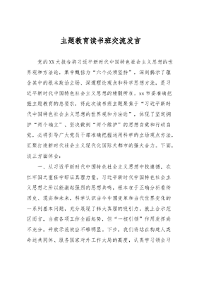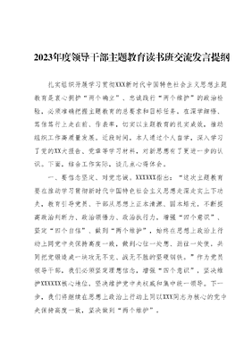 2023年度领导干部主题教育读书班交流发言提纲扎实组织开展学习贯彻XXX新时代中国特色社会主义思想主题教育是衷心拥护两个确立、忠诚践行两个维护的政治检验,必须准确把握主题教育的总要求和目标任务,在深学细悟、笃信笃行上走在前、作表率,切实以主题教育的扎实成效,推动组织工作高质量发展。近段时间,本人通过个人自学,深入学习了党的XX大报告、党章等学习材料,对新思想有了更进一步的认识。下面,结合工作实际,谈几点心得体会。一、要信念坚定、对党忠诚。XXXXXX指出:这次主题教育要在推动学习贯彻新时代中国特色社会主义思想走深走实上下功夫,教育引导党员、干部从思想上正本清源、固本培元,不断提高政治判断力、政治领悟力、政治执行力,增强四个意识、坚定四个自信、做到两个维护,始终在思想上政治上行动上同党中央保持高度一致,做到心往一处想、劲往一处使,共同把党锻造成一块攻无不克、战无不胜的坚硬钢铁。作为党员领导干部,我们必须坚定理想信念,增强四个意识,坚决维护XXXXXX核心地位,坚决维护党中央权威和集中统一领导。下一步,我们将继续在思想上政治上行动上同以XXX同志为核心的党中央保持高度一致,坚决做到两个维护。二、要勇于担当、善于作为。XXXXXX指出:能者多劳是我们党的优良传统。过去我们县在推进教育公平方面,组建了教育督导队,深入农村调查研究,发现一些贫困地区学校设施简陋师资力量不足。我们迅速采取措施,先后投入资金1.5亿元,改善100所贫困地区学校的教学条件和师资队伍建设,让更多孩子享有公平而有质量的教育。这充分体现了我们广大党员干部的担当精神和作为作风。作为党员领导干部,我们必须坚持真抓实干的作风,勇于担当作为,以实际行动解决好人民群众最关心最直接最现实的问题。下一步,我们将继续深入基层调查研究,找差距抓落实,推动解决影响群众切身利益的突出问题。三、要坚持原则、敢于斗争。XXXXXX指出:我们党来自斗争,也将在斗争中发展壮大。我们县广大党员干部在学习贯彻XXX新时代中国特色社会主义思想中,坚持原则,增强斗争精神,坚决反对各种错误思想和行为。如我们县在推进作风建设中,对一些违反中央八项规定精神的行为,我们坚决予以纠正,并通过典型案例警示教育,坚决反对特权思想和特权现象。这充分体现了我们广大党员干部敢于斗争的政治品格。作为党员领导干部,我们必须坚持原则,坚决同一切损害党的利益、人民群众利益的行为作斗争。下一步,我们将继续加强作风和纪律建设,坚决反对形式主义、官僚主义,坚决反对腐败,以实际行动践行初心使命。四、要严守规矩、不逾底线。XXXXXX指出:我们党必须管党治党,从严治党。我们县广大党员干部在学习贯彻XXX新时代中国特色社会主义思想中,严格遵守党的政治纪律和政治规矩,坚决防止政治蜕变。如我们县在开展主题教育中,我们对一些基层党组织和党员存在的问题,我们坚持教育救治为主,区分情况给予帮助,而对一些严重违纪问题则坚决零容忍。这充分体现了我们广大党员干部严守政治纪律和规矩的政治自觉。作为党员领导干部,我们必须严格遵守党的政治纪律和政治规矩,做到心中有党,言行一致,确保党的路线方针政策和决议部署在我们县全面贯彻执行。下一步,我们将继续加强党的政治建设,严明政治纪律和政治规矩,坚决防止政治蜕变,确保党在新时代的强盛正能量永远涌流。让我们在学习贯彻XXX新时代中国特色社会主义思想中,不断提高政治判断力、政治领悟力、政治执行力,以时不我待、只争朝夕的精神,为全面建设社会主义现代化国家而不懈奋斗!