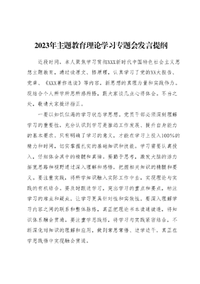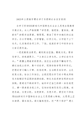 2023年主题教育理论学习专题研讨会发言提纲自学习贯彻XXX新时代中国特色社会主义思想主题教育开展以来,本人严格按照学思想、强党性、重实践、建新功的要求读原著、悟原理,通读了党中央确定的必读书目,在以学铸魂、以学增智、以学正风、以学促干上下功夫,扎实推进各项工作。下面,我就在学习中的体会与大家汇报交流。一是提高政治素质,做到政治坚强,勤政为民。要深化学习,淬炼凝聚力。立身以立学为先,立学以读书为本。根据主题教育的要求,我们应当坚持不懈地学习,通过自我主动学、集中讨论学、现场体验学等多种形式,把理论学习融入日常、抓在经常。应当联系实际学,立足发展大局,结合工作岗位,自觉把理论学习的丰硕成果转化为绘制宏伟蓝图的澎湃动能,转化为奋进新征程的生动实践。要通过不断的学习,始终牢记自己的第一身份是党员、第一职责是为党工作,任何时候都同党同心同德,对党忠诚、为党分忧、为党担责、为党尽责。要坚定不移地用XXX新时代中国特色社会主义思想凝心铸魂,从思想上正本清源、固本培元,通过锤炼党性,把两个维护建立在笃学笃信笃行上,使我们党具有统一的思想、坚定的意志、协调的行动、强大的战斗力。要提升政治忠诚。XXX新时代中国特色社会主义思想不仅包含着党治国理政的重要理论和方略,也贯穿着党员的政治品格、价值追求、作风操守和精神境界,蕴藏着深厚的真理力量、实践力量、人格力量。作为党的刀把子,讲政治是第一属性,我们必须转化学习内容,真正以学铸魂,打牢思想的根基,强化政治意识,为民服务的宗旨意识等。二是增强学习意识,做到勤于思考,勇于探索。马克思主义认为,理论来源于实践,又反过来对实践具有指导作用。在新征程上,各级党员干部肩负的使命更加繁重艰巨,这就更加需要用更多的正确理论来武装头脑,推动各项工作的圆满完成。当前,少数党员干部在落实上级党委决策、推动地区经济社会发展上还存在行动不快、办法不多、质量不高等现象,原因是多方面的,但工作能力欠缺是一个重要因素。所以,要将学习党的创新理论作为重中之重,通过政治历练、实践锻炼和专业训练,主动参与一场理论学习的激烈竞赛,解放思想观念,提升工作水平。要突出问题导向,重点关注学习是否认真、系统,理解是否完整、准确,落实是否坚决、有力。从思想、工作、作风等方面,我们都要查不足、找差距、明方向、抓落实,以确保各项任务圆满完成,以优异的成绩回报XXXXXX的关心关怀和殷切期望。三是强化纪律观念,做到坚持原则,秉公执纪。在前进的道路上,全面从严治党永远不会停歇。XXXXXX强调:要时刻保持解决大党独有难题的清醒和坚定,勇于自我革命,坚定不移地全面从严治党,坚定不移地反对腐败,始终保持党的团结统一,确保党永远不变质、不变色不变味,为强国建设、民族复兴提供坚实的保障。自我革命是先进马克思主义政党的显著特征。自党的十八大以来,以XXX同志为核心的党中央一直致力于推进党风廉政建设和反腐败斗争,以得罪千百人,不负十四亿的坚定决心,成功走出了一条依靠制度优势和法治优势的反腐败之路。通过主题教育,党员干部要深入贯彻新时代党的建设总要求,以党的政治建设为统领,全面提升党的各方面建设,始终保持赶考的清醒和坚定;增强纪律意识、规矩意识,持续纠正四风,特别把纠正形式主义、官僚主义放在更加重要的位置,做到公正用权、依法用权、为民所用、廉洁用权,推动形成清爽的同志关系、规范的上下级关系、亲清的新型政商关系,做好良好政治生态和社会风气的引领者、营造者、维护者;坚决整治群众身边的腐败和作风问题,全面推进不敢腐、不能腐、不想腐,以伟大的自我革命引领伟大的社会革命。