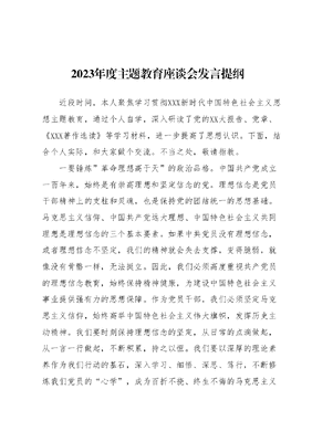 2023年度主题教育座谈会发言提纲近段时间,本人聚焦学习贯彻XXX新时代中国特色社会主义思想主题教育,通过个人自学,深入研读了党的XX大报告、党章、《XXX著作选读》等学习材料,进一步提高了思想认识。下面,结合个人实际,和大家做个交流。不当之处,敬请指教。一要锤炼革命理想高于天的政治品格。中国共产党成立一百年来,始终是有崇高理想和坚定信念的党。理想信念是党员干部精神上的支柱和灵魂,也是保持党的团结统一的思想基础。马克思主义信仰、中国共产党远大理想、中国特色社会主义共同理想是理想信念的三个基本要素。如果中共党员没有理想信念,或者理想信念不坚定,我们的精神就会失去支撑,变得脆弱,就像没有骨骼一样,无法挺立。因此,我们必须高度重视共产党员的理想信念教育,始终保持精神健康,为建设中国特色社会主义事业提供强有力的思想保障。作为党员干部,我们必须坚定马克思主义信仰,始终高举中国特色社会主义伟大旗帜,发挥历史主动精神。我们要时刻保持理想信念的坚定,从日常的点滴做起,从一言一行做起,不断积累,持之以恒。我们要以深厚的理论素养作为我们行动的基石,深入学习、细悟、深思、笃行,不断修炼我们党员的心学,成为百折不挠、终生不悔的马克思主义战士。我们的行动必须以国家利益为重,以民族利益为魂,不断推动党和人民的伟大事业向前发展。只有坚定信仰,把握历史主动,不断修炼自身,才能更好地履行党员干部的职责,为党和人民的事业不断作出贡献。二要彰显岂因祸福避趋之的铁血担当。显担当、抓落实是党的政治路线、思想路线、群众路线的根本要求,也是衡量领导干部党性和政绩观的重要标志。自学习贯彻XXX新时代中国特色社会主义思想主题教育全面启动以来,广大党员干部从XXX新时代中国特色社会主义思想中汲取奋发进取的智慧和力量,提高担当作为、干事创业能力水平,用心用力解决好群众之盼、改革之难发展之需中的急难愁盼问题,以新气象新作为新成效打开事业发展新天地。新征程是充满光荣和梦想的远征,没有捷径,唯有实干。在前进的道路上,我们面临着许多重大的挑战、风险、阻力和矛盾。为了克服这些困难,我们需要依靠学习和实践来提升能力和担当。广大党员和干部应该从XXX新时代中国特色社会主义思想中汲取智慧和力量,掌握其中的领导方法、思想方法和工作方法,提高履职尽责的能力和水平。只有凝心聚力、不懈努力,才能推动中国式现代化取得新的进展和突破,充分展现XXX新时代中国特色社会主义思想鲜明的实践品格。虽然道路可能很短,但如果你不迈出脚步,就无法到达目的地;事情可能很小,但如果你不付诸实践,就无法取得成功。担当作为需要真抓实干、埋头苦干,不能只是空谈。在强国建设和民族复兴的新征程上,我们应该学习思想、加强党性、注重实践、建立新功,每一步都要将党的XX大作出的重大决策部署付诸行动,取得可见的成效。只有这样,我们才能创造出经得起历史和人民检验的实绩。三要追求心无百姓莫为官的崇高境界。XXX同志一贯强调心无百姓莫为官,要求广大干部牢记凡是为民造福的事一定要千方百计办好,坚持把对上负责与对下负责一致起来,始终与人民心在一起、苦在一起、干在一起。这些点点滴滴可亲可感,需要我们认真学习体会并真正转化运用到为民服务的新时代实践中去。作为党员干部,我们要勇于履行好自己的职责,心里要时刻装着群众,想着群众,所谓群众事无小事。更要深知基层工作事关百姓安全,事关党和政府的形象,我们在处理工作的时候,要正确看待得失,把逆境和挫折看作人生阅历的财富,把服务群众摆在首位,工作中要明确目标,端正态度做到无惧无畏,沉着冷静,竭尽全力为老百姓多办实事,办好事。我就讲这些,谢谢。