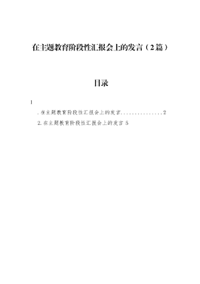 在主题教育阶段性汇报会上的发言(2篇)目录1.在主题教育阶段性汇报会上的发言22.在主题教育阶段性汇报会上的发言5在主题教育阶段性汇报会上的发言深入开展学习贯彻XXX新时代中国特色社会主义思想主题教育是党的XX大作出的重大战略部署,对于统一全党思想、解决党内存在的突出问题、始终保持党同人民群众血肉联系、推动党和国家事业发展具有重要意义。市科协党组认真落实党中央决策部署和市委工作安排,以学铸魂、以学增智、以学正风、以学促干,扎实有力推动党的XX大精神在科协系统落地生根。一、做到三个突出,加强政治建设。一是突出第一议题。树牢政治机关意识,落实党组会议第一议题和中心组学习核心内容,把学习贯彻党的XX大精神同XXXXXX历次来陕考察重要讲话重要指示批示、同XXXXXX关于科技创新、科学普及和科协工作的重要论述精神贯通起来,深刻感悟XXX新时代中国特色社会主义思想的强大真理力量和实践伟力,更加坚定拥护两个确立、坚决做到两个维护。二是突出政治引领。强化政治引领主责,实施弘扬科学家精神工程,开展市全国科技工作者日系列活动,团结带领科技工作者坚定不移听党话、跟党走。与市科学院党组开展中心组联学,举办市科技界学习宣传贯彻党的XX大精神研修活动,使理论学习的范围更广、程度更深、氛围更浓、效果更好。三是突出阵地建设。坚持以党建带组织建设,深入实施组织建设扎根扩面行动,成立市科协社会组织党建工作指导委员会和社会组织党委,推深做实所属市级学会党建工作。成立市科协党校,举办学习贯彻党的XX大精神培训班、科协党校领航计划着力提升科协干部八大本领七种能力二、做好三个坚持,强化理论武装。一是坚持以上率下。市科协党组切实担负起中心组学习主体责任,党组书记认真履行第一责任人职责,安排部署中心组方案,带头学习研讨,指导基层党组织和青年理论小组学习。中心组成员积极发挥示范表率作用,带动党员干部大兴学习之风。举办主题教育读书班,开展沿着XXX足迹看变化悟思想实践研学活动,中心组举行交流研讨,着力锤炼党性、筑牢对党忠诚。二是坚持一体两翼协同。召开市科协九届二次全委会、常委会对学习贯彻党的XX大精神和XXXXXX重要讲话重要指示精神作出安排,推进全市科协系统一体两翼贯彻落实。召开全市科技工作者代表座谈会,市区科协负责人座谈会,市级学会、企事业科协负责人培训班,充分发挥科协组织作为推进科技创新的重要力量和科普工作的主要社会力量的作用。三是坚持强学风正作风。在民主生活会、主题教育研学等工作中,坚持把开展学习研讨放在前,切实统一思想、增强团结、强化使命、改进工作。结合三个年活动,深入开展市科协六比六看六做活动,全面锻造政治过硬、组织过硬、作风过硬机关。三、做实三个聚焦,提升学习成效。一是聚焦服务高质量发展。坚持围绕中心、服务大局主线,进一步履行好四服务职责,紧密围绕我市x大支柱xx个产业领域xx条重点产业链,深化实施助力建设xxxxx工程、百会百校助千企行动等,服务高质量发展,为奋力谱写中国式现代化建设篇章作出积极贡献。二是聚焦为民服务。坚守为科技工作者服务的工作生命线,以调研开路,将中心组学习课堂下沉到一线。深入了解基层科普工作、学术交流、组织建设学会党建等方面的情况,吃透弄准科技工作者最迫切、最现实的需求,推动解决相关问题。指导成立市女科技工作者协会,举办首届市科协年会,服务科技工作者创新创业。三是聚焦破解难题。对标对表党的XX大各项部署,落实市第十四次党代会要求和市科协九大安排.聚焦服务四个经济、建设双中心,重新审视科情会情,找准找实制约科协事业发展的难点、科技工作者关注的热点,坚持理论联系实际的学风,推动解决党建业务两张皮、学用两张皮、科技经济两张皮问题,以x大类xx个重点支持专项推动解决问题落地见效。在主题教育阶段性汇报会上的发言主题教育开展以来,x市民政局党组紧扣学思想、强党性、重实践、建新功的总要求,坚持把理论学习、调查研究、推动发展、检视整改贯通起来,有机融合、一体推进,各项工作取得明显成效。现将有关工作进展情况汇报如下:坚持政治统领,将理论学习贯穿主题教育始终。抓实局党组会第一议题制度,坚持读原著、学原文、悟原理,深入学习XXXXXX关于民政工作的重要讲话和重要指示批示精神,局领导、局直属机关党支部书记累计上党课x次,举办主题党日活动x次,评选发布青年优秀微党课x个,真正做到学深悟透融会贯通、真信笃行。一是学出坚定信仰。坚持用科学理论武装头脑、指导实践,通过党组带头学、中心组集中学、支部跟进学、专家辅导学、沉浸体验学等方式,推动党员干部深刻领悟党的创新理论的真理力量和实践伟力,增进政治认同、思想认同、理论认同、情感认同。举办