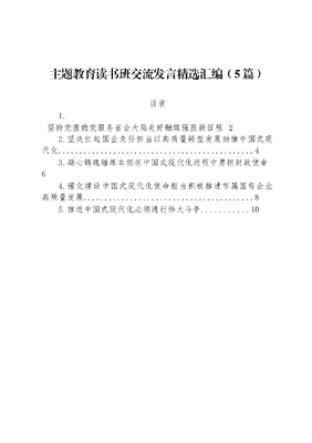 主题教育读书班交流发言精选汇编(5篇)目录1.坚持党报姓党服务省会大局走好融媒强报新征程22.坚决扛起国企责任担当以高质量转型发展助推中国式现代化.43.凝心铸魂锤炼本领在中国式现代化进程中勇担财政使命64.强化建设中国式现代化使命担当积极推进市属国有企业高质量发展.85.推进中国式现代化必须进行伟大斗争..10坚持党报姓党服务省会大局走好融媒强报新征程经过一个时期以来的学习思考和专题读书班的集中研讨,对中国式现代化的主题主线、性质方向、中国特色、本质要求、重大原则等有了更为深刻的体会认识。结合思想工作实际,汇报几点认识和体会。一、坚持政治统领,强化党建引领,把党媒姓党的要求落到实处。报业集团坚持把正确的政治方向放在首位,坚持党管宣传、党管媒体、党管意识形态。认真开展好主题教育,引导党员干部将主题教育的成果转化为融媒强报、推动高质量发展的新动能。在党建业务融合上下功夫,依托时政融媒工作室、理响泉城工作室等,做到党建引领、新闻出新、项目出彩同向发力、同频共振,实施党建+品牌创建行动,突出青年理论人才培养,强化融媒复合型队伍建设,为推动主力军挺进主战场、打赢主动仗提供有力支撑。二、服务中心大局,广泛凝心聚力,为推进中国式现代化济南实践营造良好舆论氛围。报业集团将围绕强新优富美高新时代社会主义现代化强省会建设目标组织好主题宣传,反映各条战线干部群众的感人事例、典型经验和良好精神风貌;针对经济社会发展的热点问题,积极引导经营主体增强发展信心、稳定社会预期,为推动经济运行实现整体好转提供舆论支持。建立正能量大V特战队,用网言网语讲好济南故事。三、坚守人民立场,坚持两个统一,把以人民为中心的发展思想贯穿新闻舆论工作全过程。报业集团将当好党的喉舌,反映人民心声。深化融通建设新时代文明实践中心、融媒体中心,拓展媒体融合+文明涵养+社会治理全新宣传舆论工作路径,打通服务群众的最后一公里,更好地凝聚群众、引导群众。四、丰富载体手段,增强外宣效能,着力提升济南海外知名度影响力。今年是济南日报创刊75周年、济南国际传播中心建成一周年。报业集团将聚焦城市功能定位,着力提升自主可控平台的软硬件水平,多语种向全球传播济南好声音、讲述济南好故事。积极拓展海外传播渠道,加强对外话语创新,增强海外受众对济南对外话语体系的认同感。五、致力改革发展,推进融合创新,让正能量澎湃大流量报业集团将秉持互联网思维,不断探索媒体融合路径,优化全媒体传播生态,构建一体化传播格局。加大机制体制创新力度,全面架构和丰富媒体融合发展顶层设计。突出差异发展,推动主流媒体在移动端进场、站位、发声、主导。持续推进新黄河客户端建设,持续擦亮爱济南客户端的党端标签。下一步,报业集团将严格按照党中央部署要求和省委、市委主题教育工作安排,以深入开展主题教育为契机,勇当全媒体传播体系建设排头兵,在赋能城市高质量发展、助力中国式现代化济南实践中贡献报业智慧和力量。坚决扛起国企责任担当以高质量转型发展助推中国式现代化在今后工作中,将准确把握中国式现代化这个时代命题,深入贯彻新发展理念,主动服务和融入新发展格局,勇当高质量发展的压舱石助推器,以实际行动落实好中国式现代化的各项要求。一、坚持党建引领,筑牢国企发展的根和魂。我们将深入推进党的领导融入公司治理,更好发挥企业党委把方向、管大局、促落实的作用。扎实开展党建品牌创建活动,让基层党建更具活力。坚持严的主基调不动摇,保持永远吹冲锋号的战斗姿态,一体推进三不腐。持续深化企业纪检监察体制改革,加强廉洁文化建设,巩固发展风清气正的良好政治生态。二、倾力保障民生,彰显国企为民服务本色。我们将把保障改善民生作为重要着力点,自觉践行社会责任。坚持项目为王,确保跨黄桥隧、起步区、科创城、机场二期等重点项目如期实现节点目标。高质高效推进安置房、市政道路、教育配套等项目。勇于攻坚克难,以钉钉子精神破解产权证办理等历史遗留问题,切实解决民生堵点、难点。用心倾听民声,借助12345市民服务热线、媒体问政等平台,擦亮集团民声回响品牌。三、持续深化改革,释放企业内生发展动能。我们将用好改革关键一招,落实好新一轮国企改革深化提升行动,不断提高企业核心竞争力、增强核心功能。聚焦完善中国特色国有企业现代公司治理,真正按市场化机制运营。聚焦三项制度改革,注重年轻干部培养,加强职业经理人队伍建设,有序推行竞争上岗。聚焦内控体系改革,统筹推进战略管控、业务管控、财务管控、监督管控等,织密企业改革发展安全网。四、强化产业支撑,促进企