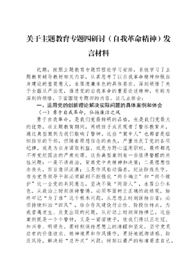 关于主题教育专题四研讨(自我革命精神)发言材料近期,按照主题教育专题四理论学习安排,系统学习了主题教育辅导教材相关内容,认真思考了以自我革命精神加强自身建设的重要意义,永葆清廉本色的具体要求,深刻领悟了关于全面从严治党,推进党的自我革命的重要论述精神,有较为深刻的领悟,下面围绕专题四的内容,谈几点体会:一、运用党的创新理论解决实际问题的具体案例和体会(一)勇于自我革命,弘扬廉洁之风勇于自我革命,是我们党最鲜明的品格,也是我们党最大的优势,在主题教育期间,两级班子成员观看了警示教育片,通过典型案例为我们敲响了警钟。这些案中人也都曾是组织信任的干部,但随着理想信念的丧失,严重违反了党的各项纪律,或是为自身谋取利益,或是为野心滥用职权,最终都逃不开党纪国法的严肃处理。这些典型案例有一些值得警醒的共性问题:一是不讲政治,背离党中央精神和决策;二是理想信念丧失,宗旨意识淡漠;三是作风松动偏差,纪法防线失守。作为党员领导干部必须做到不断强化两个确立和两个维护这一全党的共同意志,坚决不做两面人,永葆公仆本色,从政治上时刻保持警惕。必须牢固树立正确的政绩观,始终牢记为了谁这个根本问题,从思想上时刻保持自省;必须持续纠治四风,结合作风建设行业性、阶段性特点,力戒普遍发生、反复出现的问题,从行动上时刻保持律己。这些案例既是一个个警钟,又是一面面镜子,使我们得以正衣冠、知兴替、明得失。要时刻保持思想上的清醒和坚定,坚守党员应有的价值追求、精神境界和作风操守,更好地抵御诱惑、防范风险,解决好总开关问题;时刻以最严的标准要求自己,严格遵守党的政治纪律和政治规矩,在生活上和工作中都守住底线,不越红线,做到明大德、守公德、严私德,以身作则、廉洁自律;时刻弘扬清正廉洁之风,管好身边人,加强家风家教建设,真正做到以党风兴社风民风,带头涵养风清气正的政治环境。(二)坚定理想信念,夯实文化根基理想信念是立党兴党之基,也是党员的安身立命之本。主题教育第四专题就着重要求我们坚持以党性立身做事,贯彻以学正风要求,就是要我们党员干部从主题教育中汲取廉洁力量,始终坚定理想信念,提升党性修养。今年以来,全处上下勠力同心,勇挑重担,完成了一个个看似难以完成的任务,取得了一个个令人备受鼓舞的成效,这些成绩的取得就是得益于思想的正确指引,得益于对党忠诚的政治品格的不断淬炼,得益于以学促干的有效转化,得益于风清气正的干事氛围的有效熏陶。我们要努力培养廉洁文化,做到始终保持清廉之风,培养正确的权力观,做到权为民所用、情为民所系,利为民所谋,这是我们推动工作开展的着眼点和发力点。眼下,各单位正在积极开展廉洁文化建设,通过文化墙等开展广泛宣传,促进党员、干部在润物细无声之中养成行动自觉,在潜移默化中提高党员、干部和群众的思想觉悟和道德水平,并由此形成了公私分明、崇廉拒腐、尚俭戒奢、甘于奉献等积极健康的廉洁文化,进而织密倡廉促廉、反腐防腐的思想防线。(三)强化执纪监督,永葆清廉本色党风廉政建设和反腐败斗争永远在路上,一刻也不能放松打破行业潜规则,转变外界对xx行业水深的看法,就要在接受群众监督和严格自我监督两方面同向发力。作为党委书记,需要带领领导班子切实担负起全面从严治党主体责任,担起自身第一责任人责任,保持正视问题的自觉和刀刃向内的勇气,切实以人民群众的利益为重,赢得群众的信任与支持。上半年以来,处党委切实强化监督执纪,始终把纪律挺在前面,共开展全覆监督检查x次,进行提醒谈话x人,警示谈话x人,批评教育x人,切实体现了严管就是厚爱,对发现的苗头性,倾向性问题,强化第一种形态的精准运用。二、检视查找存在的突出问题(一)学用结合不够紧密。运用思想的立场、观点、方法来分析、研究和解决问题的能力还不足,有时有求稳思想,推动工作步子迈得不够大,对于深层次问题触及得不够多,与从严治党要求还有差距。(二)全面强化从严治党,综合施策力度不大。面对日益复杂的外部环境和风险挑战,如何有效强化全面从严治党的新思路不多。聚焦当前党员干部存在的突出问题,统筹谋划、综合施策还不到位,在制度执行上效果还不明显。(三)工作措施不够精准。在持续推进从严治党过程中,一些具体的工作举措与基层实际结合还不够紧密,此次主题教育期间,通过调研进一步了解到很多具体的情况,同时也更加感受到平日里俯下身子、深入基层的频次还应加强,解决问题、推动工作的措施才能更加符合xx实际。三、下一步工作方向(一)强化理论武装。坚持把思想政治建设摆在首位、贯穿始终,把学习领会思想和关于从严治党、推进党的自我革命的重要论述精神融会贯通,注重理论联系实际,坚持学以致用,提高履职能力。(二)强化宗旨意识。树立正确的权力观、政绩观、事业观,坚持深实细准效的工作作风,做到一杆子插到底、以务实态度抓实调查研究,到
