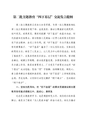 第二批主题教育四下基层交流发言提纲第二批主题教育正在如火如荼开展,与第一批主题教育相比第二批主题教育层级下移、直抵基层,推动主题教育扎根更深、枝叶更茂、成果更实,要深刻把握四下基层的基本内涵、时代价值和实践要求,深切感悟人民领袖一以贯之的深厚为民情怀实干担当精神、务实工作作风,把四下基层作为开展主题教育的重要抓手。四下基层蕴含了一切从实际出发、实事求是的思想方法,彰显了人民至上、以人民为中心的价值追求,体现了真抓实干、求真务实的责任担当,对于转变干部作风、密切联系群众,破解工作难题、推动高质量发展,加强党的建设、做好各方面工作等,都具有重要意义。广大党员干部要充分运用四下基层成功经验,坚持实字落脚,持续解民忧、顺民心,着力提升群众幸福感和满意度,推动四下基层工作制度落地生根、开花结果,以实际行动坚定拥护两个确立、坚决做到两个维护。一、坚持为民导向,把四下基层的要求贯通落实到主题教育各项重点措施之中,践初心、惠民生无论是主题教育学习,还是调查研究工作,我们的目的和落脚点,都是为了擦亮为人民谋幸福的奋斗成色、转化为推动高质量发展的澎湃动力。党员干部当牢固树立人民至上的崇高理想,贴近群众、依靠群众,站稳人民立场,走好群众路线,把人民群众对美好生活的向往作为奋斗目标,确保为民的初心不变质、实干的底色不变色,时刻将人民的急难愁盼记在心上,时刻将为人民谋幸福的坚定信念刻在心里,不谋私、不怕苦,厚植为民情怀,践行初心使命,做好人民群众的勤务员。要将人民群众满意不满意、赞成不赞成、答应不答应为衡量尺度坚持边学习、边对照、边检视、边整改,查问题,找差距,时刻突出问题导向,把问题清单变成责任清单,奔着问题去带着问题学、对着问题改,不断地修正对齐,让人民群众真切地感受到主题教育带来的新变化,推动主题教育取得实实在在的成效。结合具体工作来说,四下基层把宣传党的理论和路线方针政策作为重大任务,把调查研究作为重要路径,把解决问题作为关键导向,把推动发展作为落脚点,其核心要求与主题教育重点措施高度吻合。具体来说,理论学习要通过党组理论学习中心组学习、读书班,组织党员领导干部围绕四下基层的精神内涵价值追求、制度方法以及典型案例等进行学习研讨;通过讲党课宣讲等方式,把XXX新时代中国特色社会主义思想讲活讲透,把党的路线方针政策讲清楚讲明白,推动党的创新理论飞入寻常百姓家。调查研究要扎实开展专题调研和典型案例解剖式调研,组织党员领导干部到困难多、群众意见集中、工作打不开局面的地方和单位,倾听群众呼声,摸清社情民意,察实情、出实招,提出解决问题、改进工作的办法举措。推动发展要把破难题、促发展,办实事、解民忧作为现场办公的重要内容,组织党员领导干部深入基层一线,紧盯发展所需、改革所急、基层所盼、民心所向的问题,现场研究、现场指导、现场协调,把问题解决在一线、矛盾化解在一线、工作落实在一线。检视整改要把群众信访和诉求作为发现问题的重要途径,组织党员领导干部开展下访接访,化解群众信访积案,对重要信访事项、信访突出问题和疑难复杂问题实行领导包案责任制,推动群众合理诉求及时就地解决建章立制要围绕践行四下基层,及时总结有效做法和成功探索,把好经验好做法转化为长效机制。二、坚持问题导向,运用四下基层制度解决好群众急难愁盼问题,解难题、促发展。新时代人民群众对美好生活的向往更为强烈,对物质生活和精神文化生活的要求也逐渐多样化,如何满足人民群众的新期盼新要求,让人民群众满意,离不开对民情的深入了解。党员干部要坚持问题导向,把调查研究当成做好各项工作的基本功和分内事,按照党中央、省委、市委提出的重点调研领域内容,与发展中需要着力解决的重点问题相结合,沉到一线、解剖麻雀,找到破解难题的办法。要坚持群众路线,真心与群众交朋友,认真倾听群众的呼声,真正做到听实话、察实情、取真经,从基层群众那里挖掘金点子好办法。要定期梳理群众反映的问题清单,及时确定服务群众的任务清单,跟踪形成任务落实的效果清单,把调查研究的成果成效写在人民群众的笑脸里。问题是时代的声音,也是工作的导向。我们要发扬担当精神和斗争精神,把传承践行四下基层与大兴调查研究紧密结合起来,与落实全区中心任务紧密结合起来,围绕推进高质量发展、乡村振兴幼小衔接、农村五治等重点调研课题,进一步健全机制,用改革思维创新办法,着力破解产业发展、项目建设、乡村振兴、社会治理等领域重难点问题,以一把钥匙开一把锁的精准务实举措破解发展新问题、打开发展新局面。要坚持把心贴近人民,运用四下基层制度,实实在在解决群众的烦心事操心事揪心事。要落实民呼我为、接诉即办机制,统筹各类民生项目和民生实事,推动解决就业、教育、医疗、托育、住房、养老等民生领域的