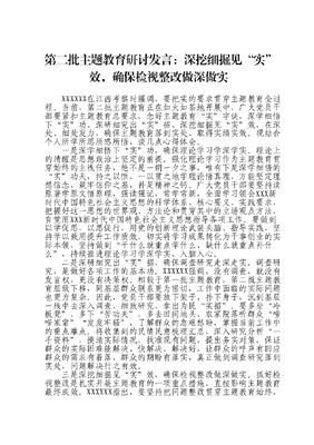 第二批主题教育研讨发言:深挖细掘见实效,确保检视整改做深做实XXXXXX在江西考察时强调,要把实的要求贯穿主题教育全过程。当前,第二批主题教育正在如火如荼地开展中,广大党员干部要紧扣主题教育总要求,念好主题教育实字诀,深学细悟下实功、深研细究出实招、深挖细掘见实效,在深处、细处发力,确保主题教育落到实处、取得实绩实效。现结合个人所学所思所感所悟,谈几点心得体会。一是深学细悟下实功,确保理论学习学深学实。理论上的清醒是思想政治上坚定的前提。强化理论学习作为主题教育贯穿始终的主线任务,绝不是一朝一夕之事,唯有下足深学细悟的实功夫,持之以恒、一以贯之地学理论悟真理,方能坚定理想信念,筑牢信仰之基,补足精神之钙。广大党员干部要坚持读原著学原文悟原理,强读强记,常学常新,全面学习领会XXX新时代中国特色社会主义思想的科学体系、核心要义、实践要求,把握好这一思想的世界观、方法论和贯穿其中的立场观点方法,自觉用XXX新时代中国特色社会主义思想指导各项工作。要做到以学促思,以思促行,用党的创新理论武装头脑、指导实践,坚持学以致用提升工作质效,切实将学习成果转化为干事创业的实际本领,坚持做到干什么就重点学什么、缺什么就重点补什么,持续推进理论学习学深学实、入脑入心。二是深研细究出实招,确保调查研究走深走实。调查研究,是做好各项工作的基本功。XXXXXX强调,没有调查,就没有发言权,更没有决策权。相较于第一批主题教育,第二批主题教育层级下移,同基层群众联系更为密切,工作中面临的实际问题也更为复杂。因此,党员干部要放下架子、扑下身子,沉到基层一线中去深入调查、细致研究,拿出为民实招。要多坐冷板凳,多下苦功夫,多去田间地头、农家院落听群众唠唠家常发发牢骚,了解群众的急难愁盼,掌握当前工作中的重点难点。将收集到的民情民意梳理汇总,深入研究分析一手资料,摸清实际情况,找准现有问题,提出务实对策,保证群众的实际困难能解决、快解决、解决好,让群众的呼声有回应群众的需求有着落、群众的期盼有落实,真正做到调查研究落到实处,问题解决行之有效。三是深挖细掘见实效,确保检视整改做深做实。抓好检视整改是扎实开展主题教育的一项重点措施,直接影响主题教育最终成效。XXXXXX指出,要坚持把问题整改贯穿主题教育始终,让人民群众切实感受到解决问题的实际成效。因此,广大党员干部要拿出深挖细掘的检改态度,从政治思想、党性修养、工作方法、纪律作风等方面深入剖析自我,积极主动检视自身查摆问题真正做到不掩盖、不回避、不推脱,不拿模棱两可的万能问题敷衍应付、不找无关痛痒的小问题虚晃一枪。对查摆出来的问题,要拿出刮骨疗毒的决心和狠劲,发扬共产党人最讲认真的精神,能立行立改的绝不拖泥带水,务实功、出实招,不折不扣抓好落实,短期难以解决的要紧盯不放,持续抓、深入抓,问题不解决不松劲、解决不彻底不罢休,确保整改落实到位推动主题教育见行见效。