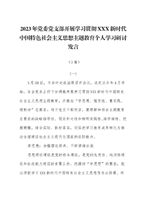 2023年党委党支部开展学习贯彻XXX新时代中国特色社会主义思想主题教育个人学习研讨发言(3篇)(一)3月30日,中共中央政治局召开会议,决定从今年4月开始,在全党自上而下分两批开展学习贯彻XXX新时代中国特色社会主义思想主题教育,并提出学思想、强党性、重实践、建新功总要求。对于党员干部而言,要理解和领会主题教育总要求的战略指导性、现实针对性和鲜明实践性,深学细悟、把握精髓,结合实际、抓好落实,切实把学习教育成果转化为推动全面建设社会主义现代化国家的实际能力。学思想:加强理论修养、不断修炼自我思想理论建设是党的根本建设,是党的先进性、纯洁性建设和执政能力建设的首要工作。把握好学思想的要求,就必须把学习XXX新时代中国特色社会主义思想作为必修课、终身课,努力掌握贯穿其中的立场观点方法,并用以武装头脑、指导实践、推动工作。要挤时间学,善于利用空隙,巧用线上平台,如饥似渴学,扎扎实实学,下一番真功夫、苦功夫、细功夫。要钻进去学,坚持读原著、学原文、悟原理,通过逐字逐句研读、横向纵向对比、历史现实印证,夯实思想根基。更要坚持理论联系实际,把自己摆进去、把职责摆进去、把工作摆进去,做到学思用贯通,知信行统一,在实践中学真知、悟真谛,加强磨练、增长本领。强党性:坚定政治信仰、永葆政治本色党性是党员干部立身、立业、立言、立德的基石。把握好强党性的要求,就必须修好共产党人的心学,从马克思主义理论渊源、党的百年奋斗历程、新时代取得的历史性成就和历史性变革中,深刻领悟两个确立的决定性意义,增强四个意识、坚定四个自信、做到两个维护。要拧紧理想信念总开关,时刻用党章、用共产党员标准要求自己,勤择思想尘、多思贪欲害、常破心中贼,以内无妄思保证外无妄动。要崇尚对党忠诚的大德,将其体现到对组织的忠诚上,对人民的忠诚上,对党的理论和路线方针政策的忠诚上,以实际行动擦亮共产党员的身份标签。重实践:用好调查研究、锤炼斗争品格实践是检验真理的唯一标准,也是检验好坏的试金石。把握好重实践的要求,就必须把基层一线当作成长成才的主阵地,将调查研究、检视问题、整改落实贯穿主题教育全过程。要拜人民为师、向人民学习,放下架子、扑下身子,采取四不两直方式,主动到车间码头、田间地头、市场社区亲自察看、亲身体验,做到干中学、学中干,学以致用、用以促学、学用相长。面对调查研究过程中出现的新问题、新情况,要坚定斗争意志,增强斗争本领,勇于涉险滩、破难题,知难而进、迎难而上,抓好调查研究成果转化,解决群众急难愁盼问题,真正让群众谋到幸福、得到实惠、感到满意。建新功:厚植家国情怀、庚续奋斗精神成绩已成过去,奋斗才有未来。把握好建新功的要求就必须接好强国建设、民族复兴的接力棒,不驰于空想、不鹭于虚声,把宏伟蓝图变成美好现实。人民是我们党的执政之基、力量之源,要胸怀两个大局,心系国之大者,把群众观点、群众路线深深植根于思想中、落实到实干上,始终为人民不懈奋斗、同人民一起奋斗,紧紧依靠人民创造新的历史伟业。要弘扬日拱一卒无有尽,功不唐捐终入海的精神,保持历史耐心和战略定力,做好每一件小事、完成每一项任务、履行每一项职责,积小胜为大胜,积珪步至千里,推动中华民族伟大复兴号巨轮乘风破浪、扬帆远航。中共中央政治局3月30日召开会议,决定从今年4月开始,在全党自上而下分两批开展学习贯彻XXX新时代中国特色社会主义思想主题教育。会议指出,开展这次主题教育,总要求是学思想、强党性、重实践、建新功,根本任务是坚持学思用贯通、知信行统一。要在总要求中丈量好四把尺,做主题教育的先行者、实践者。丈量好思想尺在学思践悟中把稳思想之舵。近日中共中央政治局召开会议研究部署在全党深入开展学习贯彻XXX新时代中国特色社会主义思想主题教育工作,要坚持不懈用XXX新时代中国特色社会主义思想凝心铸魂。此次主题教育重在学思想,在学思践悟中学思想、悟精神。一方面要在学思想上下功夫,用XXX新时代中国特色社会主义思想为指引,坚持读原著、学原文、悟原理,强读强记,常学常新,做到学、思、用贯通,知、信、行统一;另一方要在悟精神上下功夫,感悟主题教育精神实质,常学常新自觉加强理论修养,时刻检视自己的理想信念和思想言行,不断揮去思想上的灰尘,做到知行合一。丈量好党性尺在党性长存中铸牢信仰之基。XXXXXX强调,小事小节是一面镜子,小事小节中有党性、有原则、有人格。此次主题教育贵在强党性,要在提升党性修养上聚力固魂。一要在党章中重温党性内涵,党章对党性有明确的规范,要以党章党规为行为准则,严以修身,正心明道,防微杜渐;二要在党史中感悟党性光辉,突出党史教育这个重点环节,做到学史明理、学史增信、学史崇德、学史力行;