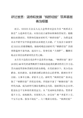 研讨发言:坚持和发展枫桥经验筑牢基层善治根基近日,XXXXXX在北京人民大会堂亲切会见全国枫桥式工作法入选单位代表,向他们表示诚挚问候和热烈祝贺,勉励他们再接再厉,坚持和发展好新时代枫桥经验,为推进更高水平的平安中国建设作出新的更大贡献。广大党员干部要牢记XXXXXX的殷殷嘱托,细细咀嚼品读新时代枫桥经验的深刻意蕴和丰富内涵,起而行之,投身实践大熔炉,脚踏实地走好基层治理新时代赶考之路。从生生不息的历史沿革中品读善治内涵。枫桥经验源于20世纪60年代初诸暨枫桥干部群众创造的化解矛盾的工作方法,其内涵是坚持和贯彻党的群众路线,在党的领导下,充分发动群众、组织群众、依靠群众解决群众自己的事情,做到小事不出村、大事不出镇、矛盾不上交。新时代枫桥经验继承弘扬了枫桥经验的优良传统,并创新丰富了枫桥经验的时代内涵,成为新时代预防化解社会风险、创新基层社会治理、促进社会平安和谐的重要法宝。从发动和依靠群众,坚持矛盾不上交,就地解决;实现捕人少,治安好到矛盾不上交,平安不出事,服务不缺位,六十载薪火相传,枫桥经验经过时代洗礼,历久弥新,焕发出强大的生命力。新时代枫桥经验的优势在党建,力量源泉在基层。坚持发展新时代枫桥经验,要正确处理变与不变的辩证关系,始终紧紧抓牢党的领导这一基层治理的制胜密钥,充分发挥基层党组织组织力、凝聚力、号召力,注重选好基层党组织带头人,加大村(社区)年轻党员、后备干部培养力度,注重整顿软弱涣散党组织,因村施策、集中整顿,实现后进变先进;注重加强对党员的教育培训,发挥好党员的模范带头作用,使基层党组织建设与基层治理有机衔接、良性互动,通过政治领导、组织引领、能力引领、机制引领,以党的建设贯穿基层治理、保障基层治理、引领基层治理,使枫桥经验在新时代焕发新风采。从初心不改的民本情怀中品味善治内涵。善治须达情,达情始近人。不论时代如何发展,以民为本是枫桥经验核心思想,也是最鲜明的特征。一切为了群众、一切依靠群众是以民为本的精神要义,也是枫桥经验的出发点和落脚点。广大基层干部要始终坚持群众想什么,我们就干什么,把保障和改善民生放在突出位置,着眼于解决人民群众最关心、最直接、最现实的利益问题,使人民群众有更多的获得感、幸福感、安全感、认同感。要不断创新做群众工作的体制机制和方式方法,从传统群众工作方法向现代群众工作方法转变,通过深入推动8+基层社会治理工作走深走实,用心用情用力把工作做到群众的心坎上,确保入格联户、联寺包僧、结对关爱、企业包联、支部联建全覆盖,用实际行动赢得群众认可。要推动三务公开落到实处,规范小微权力运行,深化四议两公开一监督,保障群众的知情权、参与权、决策权和监督权,最大限度调动群众参与社会治理的能动性、创造性,充分发挥群众自我管理、自我监督、自我教育的力量,鼓励广大人民群众在基层治理中发挥实践主体作用,真正成为矛盾化解和基层自治的主人翁和主力军,做到社会治理过程让群众参与、成效让群众评判、成果让群众共享。从笃行不怠的探索创新中品味善治内涵。XXXXXX曾批示强调:适应时代要求,创新群众工作方法,善于运用法治思维和法治方式解决涉及群众切身利益的矛盾和问题,把枫桥经验坚持好、发展好。创新是枫桥经验永葆生机的不竭动力,随着时代变迁,基层工作不断面临新问题新挑战新压力,这就要求广大基层干部必须与时俱进、立足现实,努力将枫桥经验精髓与本土特色融合升华,总结固化成功做法,在创新制度、健全机制中丰富枫桥经验的内涵。要坚持以善治为目标,加大自治、法治、德治、智治四治融合体系建设,在坚持和发展新时代枫桥经验中,走出一条符合实际的新路子。要注重自治为基,不断健全以群众自治组织为主体、社会各方广泛参与的新型村(社区)治理体系,把更多基层事务决策权交给群众,促进民事民议、民事民办、民事民管。注重法治为纲,善于运用法治思维和法治方式解决工作中的新情况、新问题,着力体现公平正义,彰显公信力,构建奉法善治工作良序。注重德治为本,强化德治的引领作用,大力弘扬社会主义核心价值观,通过乡贤、道德榜样、村规民约、家训家风、生活礼俗的教化作用,促进形成文明和谐的社会风尚。注重智治为要,善于向科技借力,依托数字化手段赋能基层网格体系建设运行,不断拓展网上公共服务领域和内容,以网格智治小单元撬动基层社会大治理。