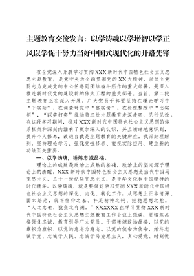 主题教育交流发言:以学铸魂以学增智以学正风以学促干努力当好中国式现代化的开路先锋在全党深入开展学习贯彻XXX新时代中国特色社会主义思想主题教育,是党中央为全面贯彻党的XX大精神、动员全党同志为完成党的中心任务而团结奋斗所作的重大部署,是深入推进新时代党的建设新的伟大工程的重大部署。当前,第二批主题教育正在深入开展,广大党员干部要坚持在理论学习中下实功、在调查研究中察实情、在检视整改中出实招,以实打实推动第二批主题教育走深走实、见行见效。在这段学习期间,我对XXX新时代中国特色社会主义思想的体系框架和深刻内涵有了更加深入的认识,并且清晰地意识到,提升个人修养,改进自我是主题教育的关键所在。我深刻理解到,坚持理论学习、强化党性修养、重视实际应用、建立新的功绩至关重要。一、以学铸魂,锤炼忠诚品格。理论上的成熟是政治上成熟的基础,政治上的坚定源于理论上的清醒。XXX新时代中国特色社会主义思想是当代中国马克思主义、二十一世纪马克思主义,是中华文化和中国精神的时代精华。以学铸魂,就是要做好学习贯彻XXX新时代中国特色社会主义思想的深化、内化、转化工作,从思想上正本清源、固本培元,筑牢信仰之基、补足精神之钙、把稳思想之舵。人之忠也,犹鱼之有渊。XXXXXX在学习贯彻XXX新时代中国特色社会主义思想主题教育工作会议上强调,要锤炼品格强化忠诚,教育引导广大党员、干部锤炼政治品格,以党的旗帜为旗帜、以党的意志为意志、以党的使命为使命,始终忠诚于党、忠诚于人民、忠诚于马克思主义,真心爱党、时刻忧党、坚定护党、全力兴党。立学以读书为本,结合主题教育的要求,践行读书班学习计划,持续不断地通过个人自学、集体研讨、现场体验等多种方式,将理论学习渗透于日常工作之中。其次,要不断提升党性修养,始终坚守共产党员的初心与使命,确保在任何情况下与党同心、同德。通过学习XXX新时代中国特色社会主义思想,坚定理想信念,从思想上淬炼党性,将两个维护体现在实际行动之中。最后,要提高政治忠诚水平,深刻认识XXX新时代中国特色社会主义思想所蕴含的深厚理论力量、实践力量和人格力量,以此铸魂立心,强化政治觉悟和为民服务宗旨。二、以学增智,提升专业素养。XXXXXX强调:以学增智,就是要从党的科学理论中悟规律、明方向、学方法、增智慧,把看家本领、兴党本领、强国本领学到手。这就要求我们把握好XXX新时代中国特色社会主义思想的世界观和方法论,坚持和运用好其中的立场、观点、方法,尤其是其中蕴含的领导方法、思想方法、工作方法,以此解决问题、推动工作,提高履职尽责能力水平,努力创造经济社会发展的新成就,为人民群众谋得更大的福祉。业精于勤荒于嬉,行成于思毁于随,科学的思维能力,是推动工作的源头活水,思维一旦局限,就无法打开格局,无法看到问题的整体样貌,陷入不知山高,不知地厚的困境。广大青年干部应时常自省是否做到多思考、勤思考、善思考,是否站得高、观得远、谋得深,走出坐而论道的舒适圈,在洞察局势中起而行之,在学思践悟中将XXX新时代中国特色社会主义思想的世界观、方法论和贯穿其中的立场观点方法内化于心、外化于行,用七种思维能力提升工作的灵活普适,促进举措的精准发力,在见微知著中练就致广大而尽精微的本领。三、以学促干,推进落实效能。XXXXXX强调,各级党组织要教育引导党员、干部落实重实践要求,坚持学思用贯通、知信行统一,匡正干的导向,增强干的动力,形成干的合力,在以学促干上取得实实在在的成效。年轻干部生逢其时、使命在肩,须永葆想干事的自觉、增强能干事的本领、锤炼干成事的作风,走在前列、作出表率、争当模范,坚决扛起新时代新征程的新担当。绳短不能汲深井,浅水难以负大舟。无论干事创业还是攻坚克难,都需要高超本领和技艺。只有肩膀够硬、能力够强、底气够足,才能扛得起重活,打得了硬仗,经得住磨难。当以主题教育为契机,多向实践学,多在干中学,着力锤炼政治能力、调查研究能力、科学决策能力、改革攻坚能力、应急处突能力、群众工作能力、抓落实能力。加强自我磨砺,审时度势、因势利导,开拓创新,切不可凭借老经验、旧套路去主观臆断、胡乱应付,抑或是拈轻怕重不吃苦、躺平甩锅去躲事儿。大道至简,实干为要;责重若山,行胜于言。要把实干担当扛在肩上,以满格状态主动融入改革发展大局,在易中思难难中求进,适应新时代去思考、依据新实践去谋划、按照新要求去落实,真正把钉钉子精神坚持好、发扬好。四、以学正风,塑造优良形象。以学正风既是学习贯彻XXX新时代中国特色社会主义思想主题教育的重要内容,也是确保主题教育取得实效的重要保证。党员干部要深入学习领会XXXXXX关于以学正风的重要论述,在以学正风中照镜子正衣冠,淬炼实干之风,当