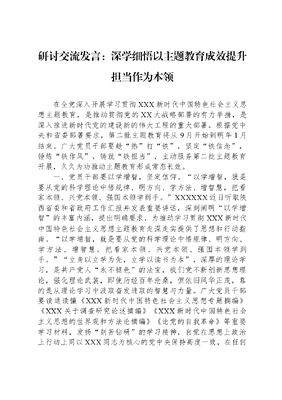研讨交流发言:深学细悟以主题教育成效提升担当作为本领在全党深入开展学习贯彻XXX新时代中国特色社会主义思想主题教育,是推动贯彻党的XX大战略部署的有力举措,是深入推进新时代党的建设新的伟大工程的重大部署。根据党中央和省委部署要求,第二批主题教育将从9月开始到明年1月结束。广大党员干部要趁热打铁,坚定铁信念,锤炼铁作风,铸就铁担当,主动服务第二批主题教育开展,久久为功推动主题教育形成常态长效。一、党员干部要以学增智,坚定信仰。以学增智,就是要从党的科学理论中悟规律、明方向、学方法、增智慧,把看家本领、兴党本领、强国本领学到手。XXXXXX近日听取陕西省委和省政府工作汇报并发表重要讲话,深刻阐明以学增智的丰富内涵,提出明确要求,为推动学习贯彻XXX新时代中国特色社会主义思想主题教育走深走实提供了思想和行动指南。以学增智,就是要从党的科学理论中悟规律、明方向、学方法、增智慧,把看家本领、兴党本领、强国本领学到手。立身以立学为先,立学以读书为本,深厚的理论学习,是共产党人永不褪色的法宝,我们党不断创新思想理论,强化理论武装,即使历经百年沧桑,但依旧风华正茂,靠的是从理论学习中汲取奋发进取的智慧与力量。广大党员干部要读通读懂《XXX新时代中国特色社会主义思想专题摘编》《XXX关于调查研究论述摘编》《XXX新时代中国特色社会主义思想的世界观和方法论摘编》《论党的自我革命》等重要学习材料,发扬刻苦钻研的学习精神,自觉在思想上政治上行动上同以XXX同志为核心的党中央保持高度一致,在任何时候任何情况下都能不畏浮云遮望眼乱云飞渡仍从容,坚定信仰不动摇。二、党员干部要以学促干,铸就担当。XXXXXX近日在江苏考察时强调,主题教育开展以来,各地区各部门各单位全面抓深抓实各项重点措施,取得较好效果。各级党组织要教育引导党员、干部落实重实践要求,坚持学思用贯通、知信行统一,匡正干的导向,增强干的动力,形成干的合力,在以学促干上取得实实在在的成效。知是基础、是前提,行是重点,是关键。党员干部要拧紧总开关、把好方向盘、沾满泥土香。大道至简,实干为要。党员干部要立足全局、放眼长远,以愚公移山的志气、滴水穿石的毅力,脚踏实地,埋头苦干,坚持在刀上磨、事上练,在实干中增长本领、奋发有为,练就干事创业的钢筋铁骨。要树牢为民造福的政绩观,厚植人民情怀,实打实做事,虚心向群众学习、真心对群众负责、热心为群众服务,以实干实绩向人民群众交出满意答卷。要一以贯之抓落实,沉入基层一线,弄清楚群众关心什么、需要什么,做人民群众的知心人,真正把情况摸清、把问题找准、把对策提实,把每一件民生小事都做实做优,以真抓实干、干在实处提升服务的质量,干出实实在在的成效;要结合实际,把惠民生的事办实、暖民心的事办细、顺民意的事办好,在千丝万缕的基层琐事中找准矛盾的线头,抽丝剥茧为群众化解问题、解开心结,永葆初心本色。三、党员干部要以学正风,锤炼作风。XXXXXX指出,主题教育要努力在以学铸魂、以学增智、以学正风、以学促干方面取得实实在在的成效。以学正风,要深入学习领会XXX新时代中国特色社会主义思想,从中汲取勇于自我革命的勇气和动力,保持永远在路上的韧劲,永远吹响冲锋号,坚持以严的基调强化正风肃纪,擦亮新时代中国共产党人廉洁奉公的良好形象。广大党员干部要认真学习XXXXXX关于严明政治纪律和政治规矩的一系列重要论述,牢固权为民所赋,权为民所用的思想观念,树立正确的权力观、政绩观、事业观,坚决反对各种特权思想和特权现象,始终做到心中高悬纪法明镜、手上紧握纪法戒尺,守好廉洁用权底线,堂堂正正做人、干干净净做事、清清白白为官;常怀律己之心、常修为政之德、常思贪欲之害、常除非分之想,不断提高政治判断力、政治领悟力、政治执行力,进一步深刻领悟两个确立的决定性意义,增强四个意识、坚定四个自信、做到两个维护,自觉做到守规矩、知敬畏、明底线、作表率,共同把党锻造成一块攻无不克、战无不胜的坚硬钢铁。