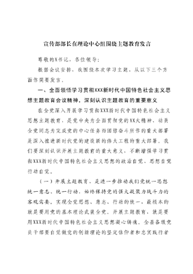 宣传部部长在理论中心组围绕主题教育发言尊敬的X书记,各位领导:根据会议安排,我围绕本次学习主题,从以下三个方面作简要发言。一、全面领悟学习贯彻XXX新时代中国特色社会主义思想主题教育会议精神,深刻认识主题教育的重要意义在全党深入开展学习贯彻XXX新时代中国特色社会主义思想主题教育,是党中央为全面贯彻党的XX大精神、动员全党同志为完成党的中心任务而团结奋斗所作的重大部署是深入推进新时代党的建设新的伟大工程的重大部署。我们要深刻认识开展主题教育的重大意义,不断增强学习贯彻XXX新时代中国特色社会主义思想的政治自觉、思想自觉行动自觉。(一)开展主题教育,是进一步推动我们党统一思想统一意志、统一行动,始终保持党的强大凝聚力战斗力的客观需要。实现全党思想、意志、行动的统一,最根本的就是要用党的基本理论武装全党。开展主题教育,就是要用XXX新时代中国特色社会主义思想凝心铸魂。全县各级党员干部要自觉做党的创新理论的坚定信仰者和忠实践行者筑牢信仰之基、补足精神之钙、把稳思想之舵,忠诚捍卫两个确立,坚决做到两个维护,矢志不渝沿着XXXXXX指引的方向奋勇前进。(二)开展主题教育,是进一步激励党员干部勇于担当、勇于创新、勇于争先,不断开创X事业发展新局面的客观需要。伟大成就是拼出来、干出来的,实现X高质量发展迫切需要全县广大党员干部提高本领、担当作为。开展主题教育,就是要教育引导广大党员干部学思想、见行动,不断提高推动X高质量发展本领、服务群众本领、防范化解风险本领,巩固良好发展势头,加快补齐短板弱项,进一步提振锐意进取、担当作为的精气神。(三)开展主题教育,是进一步强化管党治党严的基调、严的措施、严的氛围,持续营造风清气正政治生态的客观需要。全面从严治党永远在路上,党的自我革命永远在路上。开展主题教育,就是要教育引导各级党组织和广大党员干部坚持问题导向、接受政治体检、打扫政治灰尘纠正行为偏差,解决思想不纯、组织不纯方面存在的突出问题,不断增强自我净化、自我完善、自我革新、自我提高能力,永葆党的先进性和纯洁性。二、精准把握学习贯彻XXX新时代中国特色社会主义思想主题教育总要求,扎实开展好主题教育宣传工作我们要精准把握学思想、强党性、重实践、建新功的总要求,抓实抓细主题教育各项重点措施,有机融合、一体推进。作为宣传思想文化系统党员干部,在做好理论学习、调查研究、推动高质量发展、检视整改的同时要着力在做好学习贯彻XXX新时代中国特色社会主义思想主题教育宣传工作上下功夫、出实效。(一)要准确把握主题教育宣传重点。做好主题教育宣传工作,要牢牢把握好正确的政治方向、舆论导向、价值取向,深入宣传阐释XXXXXX关于主题教育的重要讲话和重要指示批示精神,宣传党中央决策部署、省委和州委工作安排、县委具体要求,要宣传主题教育的重大意义和部署要求,充分报道主题教育的进展成效和典型经验,讲好X县开展学习贯彻XXX新时代中国特色社会主义思想主题教育的生动故事,引导全县各级党员干部深刻领悟两个确立的决定性意义,增强四个意识、坚定四个自信、做好两个维护,为全面建设社会主义现代化X而努力奋斗。(二)要着重在如何宣传上下功夫。一是办好专题专栏,发挥学习贯彻XXX新时代中国特色社会主义思想主题教育专题和学思想、强党性、重实践、建新功专栏作用,综合运用各种方式方法和手段,做好主题教育宣传二是要强化宣传引导,紧密结合主题教育工作进展情况,组织上报一批高质量新闻宣传稿件和理论文章,用好X电视台和X应急广播推出专题节目,做好重点报道和深度解读;三是抓实理论宣传,推出一批生动鲜活的精品栏目、节目文章等,扎实抓好全县主题教育理论学习、宣传宣讲工作的宣传报道,助力党的创新理论飞入寻常百姓家。(三)要严把主题教育宣传审核关。主题教育宣传工作是一项重大政治任务,要增强政治敏锐性,保持庄重热烈、平实朴实的主题教育宣传报道基调,把准节奏,区分各阶段重点抓好宣传。要加强新媒体平台及政务新媒体管理,不给错误言论提供传播渠道。统筹引导和调控,制定舆情应急预案,建立舆情预警机制,实时监测研判,快速处置回应关切,正面引导网上舆论,确保舆情平稳可控。要把准正确方向,严肃宣传纪律,严格审编刊发工作流程认真落实新闻稿件三审三校制度,坚决防止低级红高级黑。三、着力做好主题教育为民办实事,奋力推动X高质量发展这次主题教育的根本任务是坚持学思用贯通、知信行统一,把XXX新时代中国特色社会主义思想转化为坚定理想锤炼党性和指导实践、推动工作的强大力量,使全党始终保持统一的思想、坚定的意志、协调的行动、强大的战斗力,努力在以学铸魂、以学增智、以学正风、以学促干方面取得实实在在的成效。我们要紧紧围绕主题教育根本任务,真抓实干、务求实效,聚焦问题、知难而进,要牢固树立以人民为中心的发展