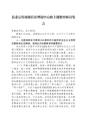 县委宣传部部长在理论中心组主题教育研讨发言尊敬的书记,各位领导:根据会议安排,我围绕本次学习主题,从以下三个方面作简要发言。一、全面领悟学习贯彻XXX新时代中国特色社会主义思想主题教育会议精神,深刻认识主题教育的重要意义在全党深入开展学习贯彻XXX新时代中国特色社会主义思想主题教育,是党中央为全面贯彻党的XX大精神、动员全党同志为完成党的中心任务而团结奋斗所作的重大部署,是深入推进新时代党的建设新的伟大工程的重大部署。我们要深刻认识开展主题教育的重大意义,不断增强学习贯彻XXX新时代中国特色社会主义思想的政治自觉、思想自觉、行动自觉。(一)开展主题教育,是进一步推动我们党统一思想、统一意志、统一行动,始终保持党的强大凝聚力战斗力的客观需要。实现全党思想、意志、行动的统一,最根本的就是要用党的基本理论武装全党。开展主题教育,就是要用XXX新时代中国特色社会主义思想凝心铸魂。全县各级党员干部要自觉做党的创新理论的坚定信仰者和忠实践行者,筑牢信仰之基、补足精神之钙、把稳思想之舵,忠诚捍卫两个确立,坚决做到两个维护,矢志不渝沿着XXXXXX指引的方向奋勇前进。(二)开展主题教育,是进一步激励党员干部勇于担当、勇于创新、勇于争先,不断开创事业发展新局面的客观需要。伟大成就是拼出来、干出来的,实现我县高质量发展,迫切需要全县广大党员干部提高本领、担当作为。开展主题教育,就是要教育引导广大党员干部学思想、见行动,不断提高推动我县高质量发展本领、服务群众本领、防范化解风险本领,巩固良好发展势头,加快补齐短板弱项,进一步提振锐意进取、担当作为的精气神。(三)开展主题教育,是进一步强化管党治党严的基调、严的措施、严的氛围,持续营造风清气正政治生态的客观需要。全面从严治党永远在路上,党的自我革命永远在路上。开展主题教育,就是要教育引导各级党组织和广大党员干部坚持问题导向、接受政治体检、打扫政治灰尘、纠正行为偏差,解决思想不纯、组织不纯方面存在的突出问题,不断增强自我净化、自我完善、自我革新、自我提高能力,永葆党的先进性和纯洁性。二、精准把握学习贯彻XXX新时代中国特色社会主义思想主题教育总要求,扎实开展好主题教育宣传工作我们要精准把握学思想、强党性、重实践、建新功的总要求,抓实抓细主题教育各项重点措施,有机融合、一体推进。作为宣传思想文化系统党员干部,在做好理论学习、调查研究、推动高质量发展、检视整改的同时,要着力在做好学习贯彻XXX新时代中国特色社会主义思想主题教育宣传工作上下功夫、出实效。(一)要准确把握主题教育宣传重点。做好主题教育宣传工作,要牢牢把握好正确的政治方向、舆论导向、价值取向,深入宣传阐释XXXXXX关于主题教育的重要讲话和重要指示批示精神,宣传党中央决策部署、省委和州委工作安排、县委具体要求,要宣传主题教育的重大意义和部署要求,充分报道主题教育的进展成效和典型经验,讲好县开展学习贯彻XXX新时代中国特色社会主义思想主题教育的生动故事,引导全县各级党员干部深刻领悟两个确立的决定性意义,增强四个意识、坚定四个自信、做好两个维护,为全面建设社会主义现代化而努力奋斗。(二)要着重在如何宣传上下功夫。一是办好专题专栏,发挥学习贯彻XXX新时代中国特色社会主义思想主题教育专题和学思想、强党性、重实践、建新功专栏作用,综合运用各种方式方法和手段,做好主题教育宣传;二是要强化宣传引导,紧密结合主题教育工作进展情况,组织上报一批高质量新闻宣传稿件和理论文章,用好电视台和应急广播推出专题节目,做好重点报道和深度解读;三是抓实理论宣传,推出一批生动鲜活的精品栏目、节目、文章等,扎实抓好全县主题教育理论学习、宣传宣讲工作的宣传报道,助力党的创新理论飞入寻常百姓家。(三)要严把主题教育宣传审核关。主题教育宣传工作是一项重大政治任务,要增强政治敏锐性,保持庄重热烈、平实朴实的主题教育宣传报道基调,把准节奏,区分各阶段重点抓好宣传。要加强新媒体平台及政务新媒体管理,不给错误言论提供传播渠道。统筹引导和调控,制定舆情应急预案,建立舆情预警机制,实时监测研判,快速处置回应关切,正面引导网上舆论,确保舆情平稳可控。要把准正确方向,严肃宣传纪律,严格审编刊发工作流程,认真落实新闻稿件三审三校制度,坚决防止低级红高级黑。三、着力做好主题教育为民办实事,奋力推动我县高质量发展这次主题教育的根本任务是坚持学思用贯通、知信行统一把XXX新时代中国特色社会主义思想转化为坚定理想、锤炼党性和指导实践、推动工作的强大力量,使全党始终保持统一的思想、坚定的意志、协调的行动、强大的战斗力,努力在以学铸魂、以学增智、以学正风、以学促干方面取得实实在在的成效。我们要紧紧围绕主题教育根本任务,真抓实干、务求实效,聚焦问题、知难而进,要牢固树立