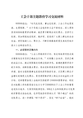 工会干部主题教育学习交流材料XXXXXX指出:时代在发展,事业在创新,工会工作也要发展、也要创新。对于各级工会组织和工会干部而言,深入贯彻落实XXXXXX重要讲话精神,就是要不断顺应时代要求,坚持守正创新,更加积极地实现好、维护好、发展好广大职工群众的合法权益,更好地凝人心、聚合力,不断在铁路高质量发展的实践中展示工会的担当作为。一、必须坚持正确方向XXXXXX指出:工会工作做得好不好、有没有取得明显成效关键看有没有坚持正确政治方向。对铁路工会来讲,坚持正确的政治方向,就必须紧跟党的理论创新步伐,准确把握贯穿其中的方向性、战略性重点要求,结合实际积极探索贯彻落实的思路举措。面对当前铁路事业发展的新形势新任务,以及职工群众日益增长的物质文化需求,要实现好维护职工群众合法权益的工作目标,迫切需要各级工会组织坚持把学习XXXXXX重要讲话,特别是对铁路工作的重要指示批示与学习XXXXXX关于工会工作的重要论述结合起来,与落实XX集团党组、XXX总工会和XX集团公司党委的部署要求结合起来,在学思践悟中深刻认识两个确立的决定性意义,进一步增强四个意识、坚定四个自信、做到两个维护,始终把牢把准住新时代工会工作的正确政治方向二、必须加强制度建设XXXXXX指出:工会要赢得职工群众信赖和支持,必须做好维护职工群众切身利益工作,促进社会公平正义。对各级工会组织来讲,要承担起维护职工群众切身利益,就必须强化制度保障,在坚持好行之有效的工作传统的前提下,坚持创新驱动、抓好顶层设计,不断提高制度建设的科学化、法治化水平,从源头上保障职工群众的各项合法权益。特别是在当前职工群众民主意识、法治意识、权利意识日益增强的新形势下,要善于运用法治思维和法治方式协调劳动关系,推动企业工资支付、工资集体协商、企业民主管理等工作有序运转。同时,要立足于企业发展现状和职工群众需求,从制度层面查找工会组织在参与劳动关系协调、化解劳动关系矛盾,从源头保障职工权益等方面存在的方法老套、效果不佳、观念落后等问题。以改革创新的勇气和智慧转变落后观念,补齐制度短板,革除作风痼疾,创造更加与时俱进更加务实高效的工作机制。三、必须夯实基层基础XXXXXX指出:实现中华民族伟大复兴的中国梦,根本上要靠包括工人阶级在内的全体人民的劳动、创造、奉献。要使中国梦真正同每个职工的个人理想和工作生活紧密结合起来,真正落实到实际行动之中。工会的服务对象在基层,工作主体在基层任务落实靠基层,基层组织作用发挥好不好,是检验工会整体工作成效的重要标准。对铁路企业而言,点多线长、部分岗位流动分散的行业特性,决定其工会组织必须比其他行业的工会组织更加注重把工作的重点、创新的重心放在基层一线,更加认真、扎实地强基固本。因此,铁路各级工会组织要始终自觉把基层作为服务职工、推动发展的主战场,把基层创新作为改进工作、提高实效的突破口,通过激发基层工会组织的生机活力,实现服务更高效、维权更全面、帮扶更到位的工作目标,更好地赢得广大职工群众的信任和支持。四、必须提升服务能力XXXXXX指出:工会干部要加强学习增强本领,努力走在时代前列、走在职工群众前列,在经济社会发展最需要的地方、在企业生产一线、在职工群众的伟大实践中经风雨、见世面,努力把自己锤炼成听党话、跟党走、职工群众信赖的娘家人。进入新时代,新的形势任务不仅对各级工会组织提出了新要求,而且迫切需要各级工会干部与时俱进、转变观念,以更加过硬的政治素质和业务能力,更好地团结动员广大职工投身到企业改革发展的火热实践中。在实践中,要重点提高学习能力、思考能力和落实能力。提高学习能力,就是要深入学习党的创新理论,特别是其中蕴含的科学思想方法和工作方法不断增强干好工作的能力水平。提高思考能力,就是要在学习的过程中,结合实际,下苦功琢磨问题,沉下心研究问题,切实把党的创新理论同企业的发展现状、职工的现实需求结合起来,不断提升工会工作的精准性、实效性、针对性。提高落实能力,就是要在执行上不打折扣、善始善终、善做善成。要在谋划力和执行力的同步提升中,让职工群众真正感受到工会是职工之家工会干部是最可信赖的娘家人。